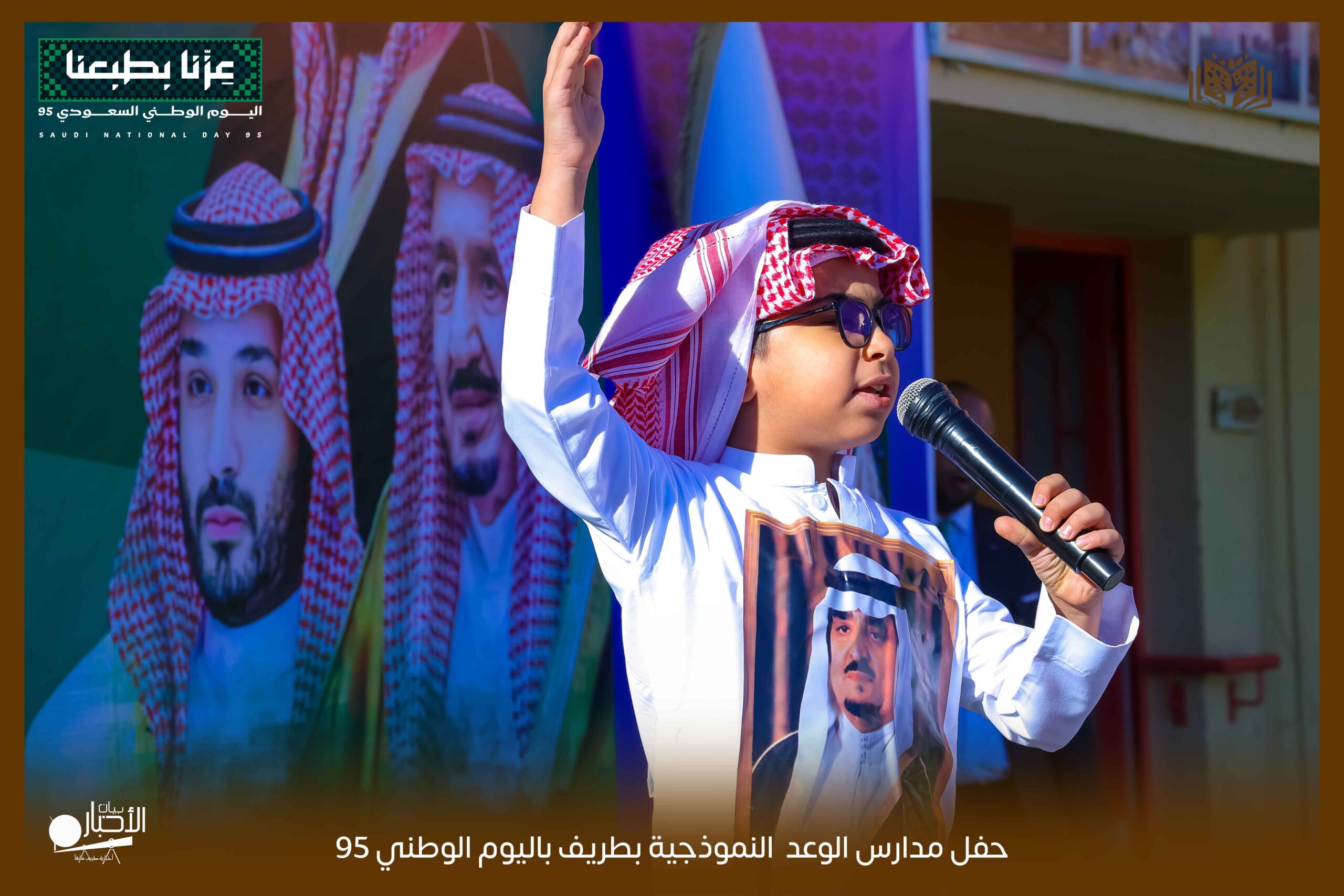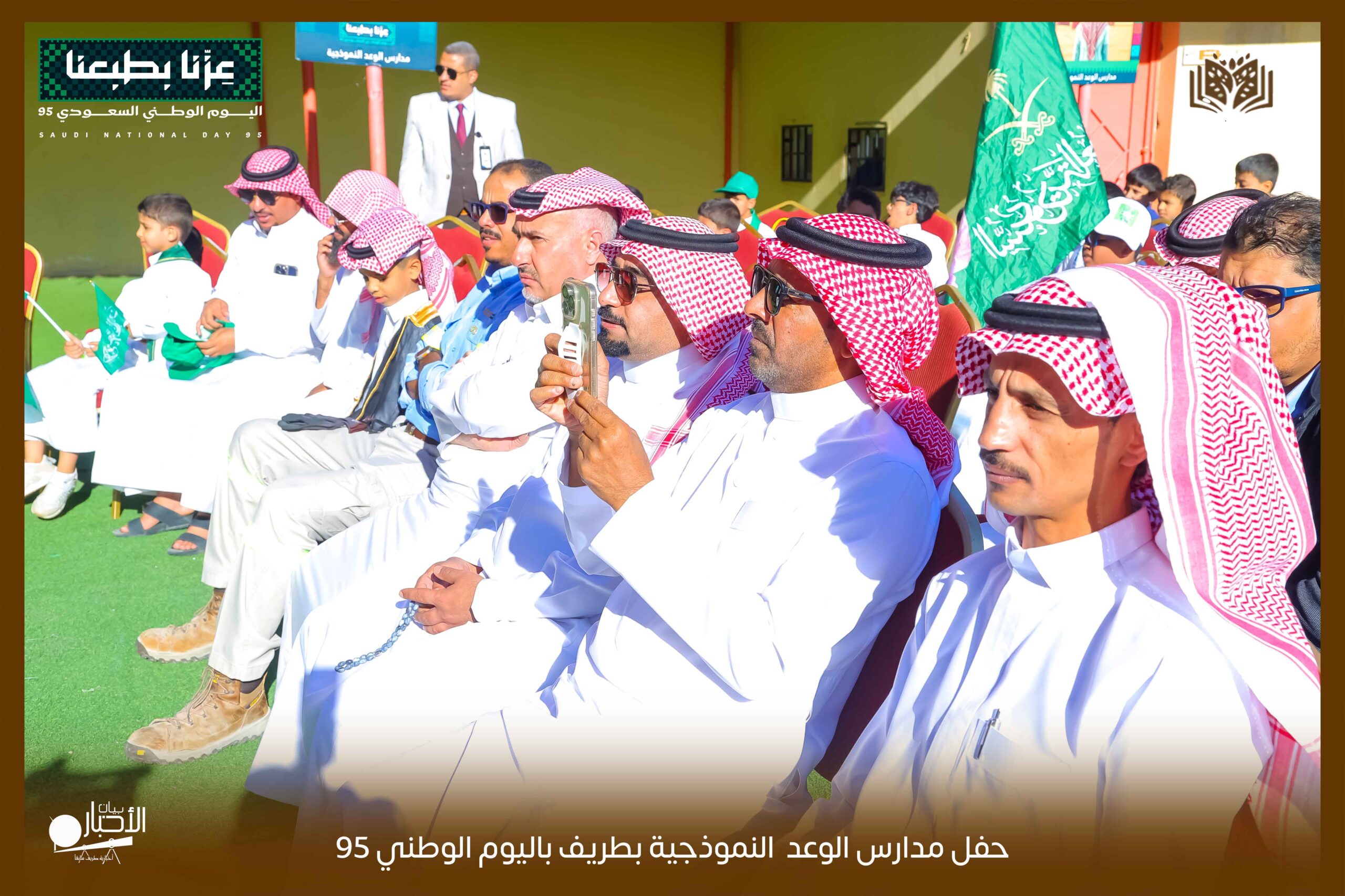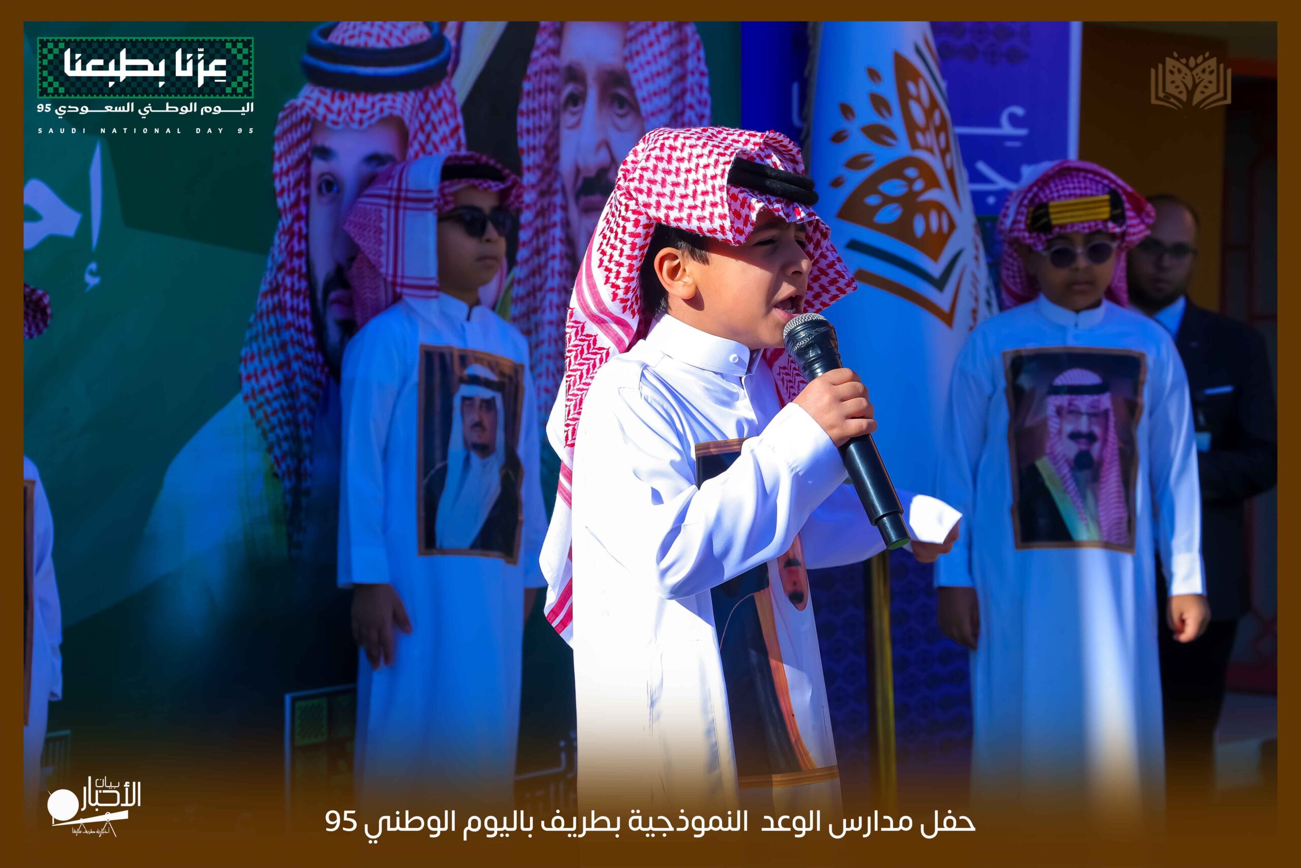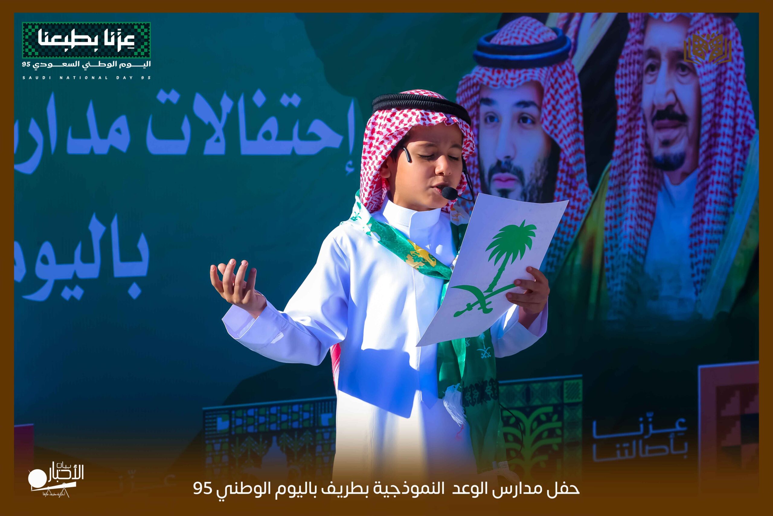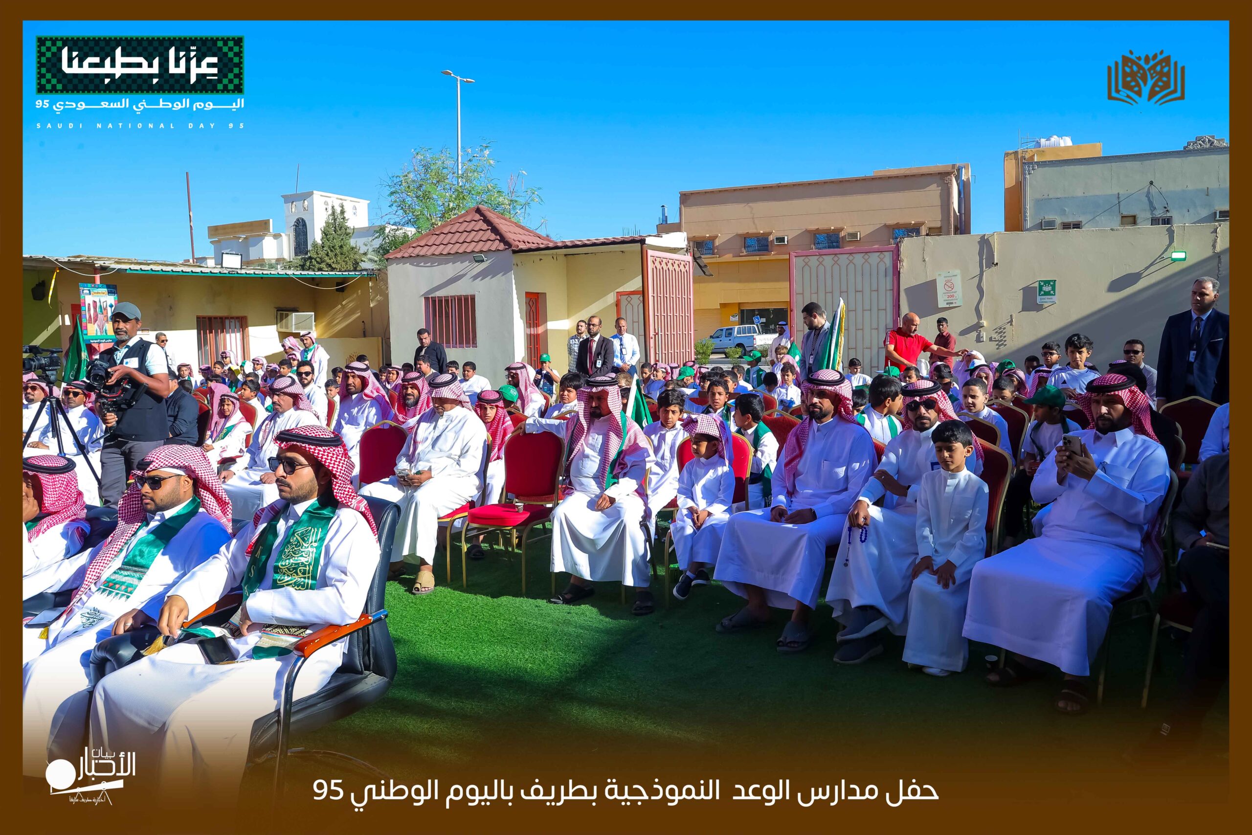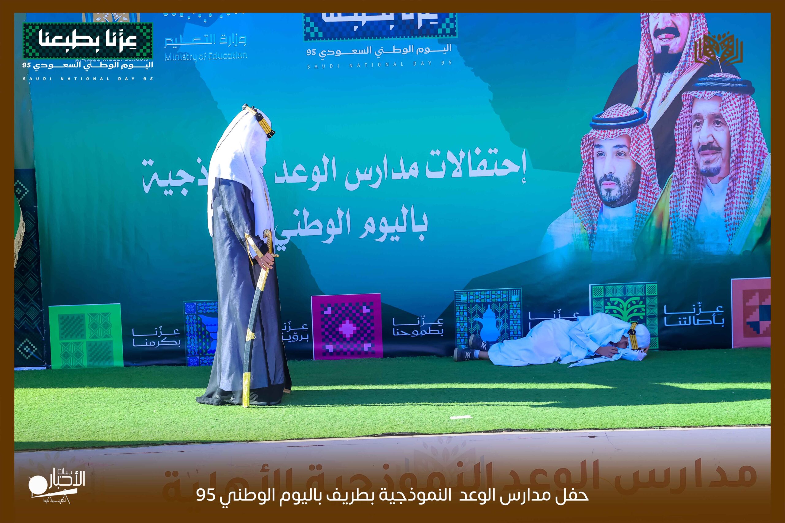 أقامت مدارس الوعد النموذجية الأهلية حفلًا بمناسبة ذكرى( اليوم الوطني السعودي ٩٥ ) ، تلك الذكرى التي تجعلنا نشعر بالاعتزاز والفخر بالانتماء لهذا الوطن العظيم ، حيث بدأ الحفل بعرض السلام الملكي ثم آيات عطرة من الذكر الحكيم ثم كلمة مدير المدرسة الأستاذ إسماعيل صالح العنزي والذي رحب بالسادة الضيوف وأولياء الأمور وتقديم التهنئة للقيادة الحكيمة والشعب السعودي بهذه المناسبة ،ثم تتابعت فقرات الحفل ما بين مشهد لملوك المملكة وعرض مسرحي بعنوان ( عزنا بطبعنا ) ثم فقرة باللغة الإنجليزية في حب الوطن ثم ختم الحفل بأداء الطلاب للعارضة السعودية ٠