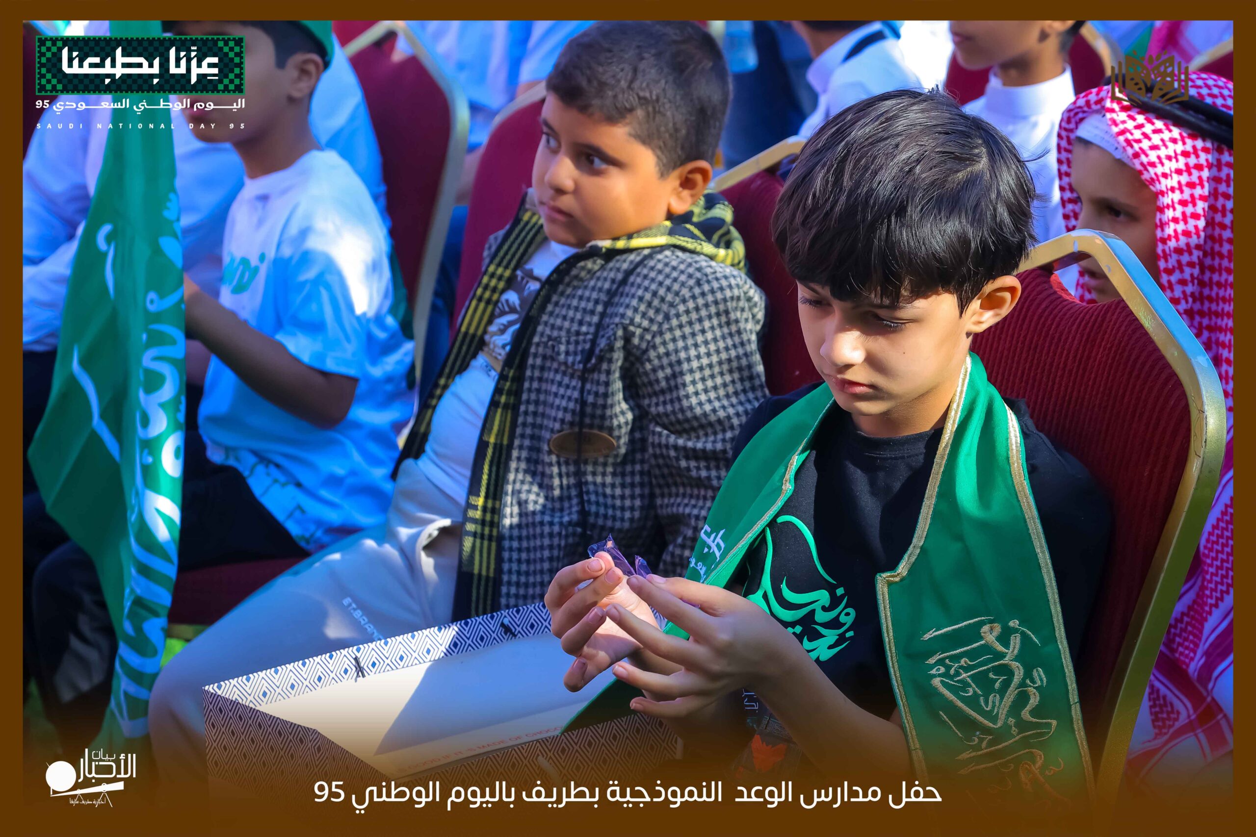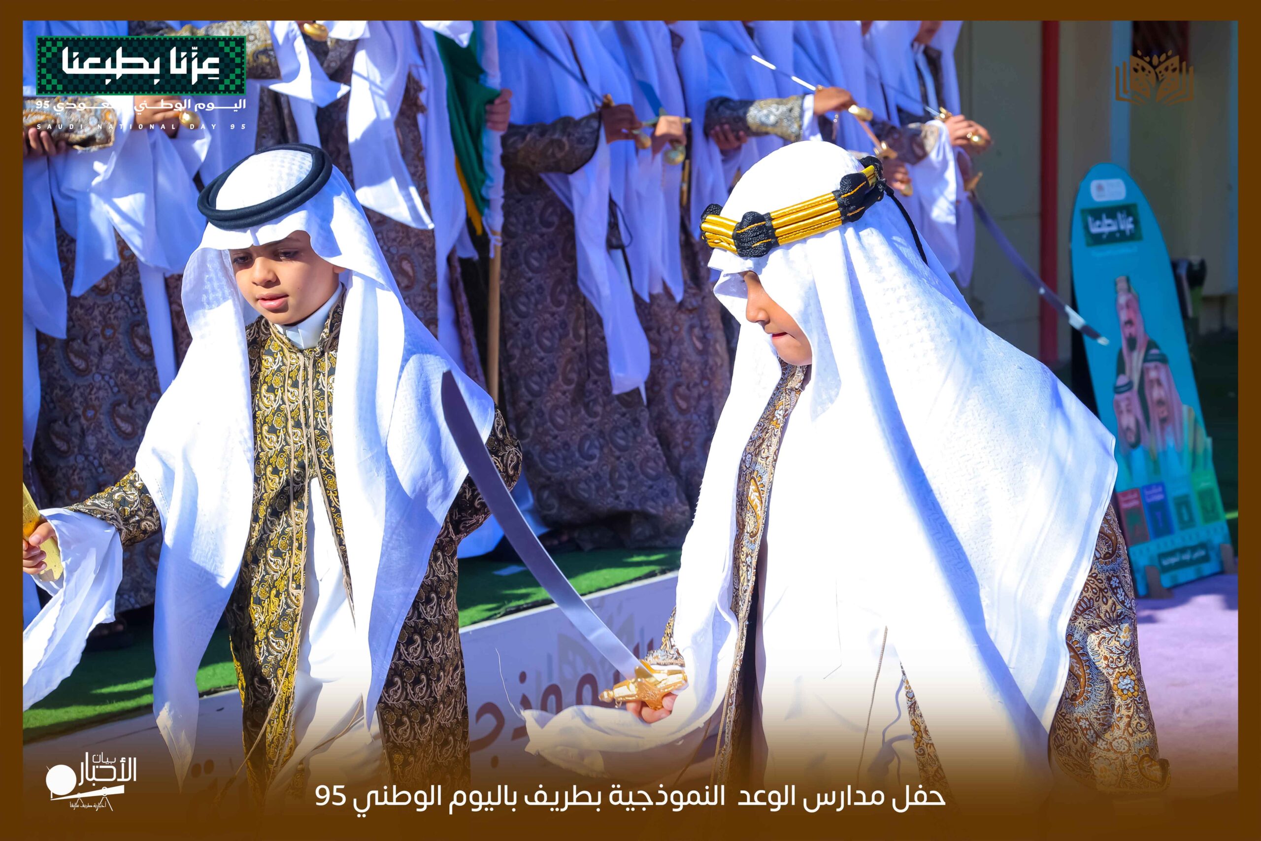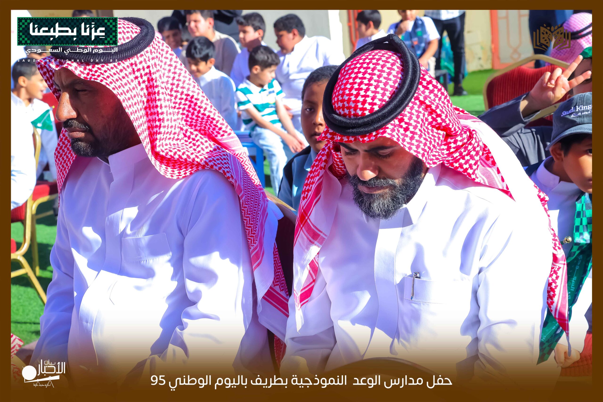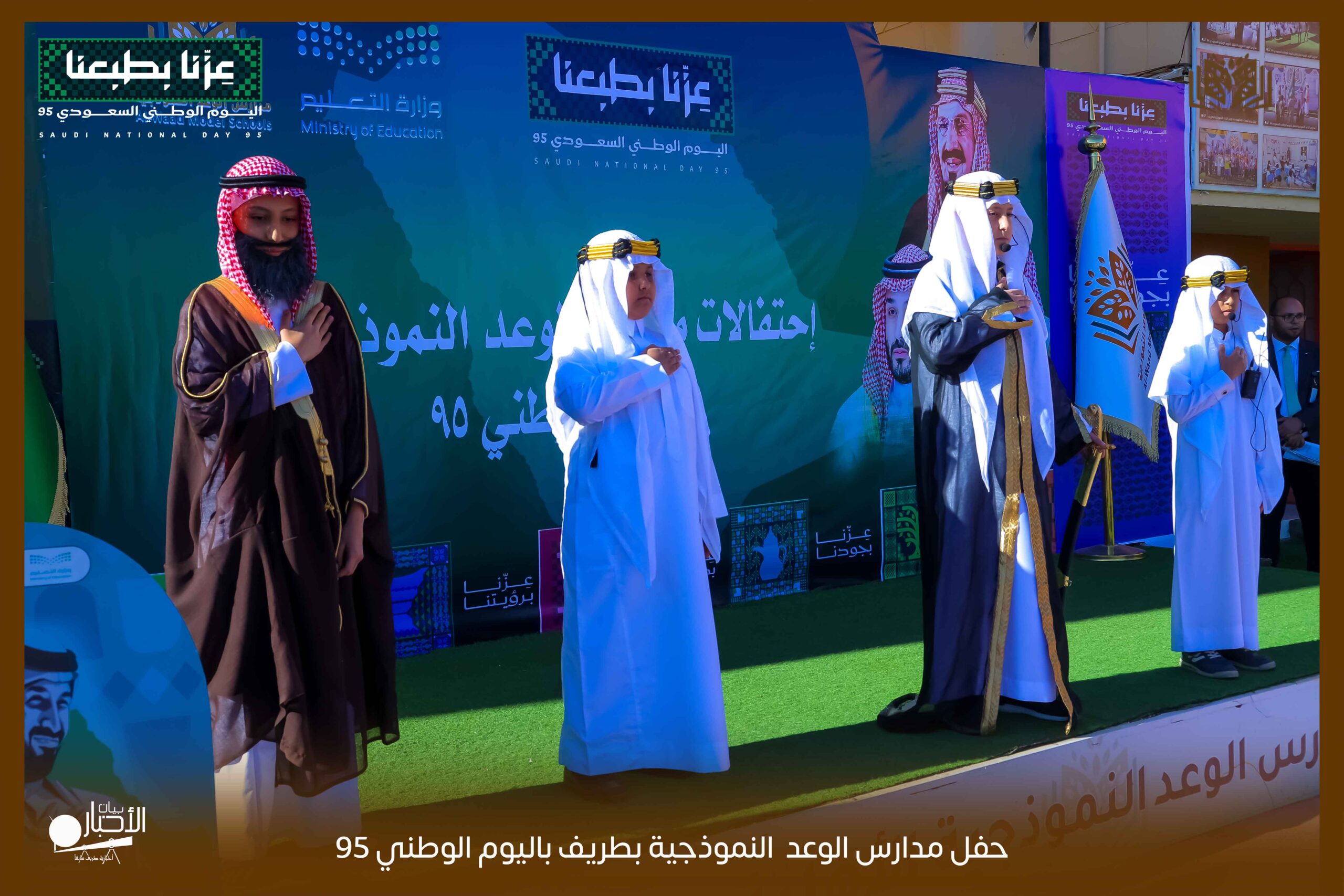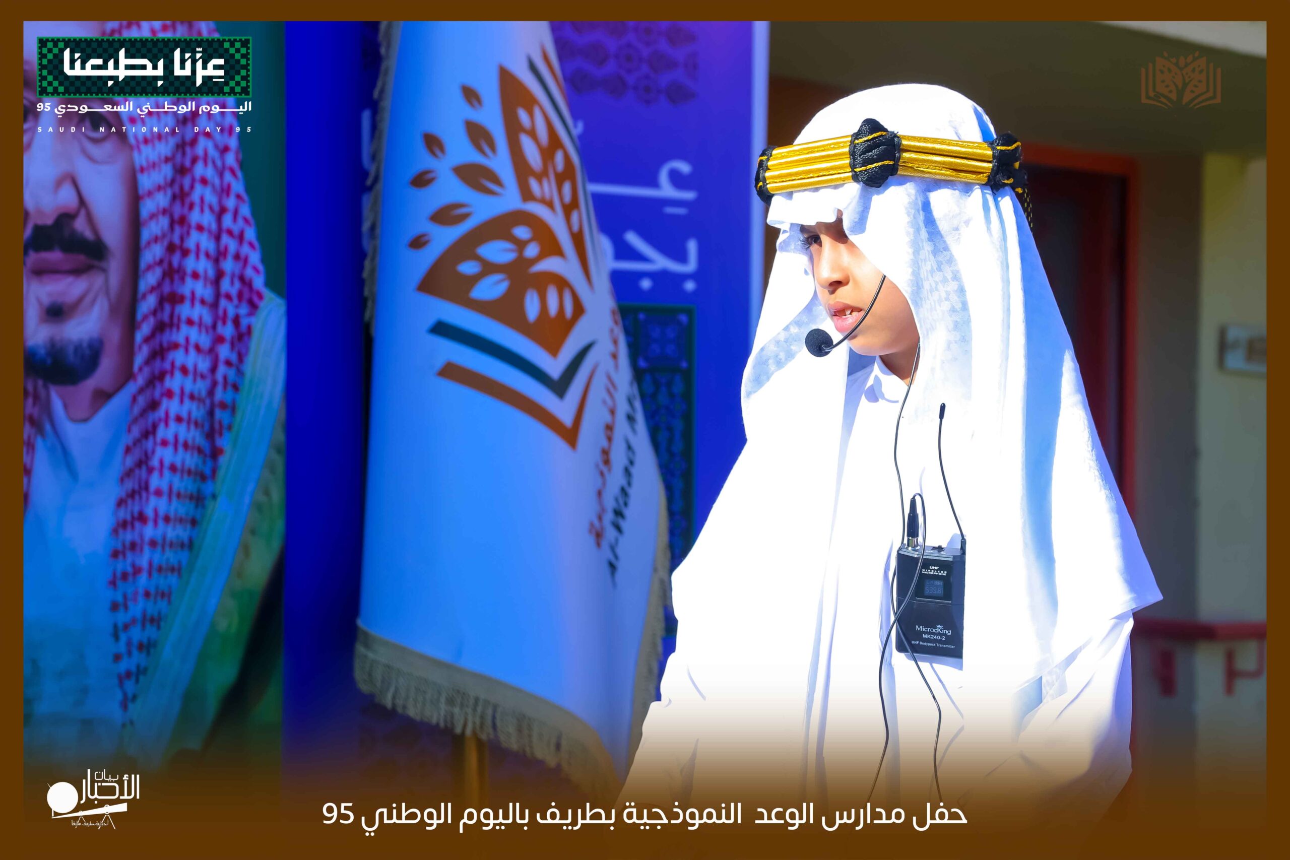أقامت مدارس الوعد النموذجية الأهلية حفلًا بمناسبة ذكرى( اليوم الوطني السعودي ٩٥ ) ، تلك الذكرى التي تجعلنا نشعر بالاعتزاز والفخر بالانتماء لهذا الوطن العظيم ، حيث بدأ الحفل بعرض السلام الملكي ثم آيات عطرة من الذكر الحكيم ثم كلمة مدير المدرسة الأستاذ إسماعيل صالح العنزي والذي رحب بالسادة الضيوف وأولياء الأمور وتقديم التهنئة للقيادة الحكيمة والشعب السعودي بهذه المناسبة ،ثم تتابعت فقرات الحفل ما بين مشهد لملوك المملكة وعرض مسرحي بعنوان ( عزنا بطبعنا ) ثم فقرة باللغة الإنجليزية في حب الوطن ثم ختم الحفل بأداء الطلاب للعارضة السعودية ٠