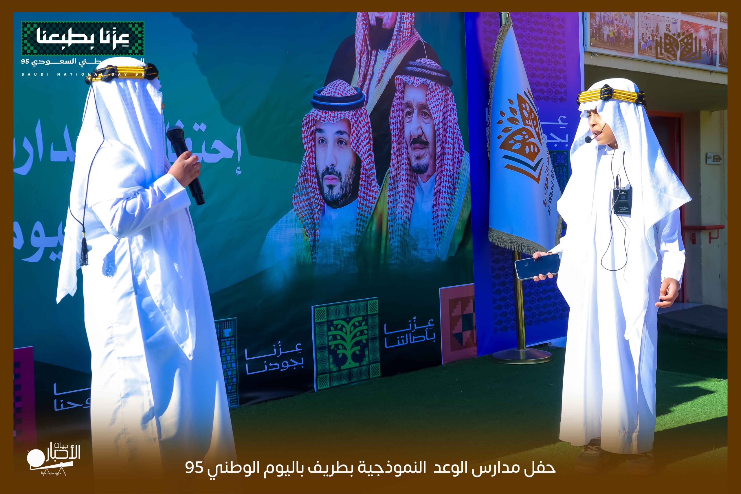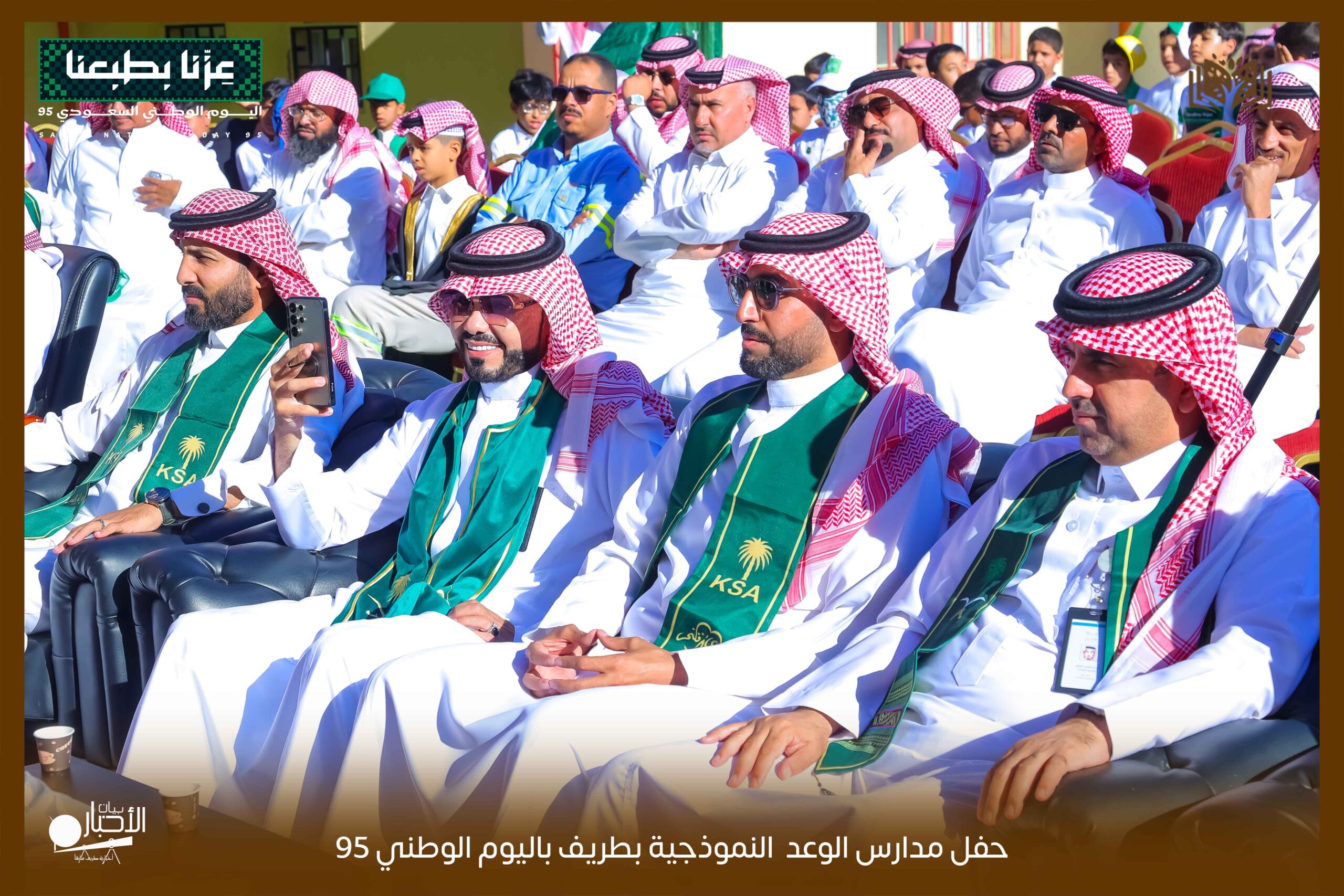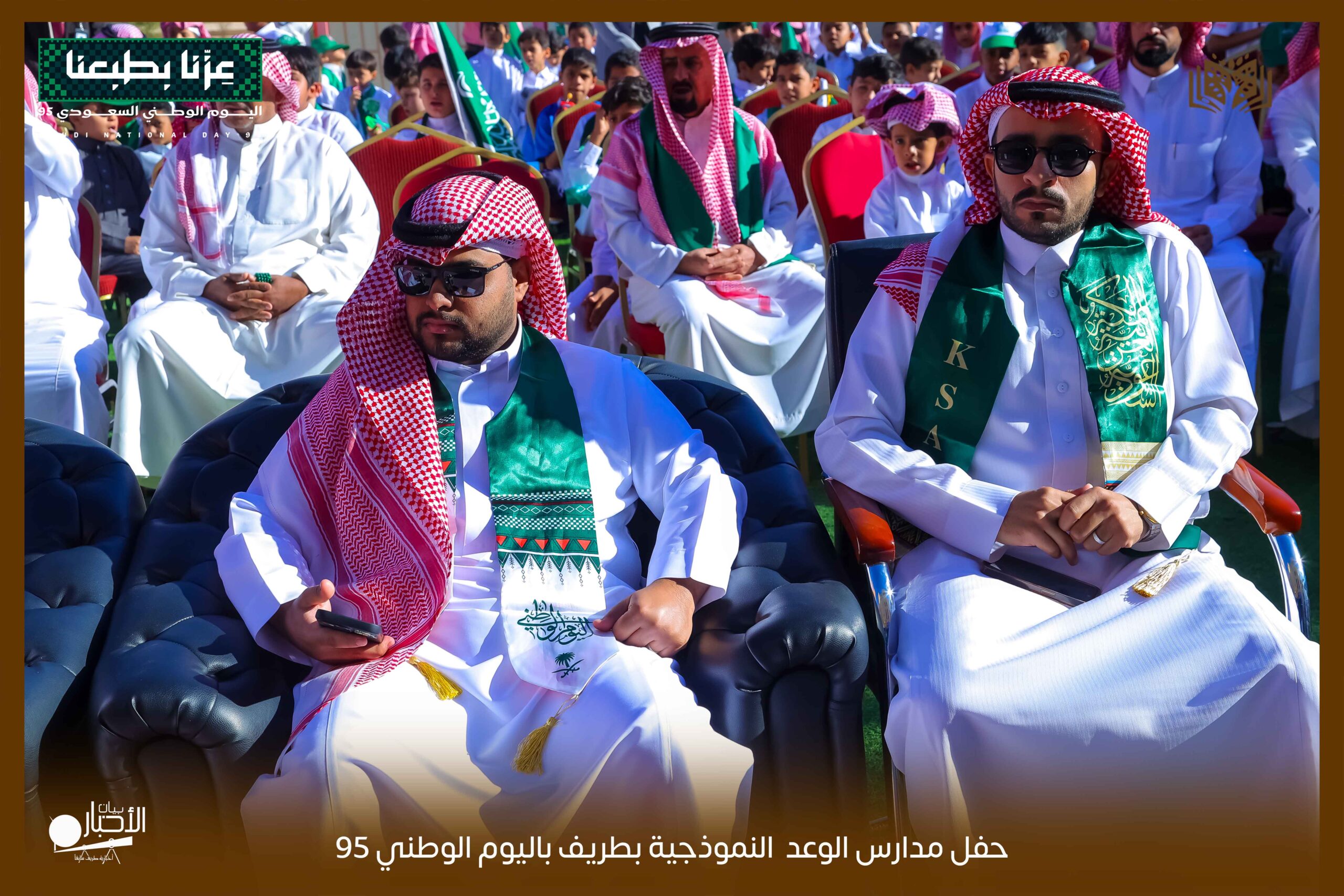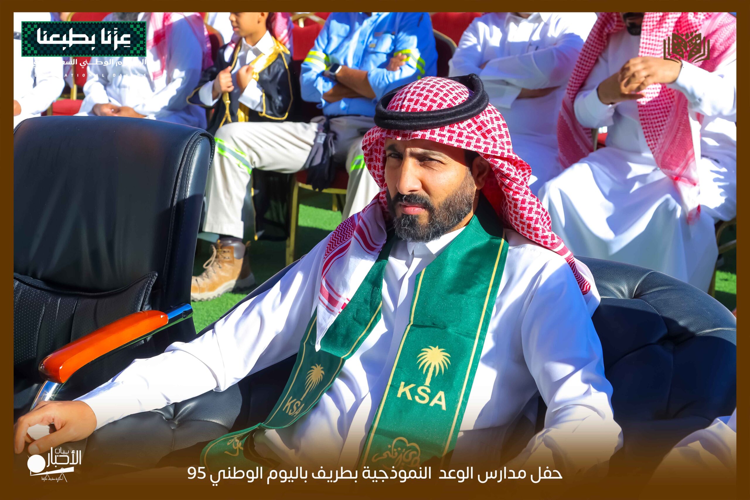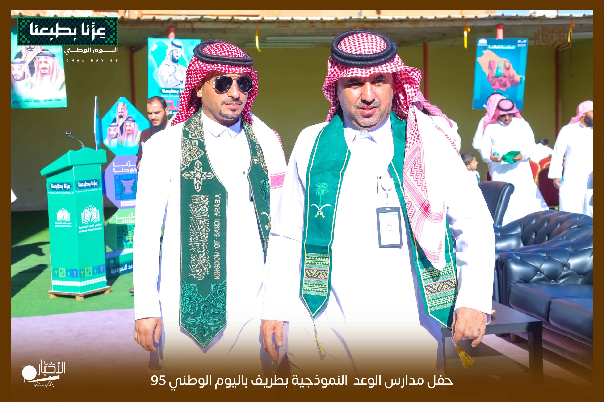 أقامت مدارس الوعد النموذجية الأهلية حفلًا بمناسبة ذكرى( اليوم الوطني السعودي ٩٥ ) ، تلك الذكرى التي تجعلنا نشعر بالاعتزاز والفخر بالانتماء لهذا الوطن العظيم ، حيث بدأ الحفل بعرض السلام الملكي ثم آيات عطرة من الذكر الحكيم ثم كلمة مدير المدرسة الأستاذ إسماعيل صالح العنزي والذي رحب بالسادة الضيوف وأولياء الأمور وتقديم التهنئة للقيادة الحكيمة والشعب السعودي بهذه المناسبة ،ثم تتابعت فقرات الحفل ما بين مشهد لملوك المملكة وعرض مسرحي بعنوان ( عزنا بطبعنا ) ثم فقرة باللغة الإنجليزية في حب الوطن ثم ختم الحفل بأداء الطلاب للعارضة السعودية ٠
