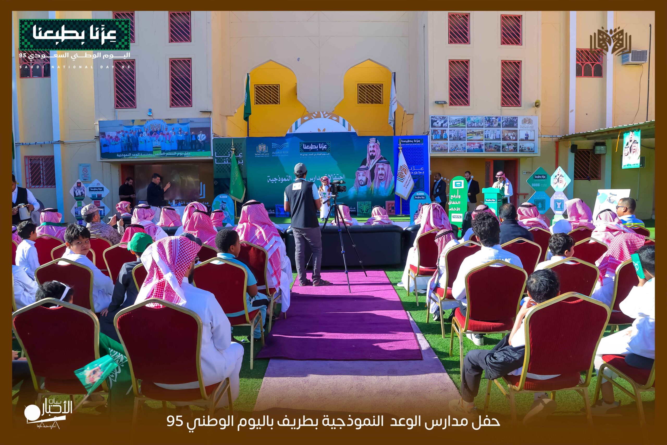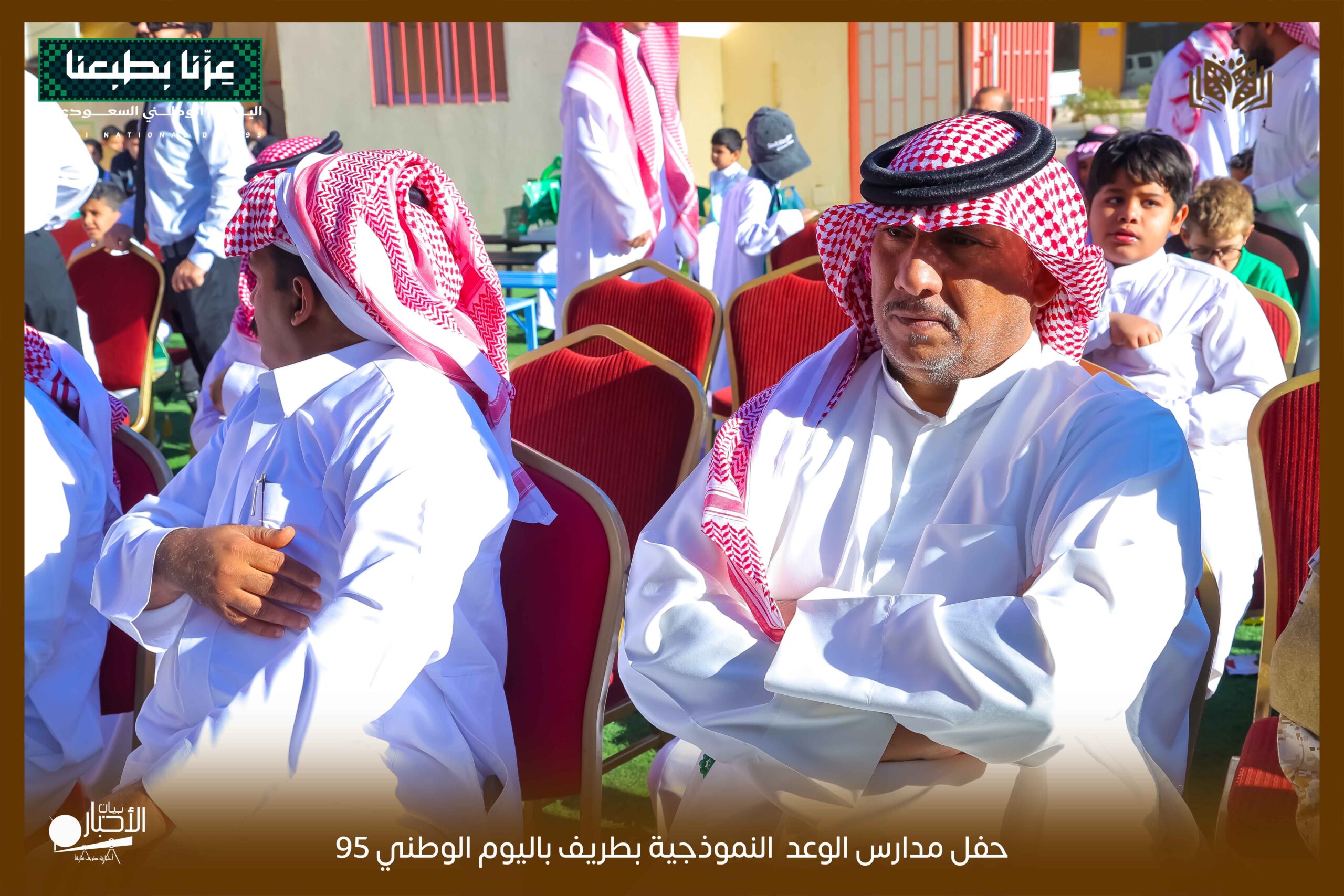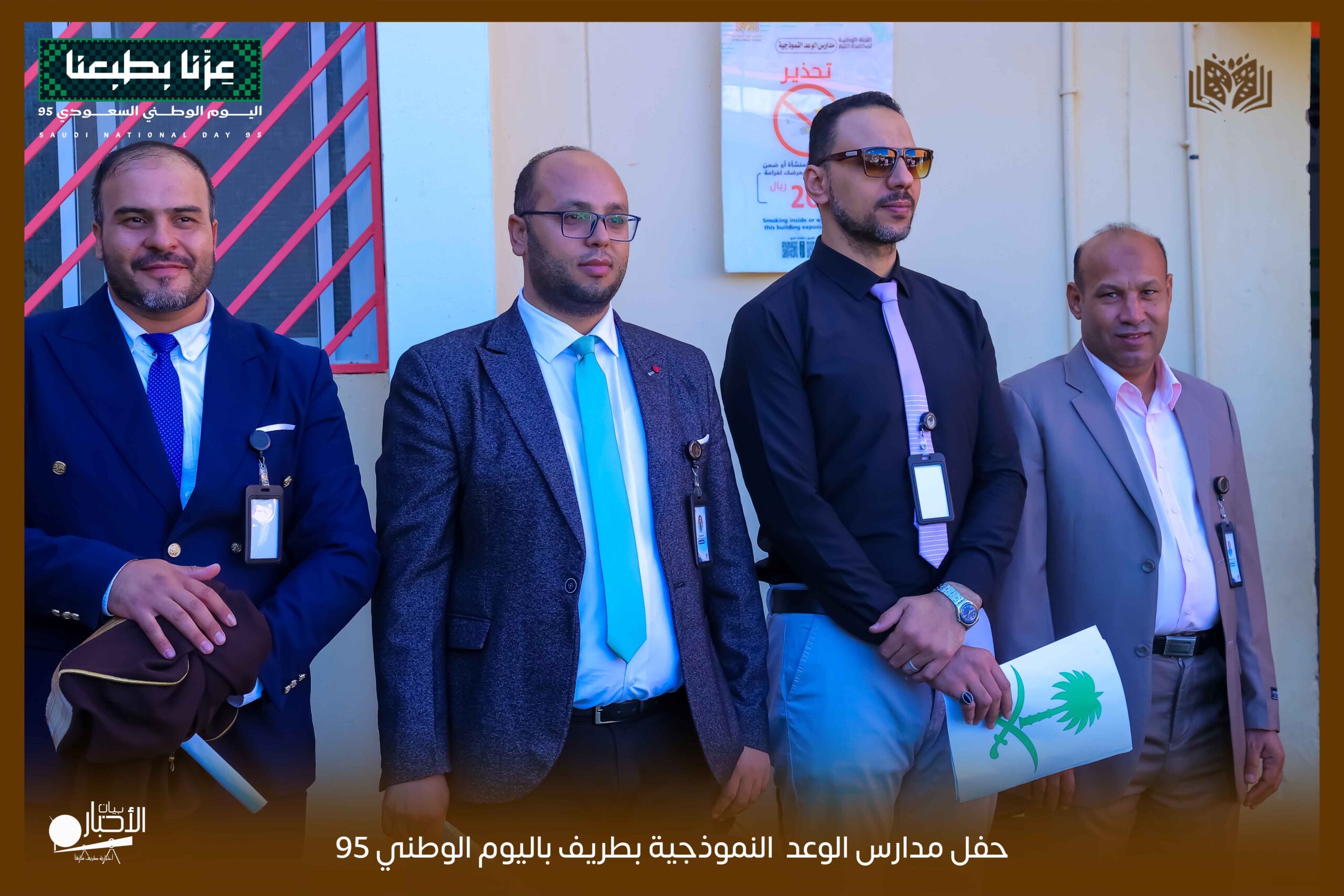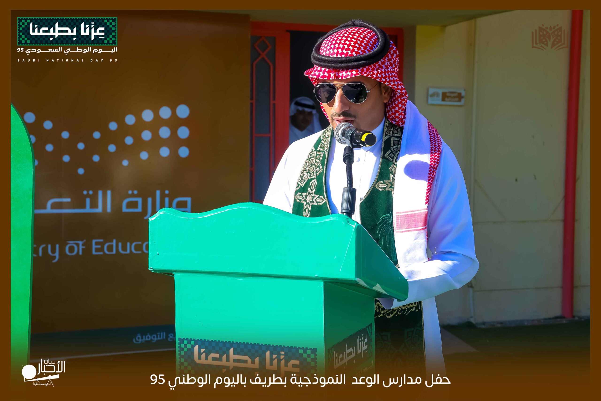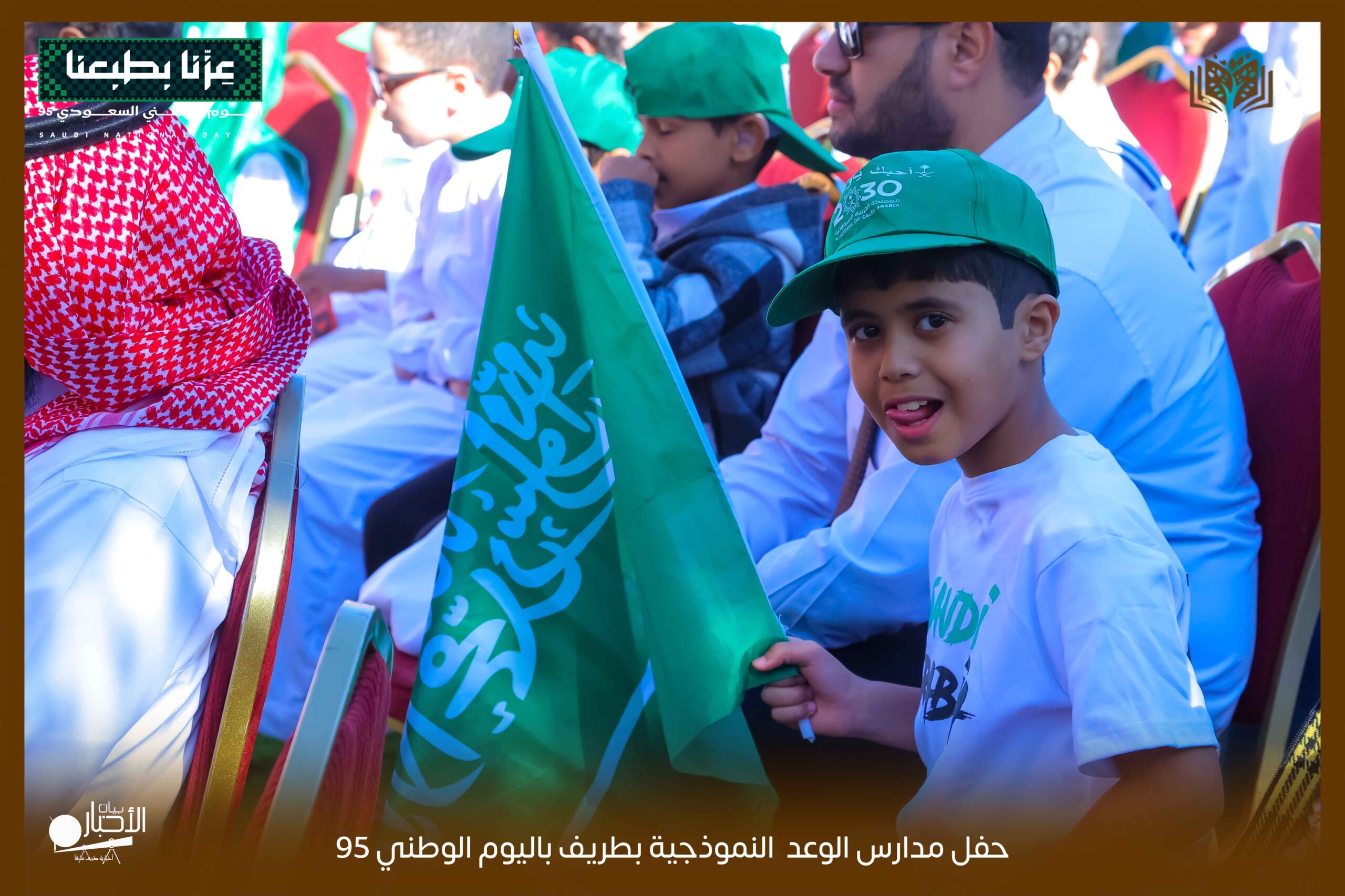 أقامت مدارس الوعد النموذجية الأهلية حفلًا بمناسبة ذكرى( اليوم الوطني السعودي ٩٥ ) ، تلك الذكرى التي تجعلنا نشعر بالاعتزاز والفخر بالانتماء لهذا الوطن العظيم ، حيث بدأ الحفل بعرض السلام الملكي ثم آيات عطرة من الذكر الحكيم ثم كلمة مدير المدرسة الأستاذ إسماعيل صالح العنزي والذي رحب بالسادة الضيوف وأولياء الأمور وتقديم التهنئة للقيادة الحكيمة والشعب السعودي بهذه المناسبة ،ثم تتابعت فقرات الحفل ما بين مشهد لملوك المملكة وعرض مسرحي بعنوان ( عزنا بطبعنا ) ثم فقرة باللغة الإنجليزية في حب الوطن ثم ختم الحفل بأداء الطلاب للعارضة السعودية ٠