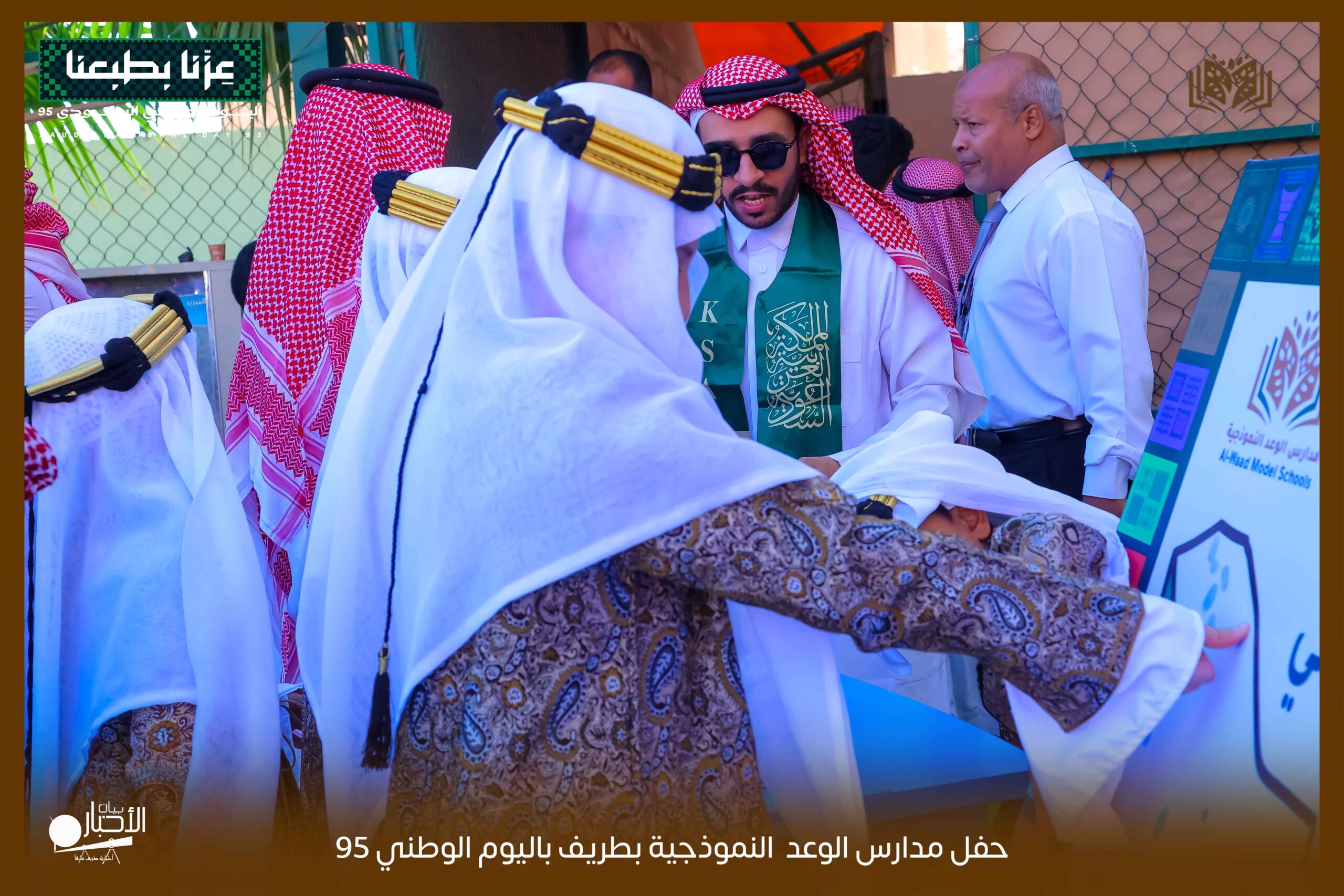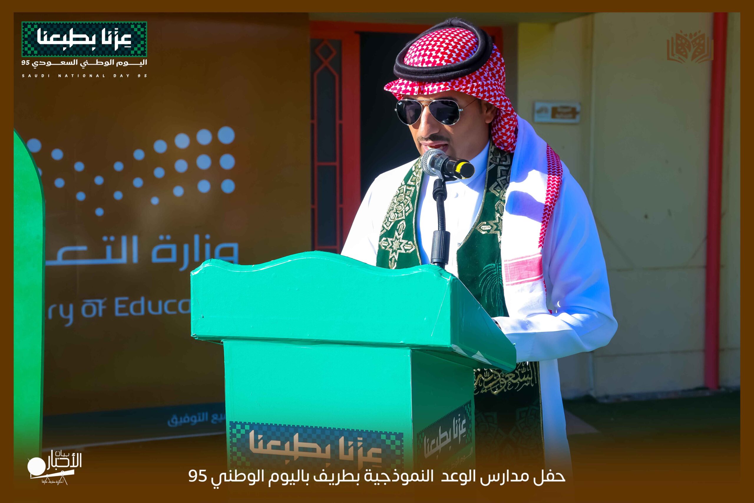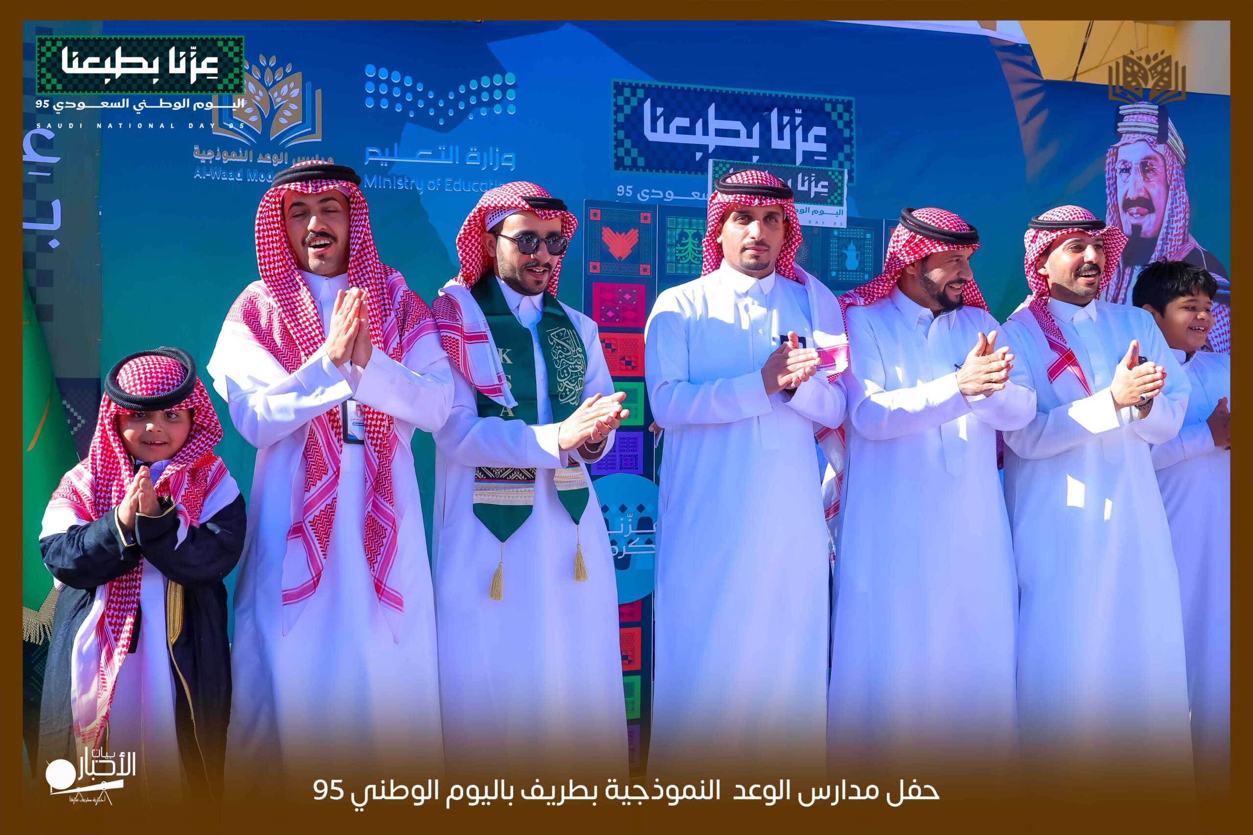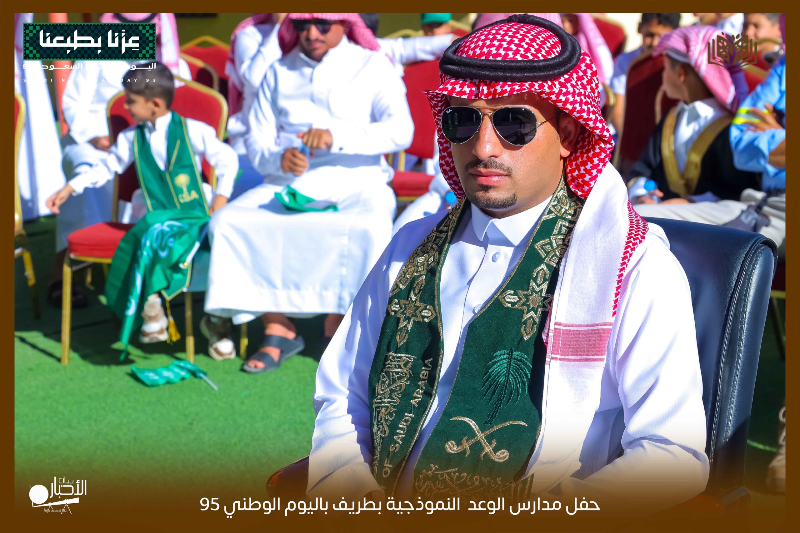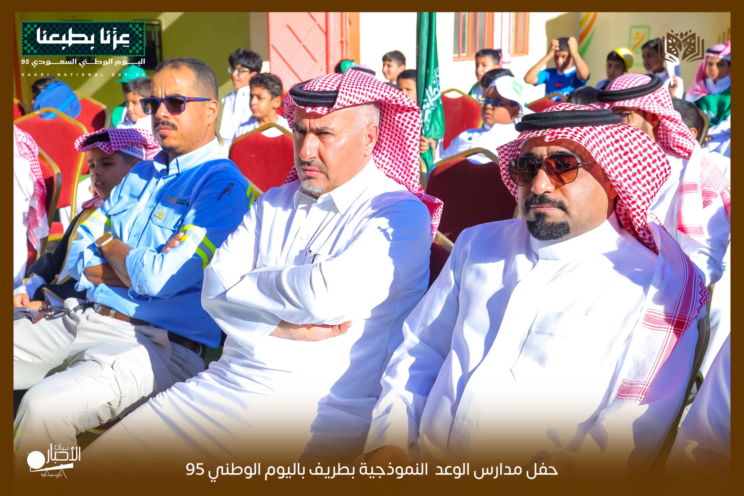 أقامت مدارس الوعد النموذجية الأهلية حفلًا بمناسبة ذكرى( اليوم الوطني السعودي ٩٥ ) ، تلك الذكرى التي تجعلنا نشعر بالاعتزاز والفخر بالانتماء لهذا الوطن العظيم ، حيث بدأ الحفل بعرض السلام الملكي ثم آيات عطرة من الذكر الحكيم ثم كلمة مدير المدرسة الأستاذ إسماعيل صالح العنزي والذي رحب بالسادة الضيوف وأولياء الأمور وتقديم التهنئة للقيادة الحكيمة والشعب السعودي بهذه المناسبة ،ثم تتابعت فقرات الحفل ما بين مشهد لملوك المملكة وعرض مسرحي بعنوان ( عزنا بطبعنا ) ثم فقرة باللغة الإنجليزية في حب الوطن ثم ختم الحفل بأداء الطلاب للعارضة السعودية ٠