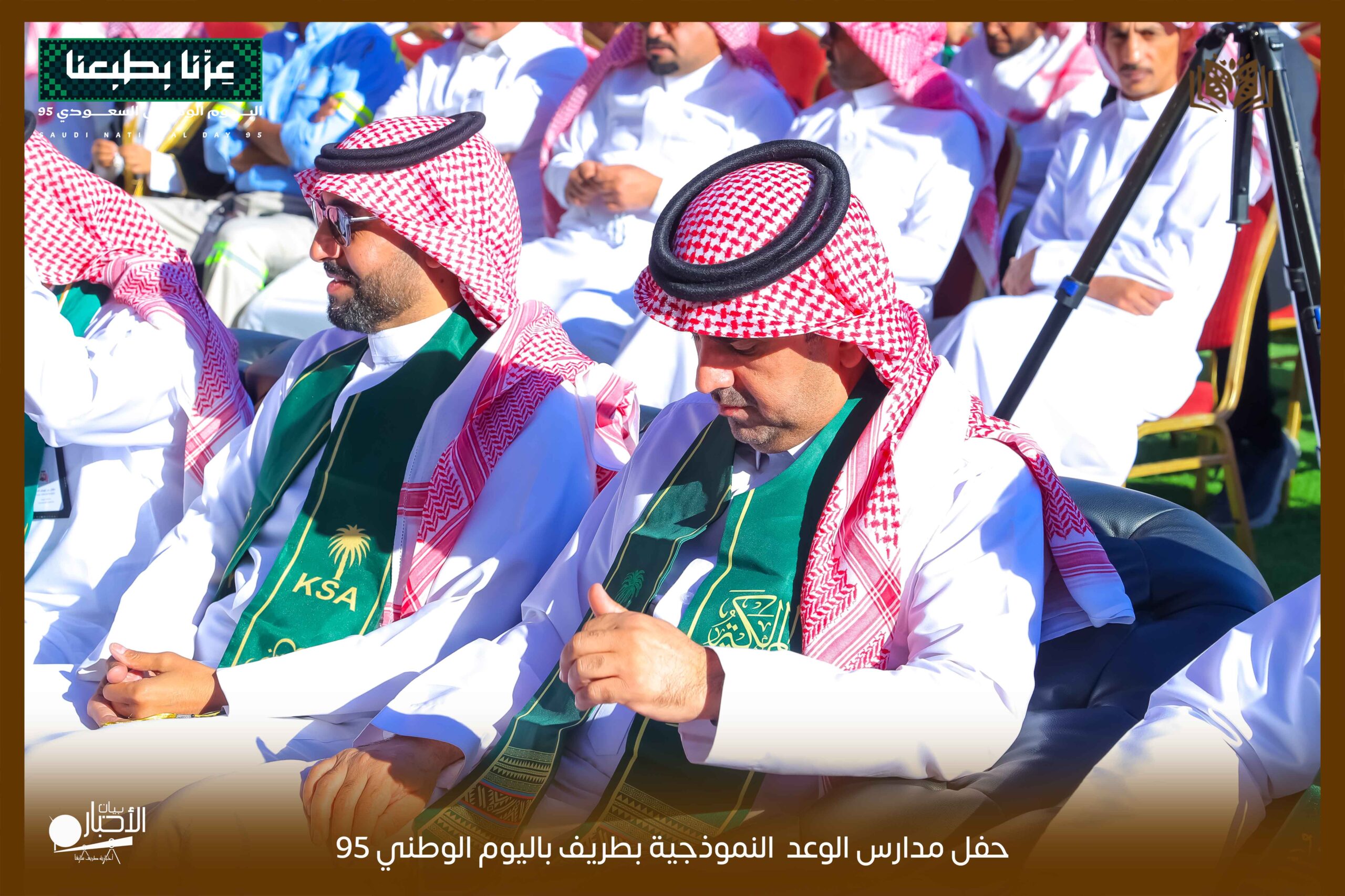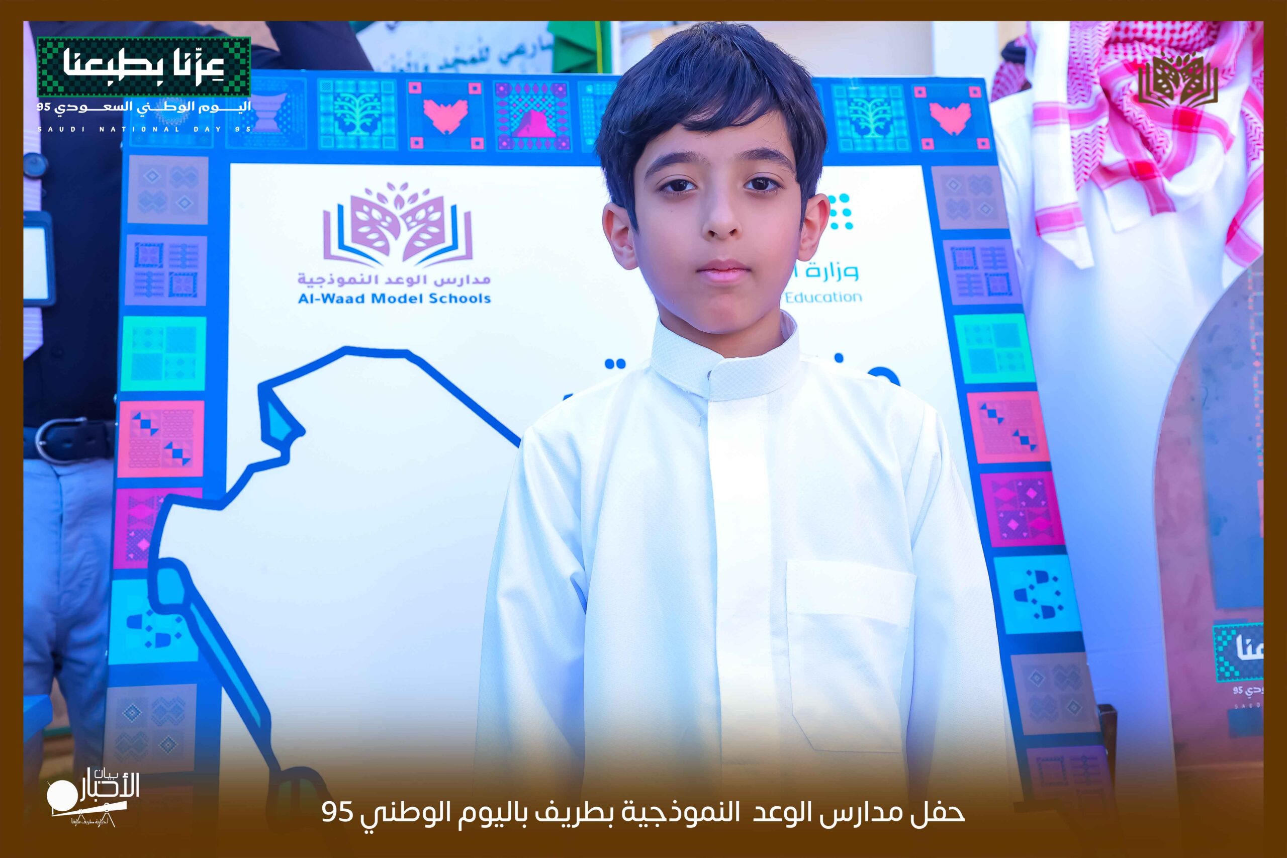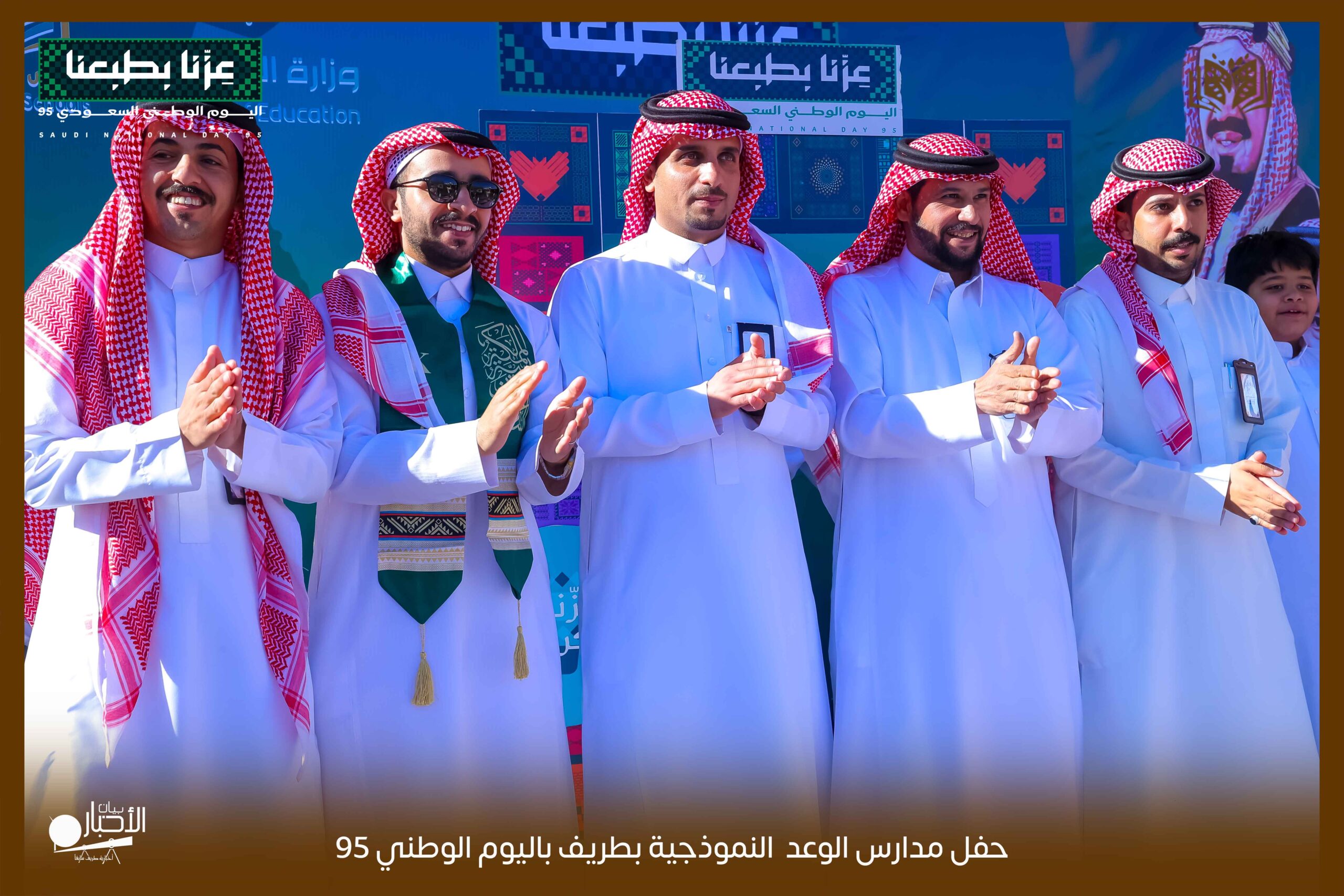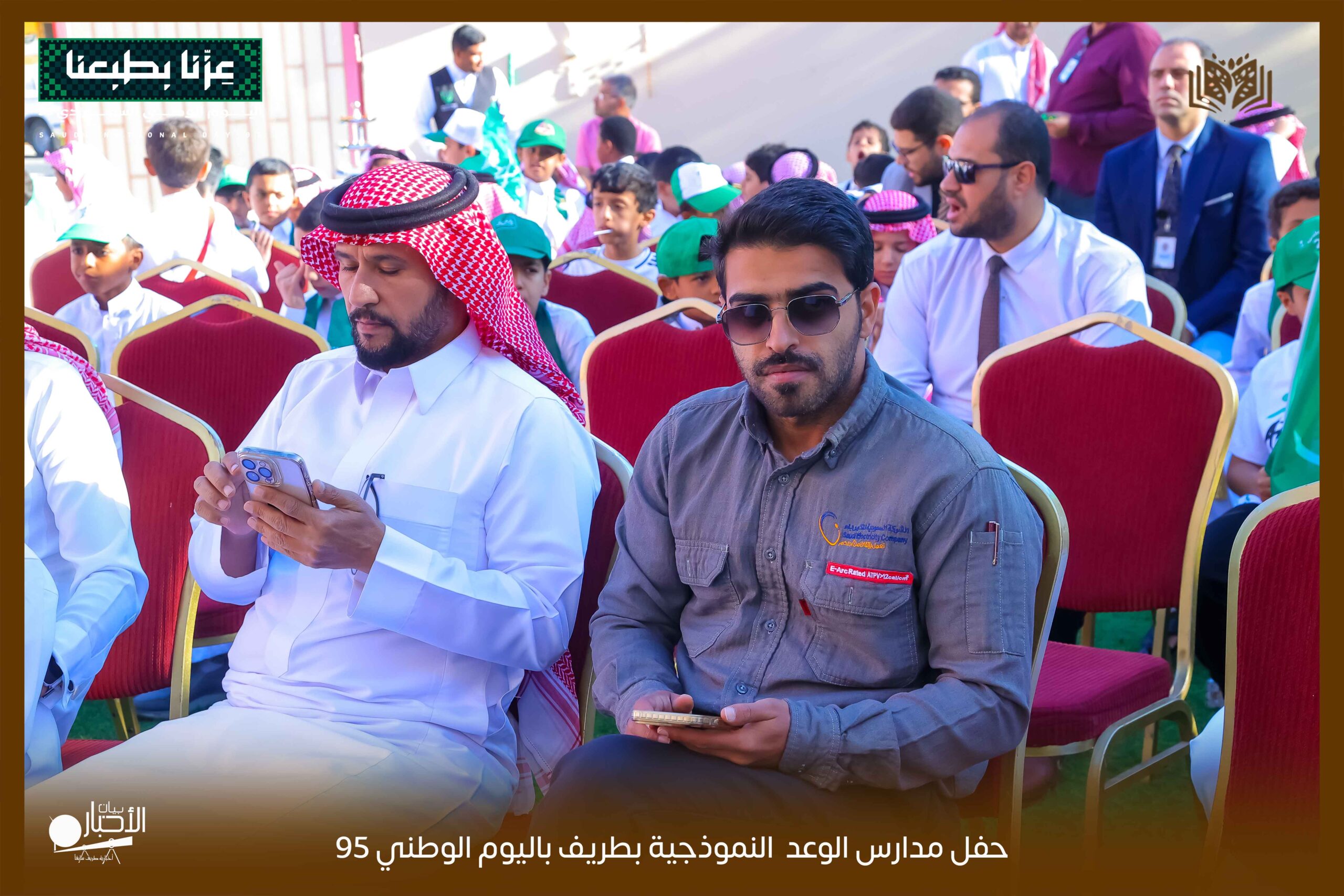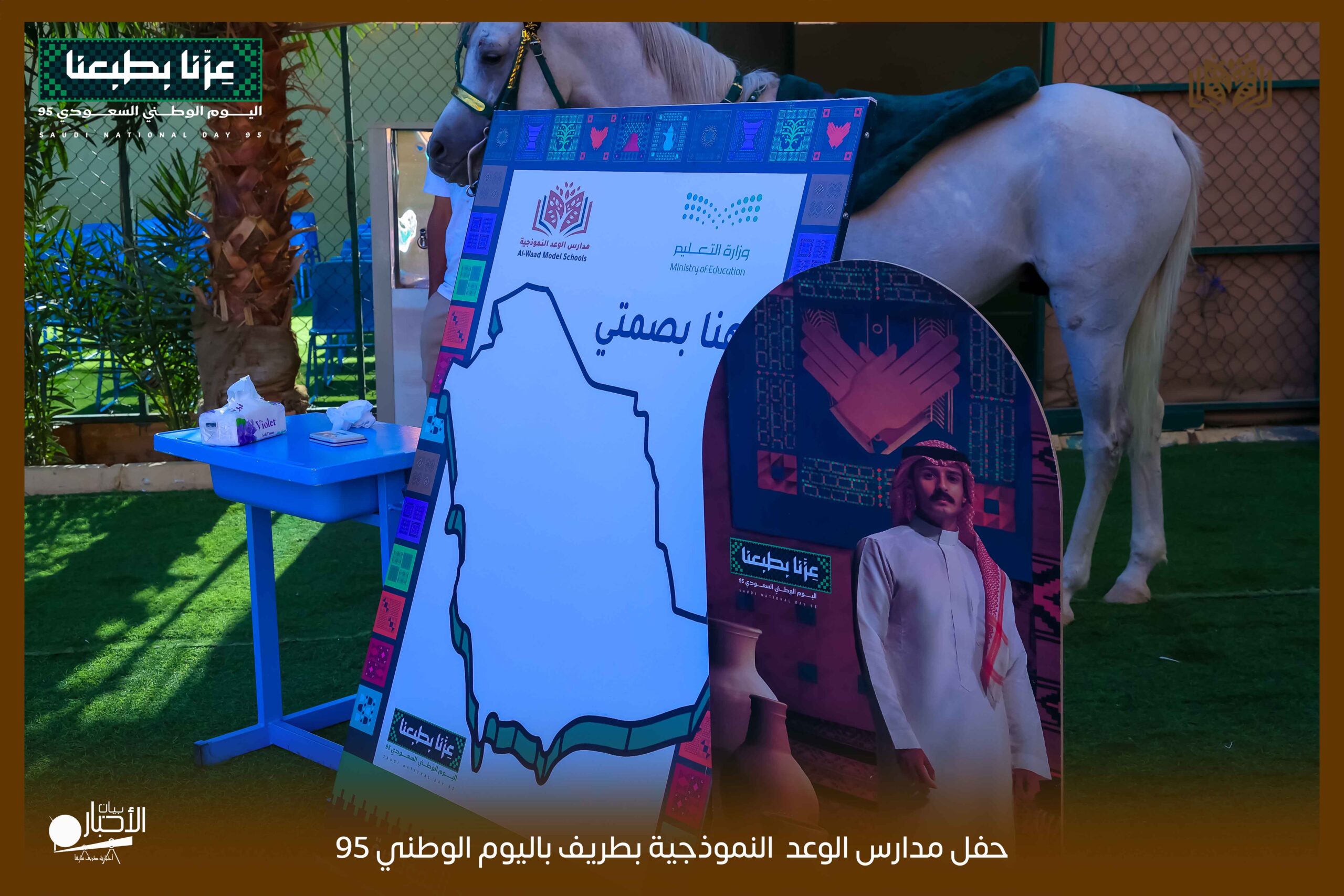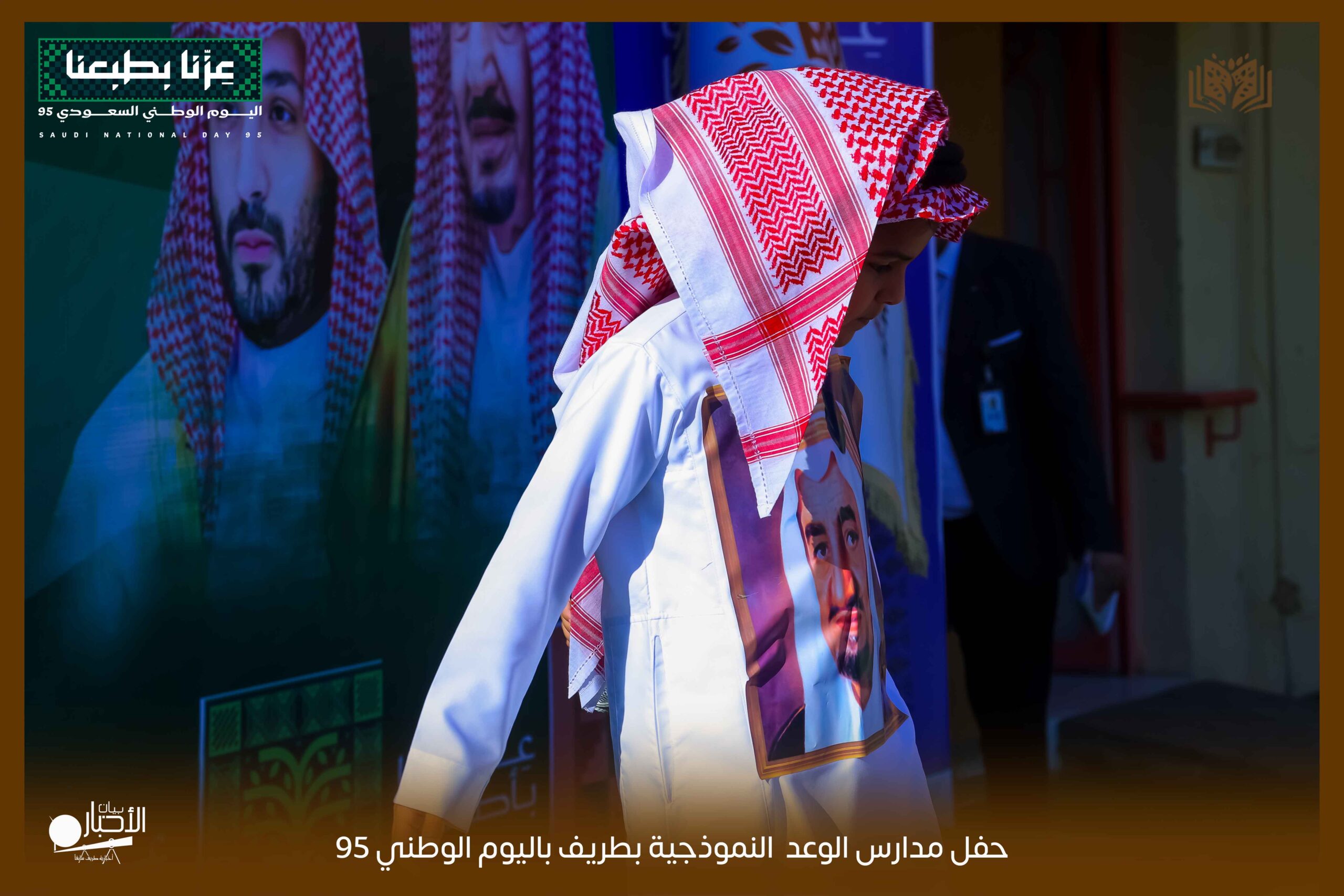 أقامت مدارس الوعد النموذجية الأهلية حفلًا بمناسبة ذكرى( اليوم الوطني السعودي ٩٥ ) ، تلك الذكرى التي تجعلنا نشعر بالاعتزاز والفخر بالانتماء لهذا الوطن العظيم ، حيث بدأ الحفل بعرض السلام الملكي ثم آيات عطرة من الذكر الحكيم ثم كلمة مدير المدرسة الأستاذ إسماعيل صالح العنزي والذي رحب بالسادة الضيوف وأولياء الأمور وتقديم التهنئة للقيادة الحكيمة والشعب السعودي بهذه المناسبة ،ثم تتابعت فقرات الحفل ما بين مشهد لملوك المملكة وعرض مسرحي بعنوان ( عزنا بطبعنا ) ثم فقرة باللغة الإنجليزية في حب الوطن ثم ختم الحفل بأداء الطلاب للعارضة السعودية ٠