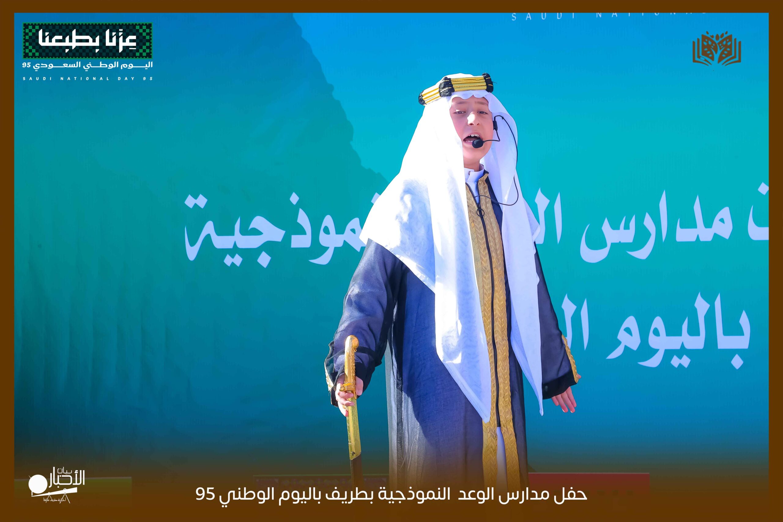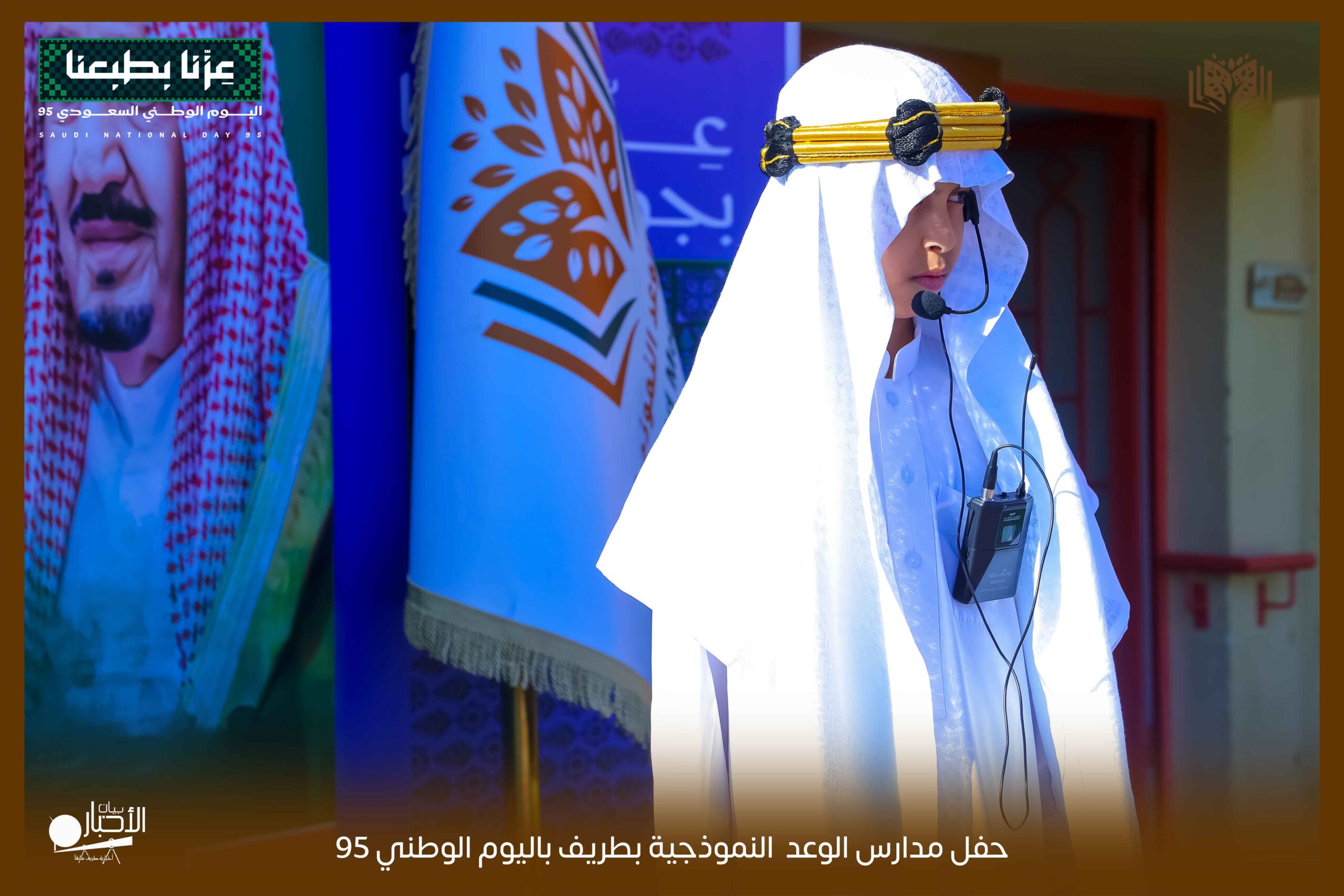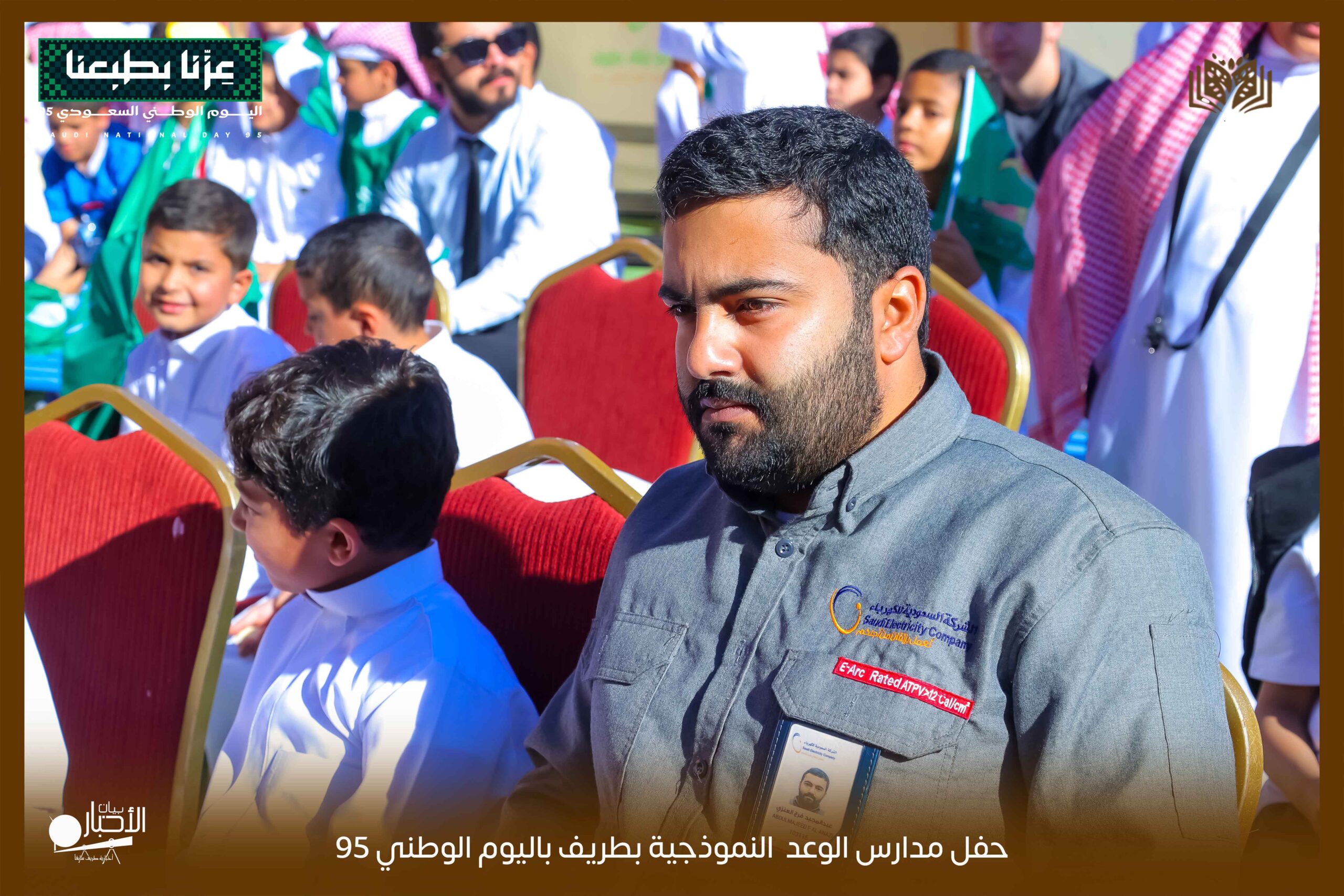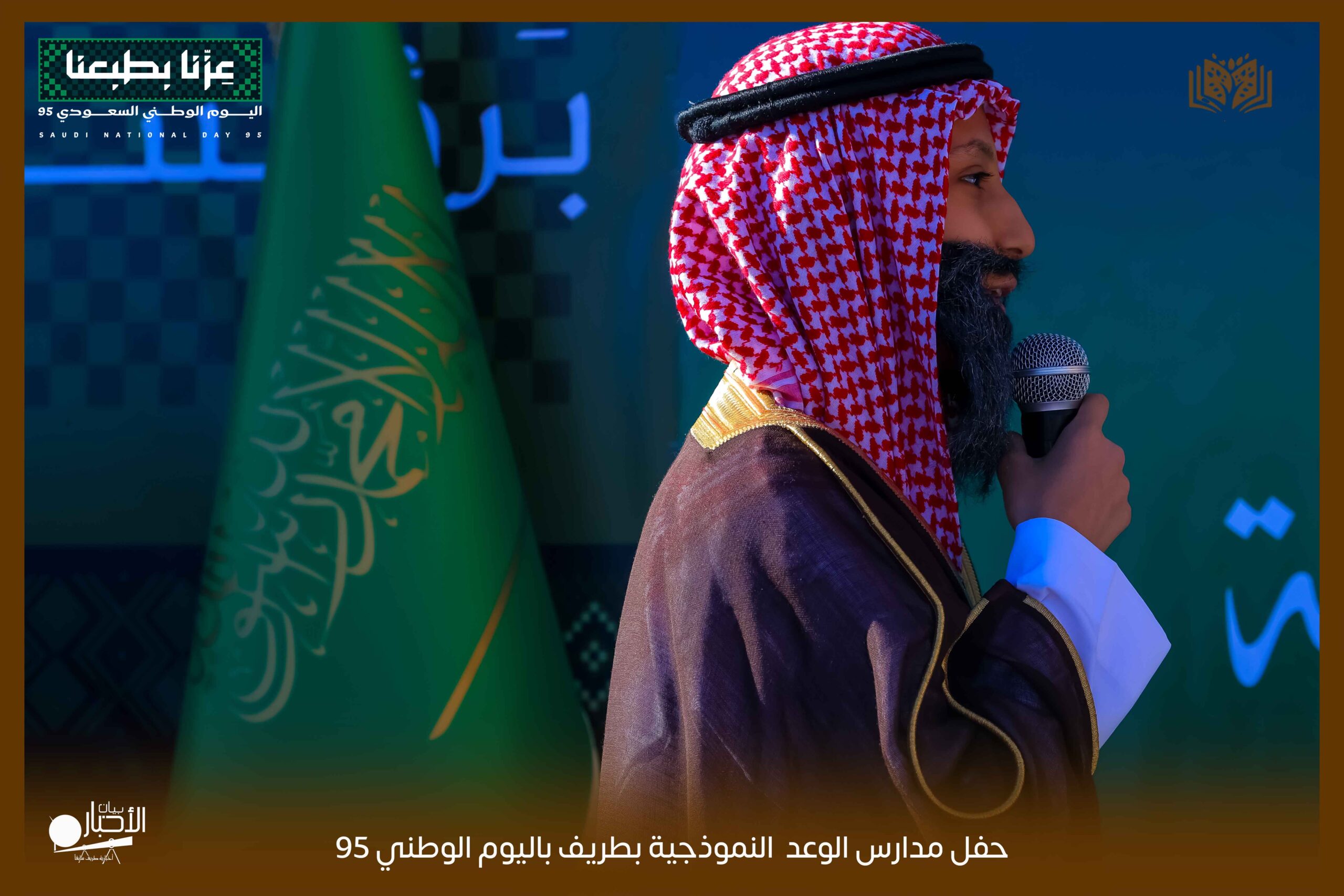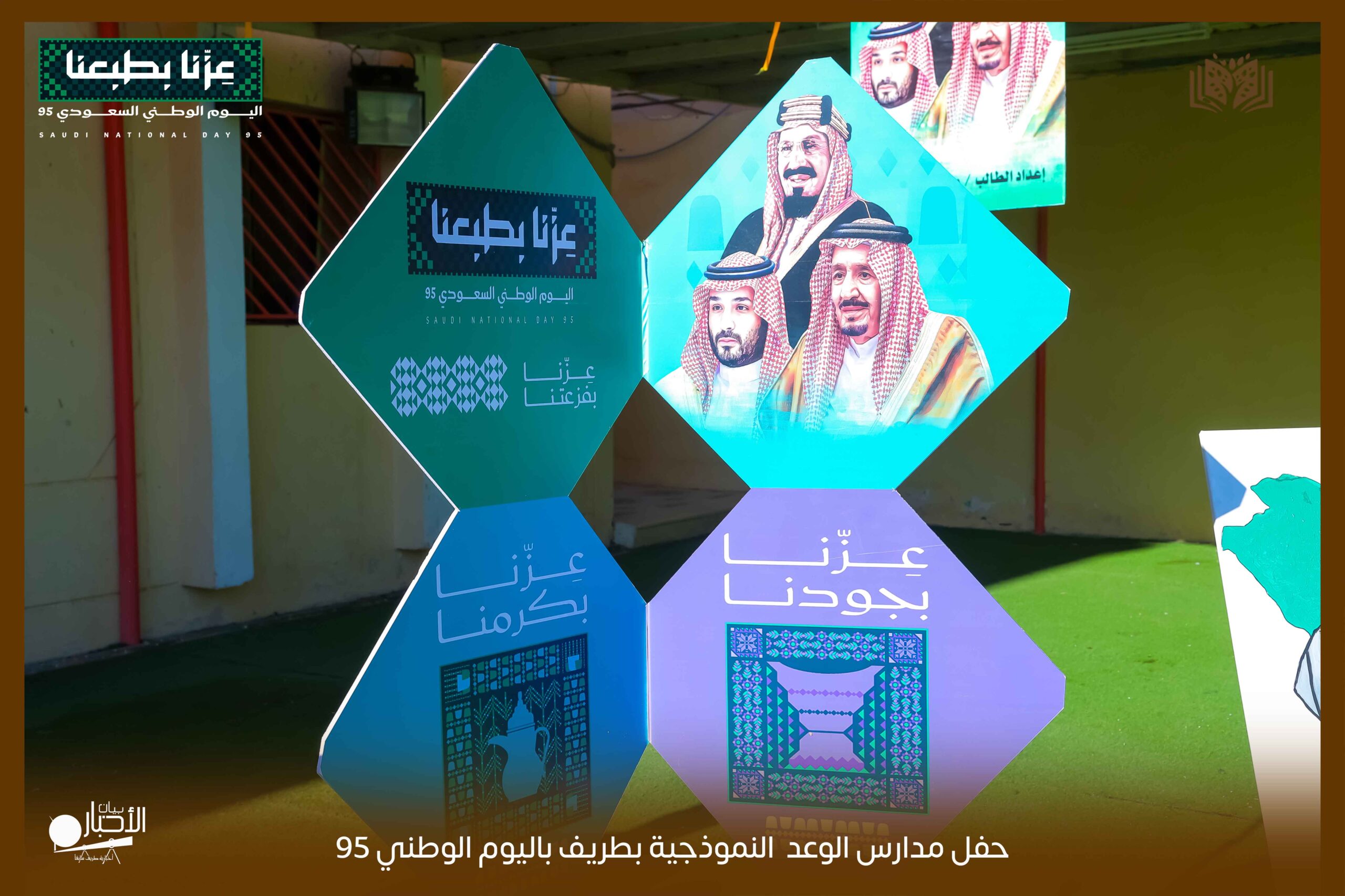 أقامت مدارس الوعد النموذجية الأهلية حفلًا بمناسبة ذكرى( اليوم الوطني السعودي ٩٥ ) ، تلك الذكرى التي تجعلنا نشعر بالاعتزاز والفخر بالانتماء لهذا الوطن العظيم ، حيث بدأ الحفل بعرض السلام الملكي ثم آيات عطرة من الذكر الحكيم ثم كلمة مدير المدرسة الأستاذ إسماعيل صالح العنزي والذي رحب بالسادة الضيوف وأولياء الأمور وتقديم التهنئة للقيادة الحكيمة والشعب السعودي بهذه المناسبة ،ثم تتابعت فقرات الحفل ما بين مشهد لملوك المملكة وعرض مسرحي بعنوان ( عزنا بطبعنا ) ثم فقرة باللغة الإنجليزية في حب الوطن ثم ختم الحفل بأداء الطلاب للعارضة السعودية ٠
