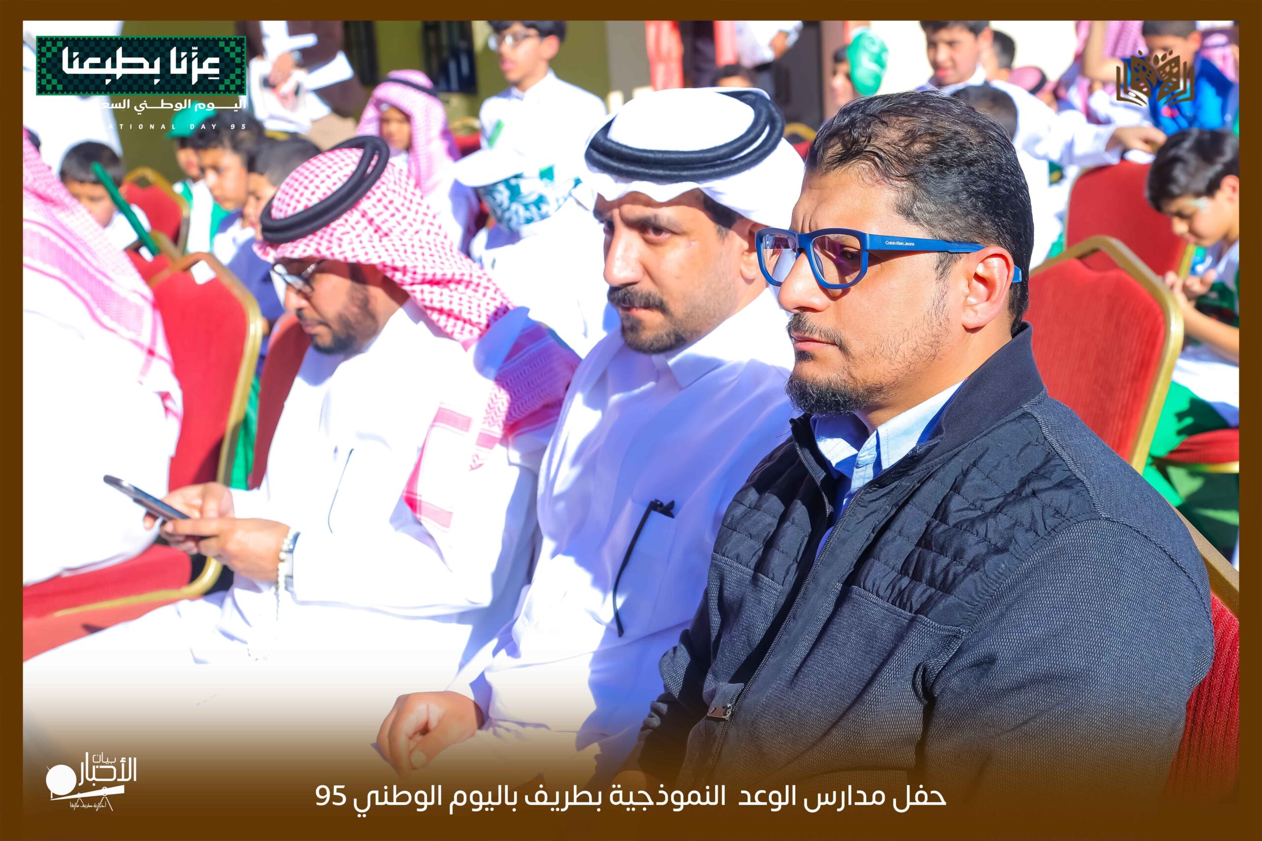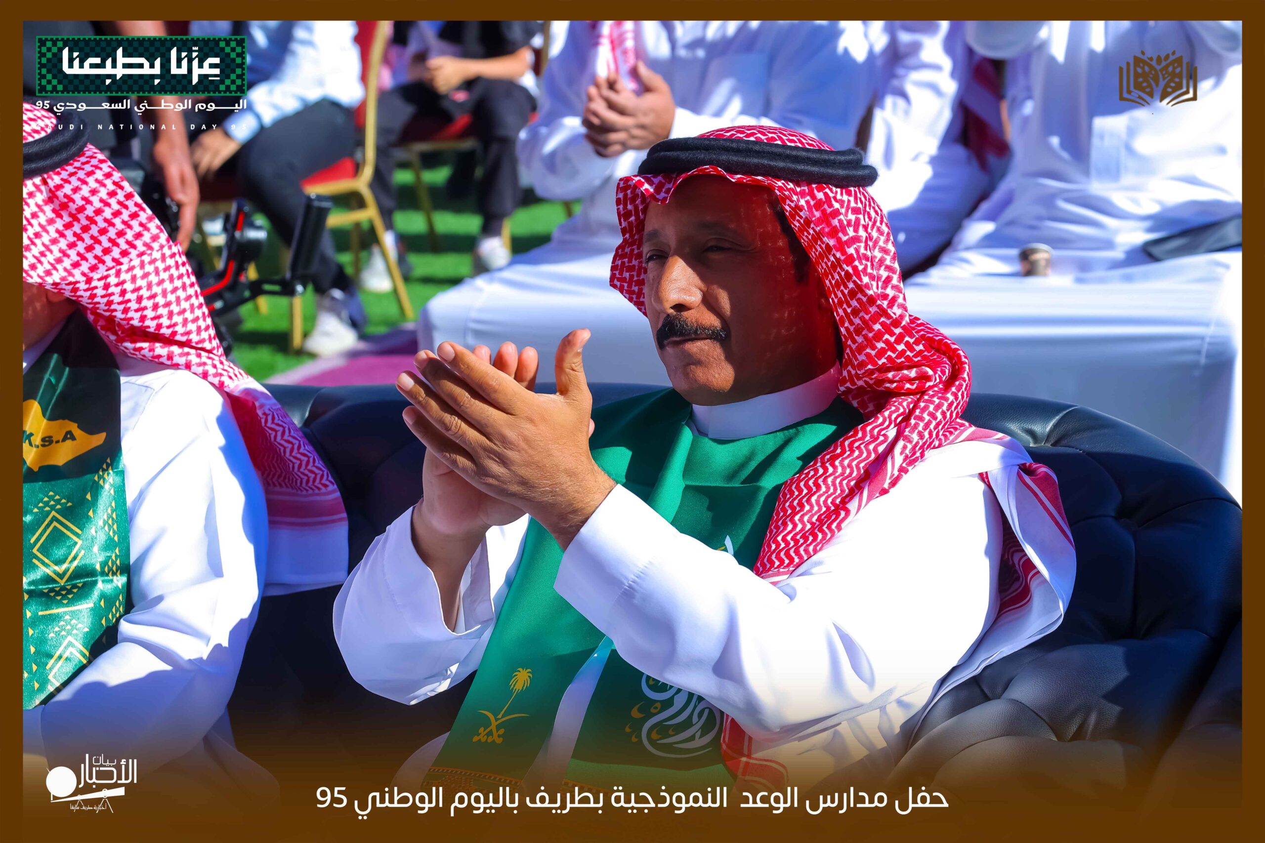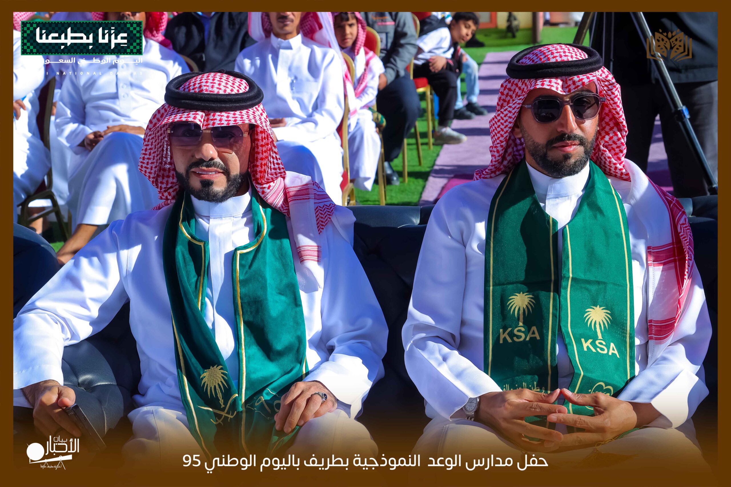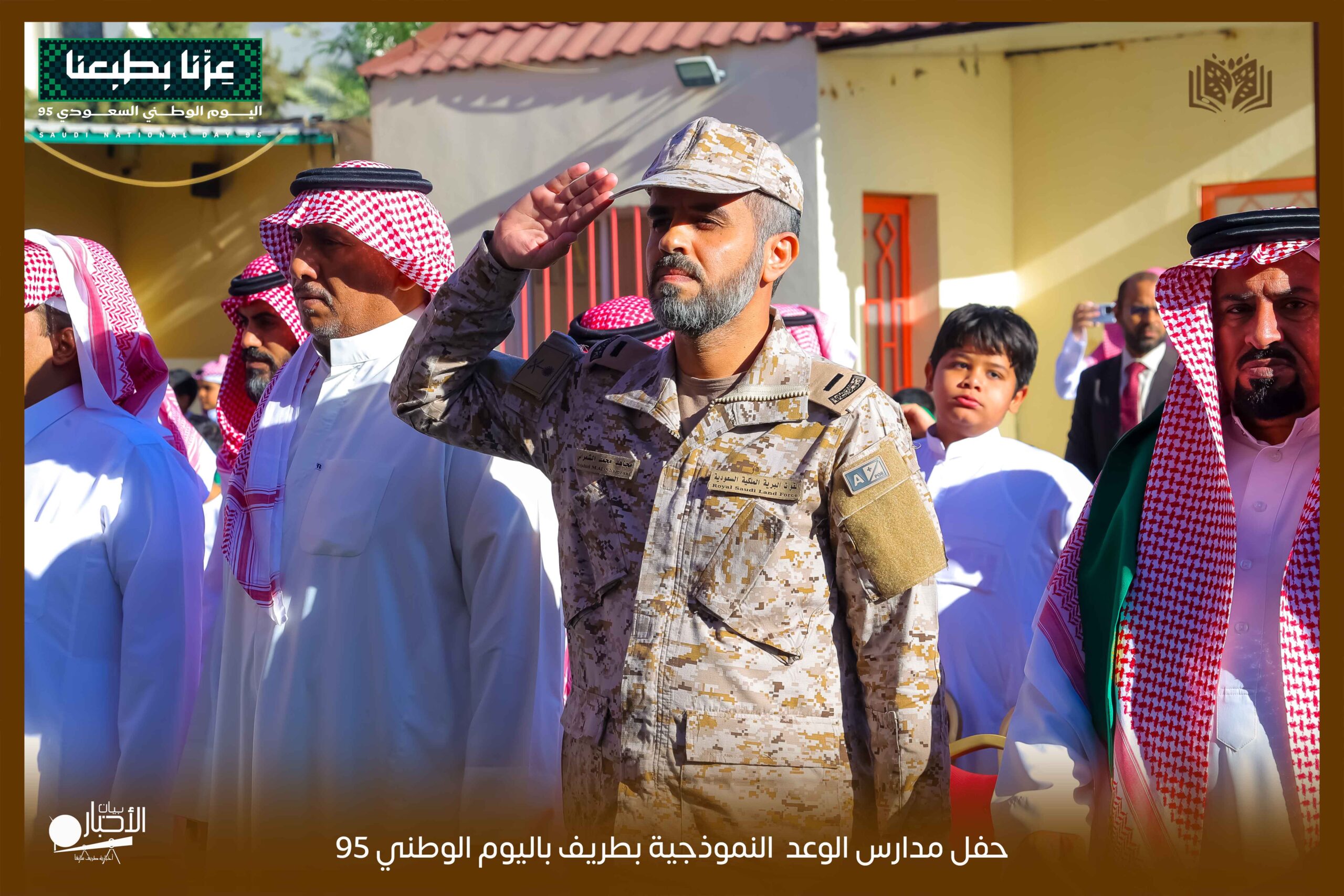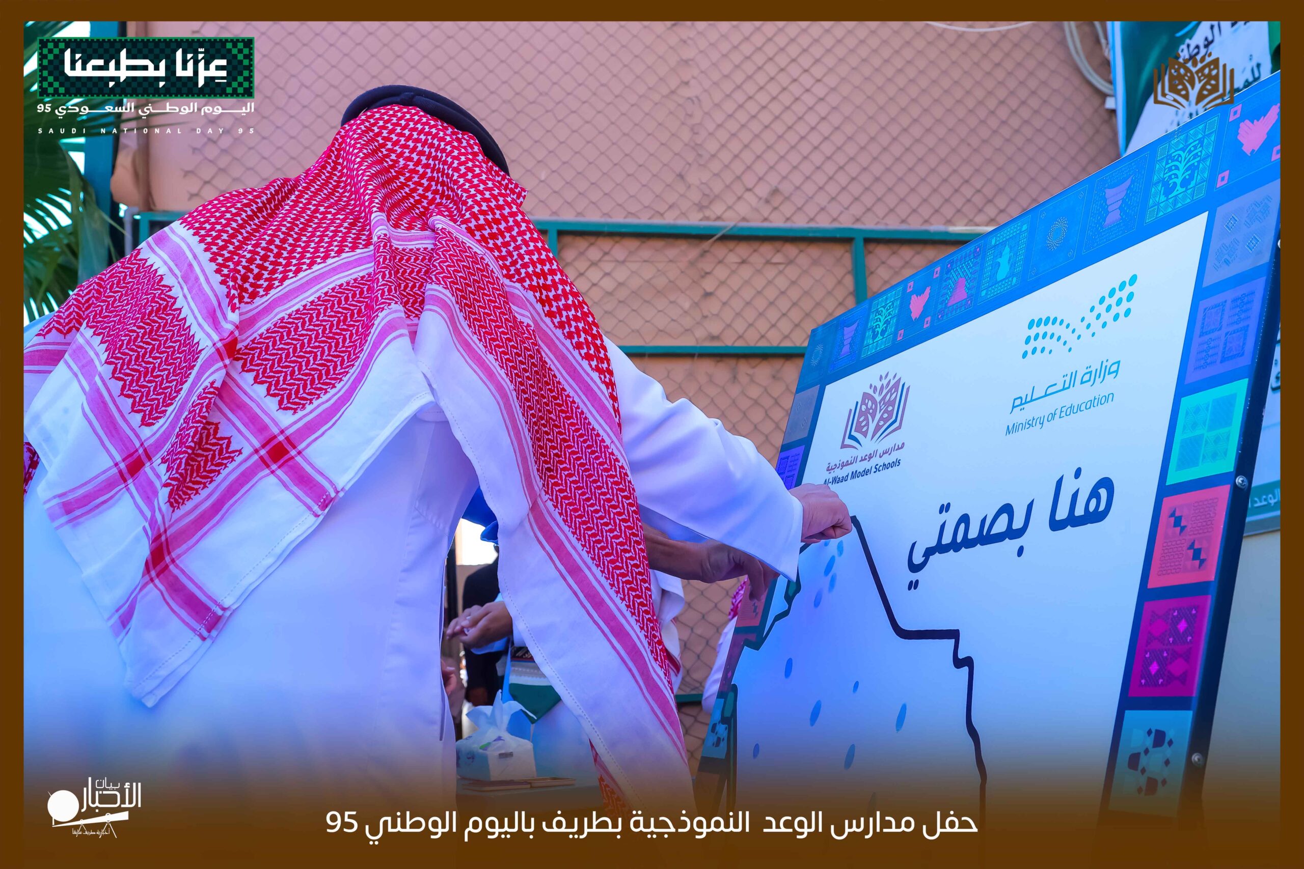 أقامت مدارس الوعد النموذجية الأهلية حفلًا بمناسبة ذكرى( اليوم الوطني السعودي ٩٥ ) ، تلك الذكرى التي تجعلنا نشعر بالاعتزاز والفخر بالانتماء لهذا الوطن العظيم ، حيث بدأ الحفل بعرض السلام الملكي ثم آيات عطرة من الذكر الحكيم ثم كلمة مدير المدرسة الأستاذ إسماعيل صالح العنزي والذي رحب بالسادة الضيوف وأولياء الأمور وتقديم التهنئة للقيادة الحكيمة والشعب السعودي بهذه المناسبة ،ثم تتابعت فقرات الحفل ما بين مشهد لملوك المملكة وعرض مسرحي بعنوان ( عزنا بطبعنا ) ثم فقرة باللغة الإنجليزية في حب الوطن ثم ختم الحفل بأداء الطلاب للعارضة السعودية ٠