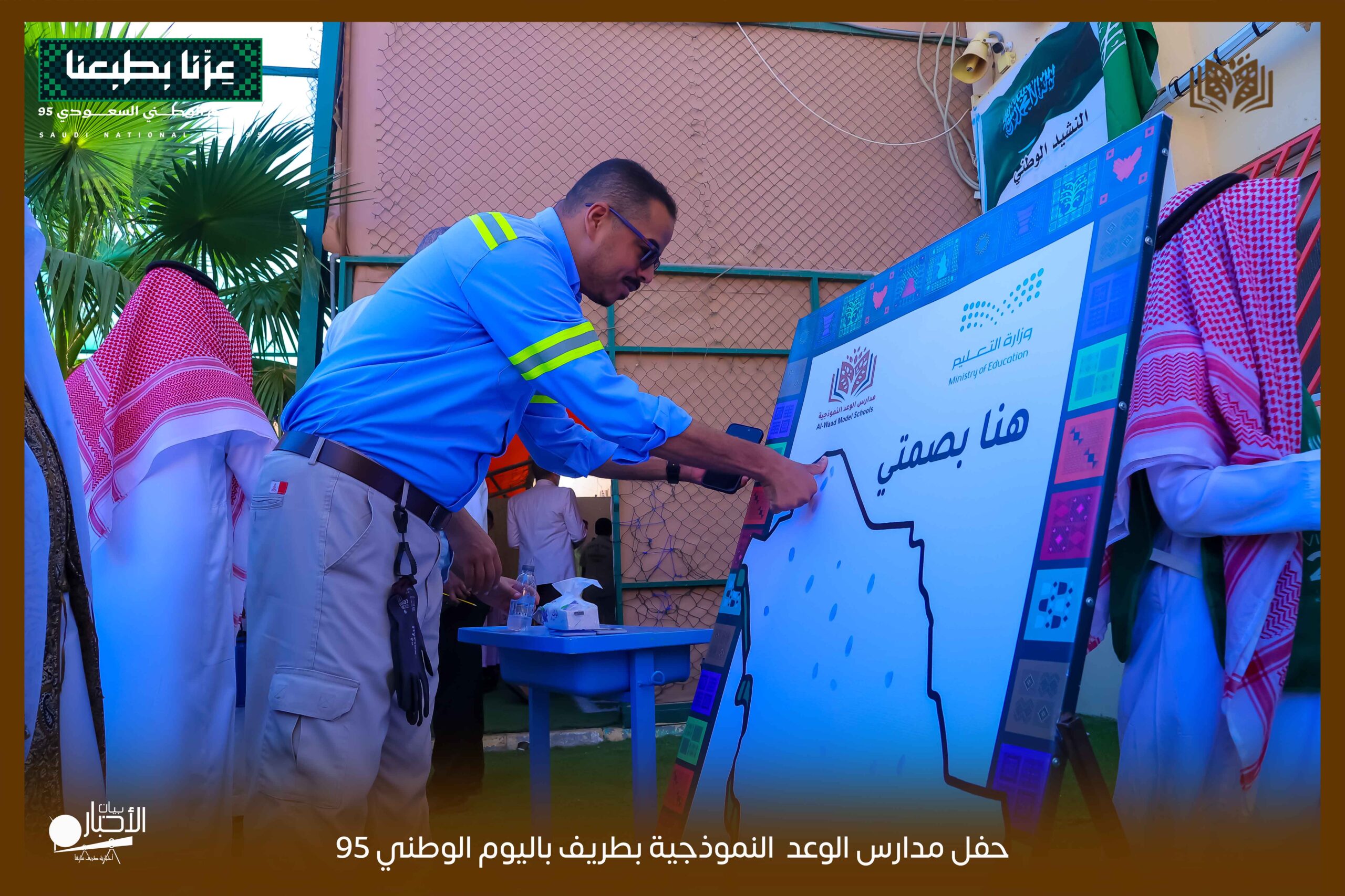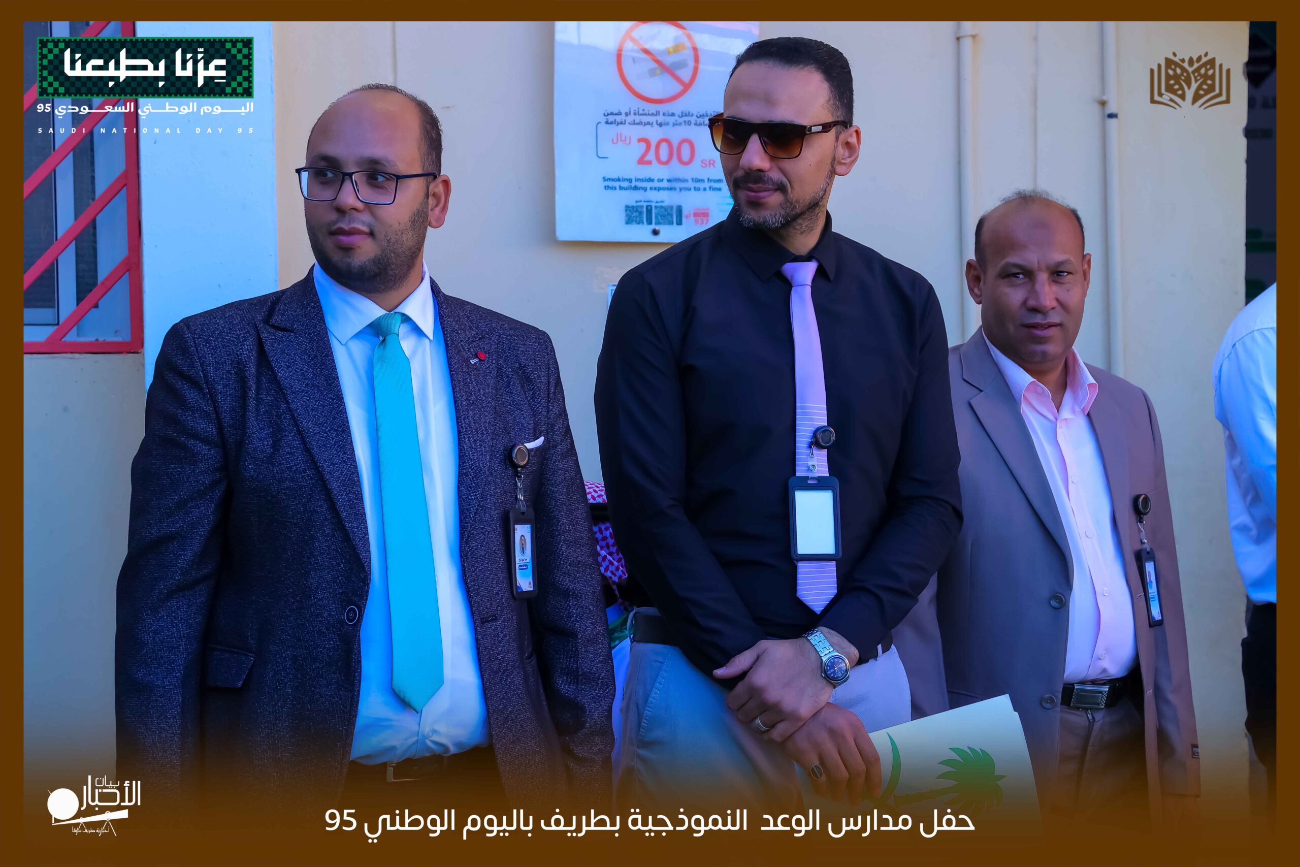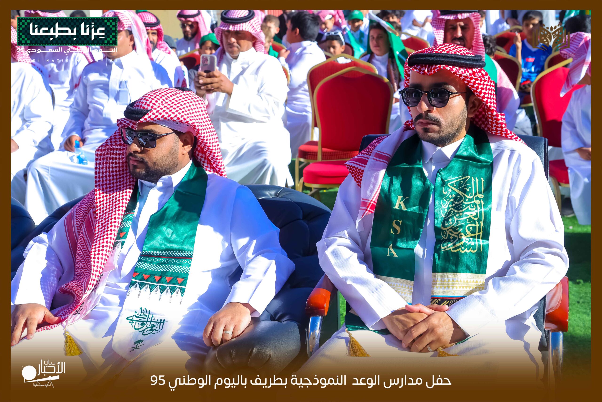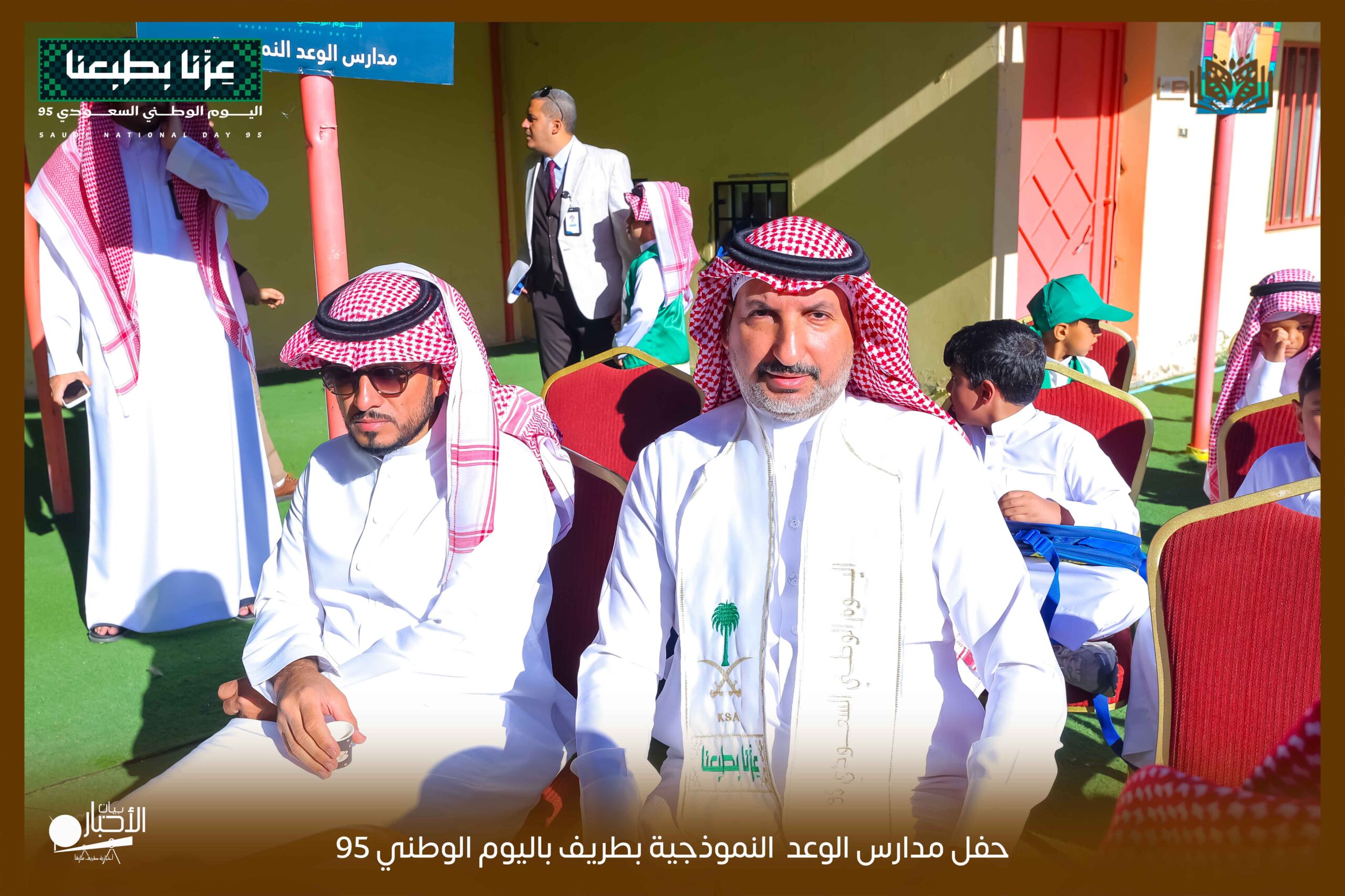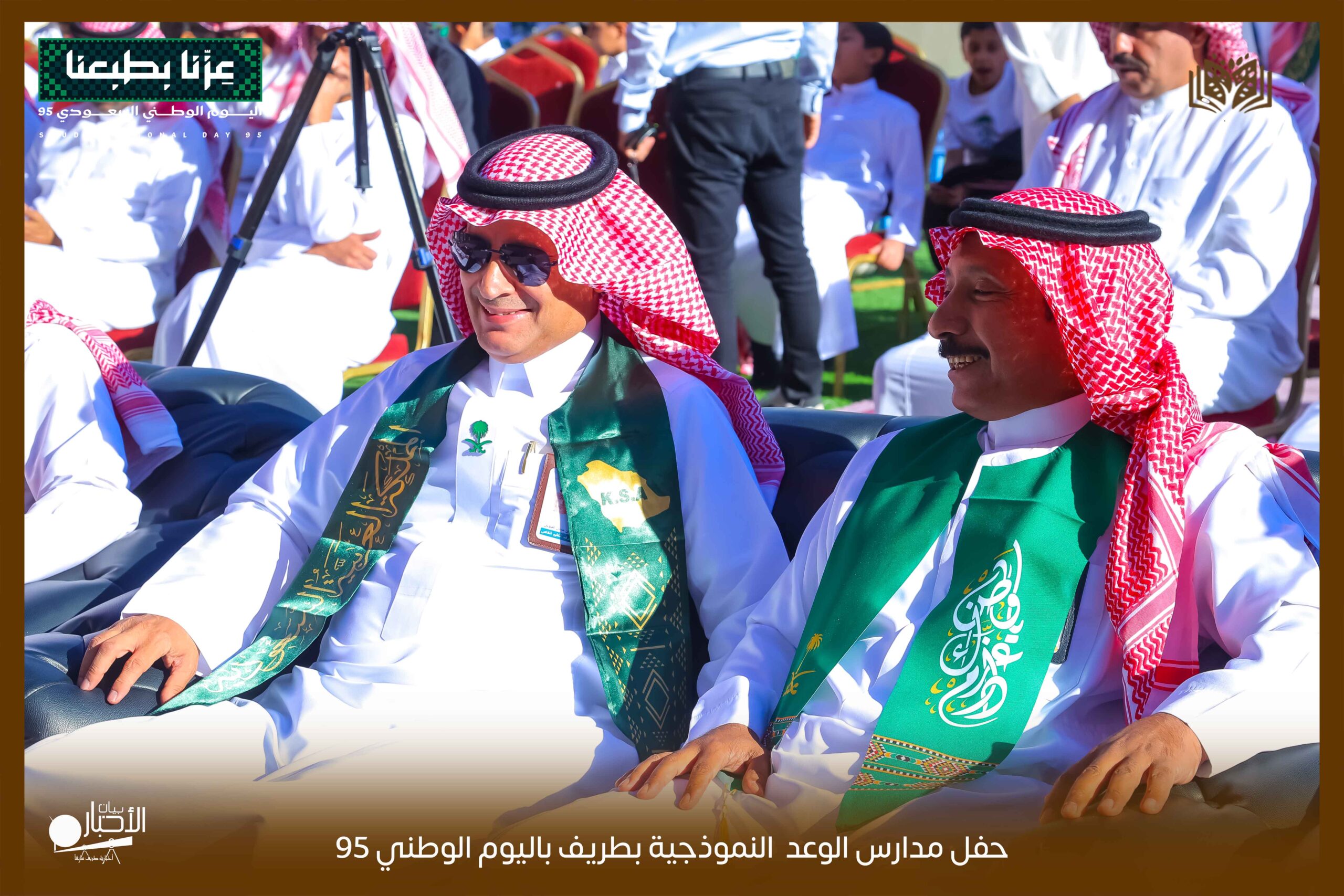أقامت مدارس الوعد النموذجية الأهلية حفلًا بمناسبة ذكرى( اليوم الوطني السعودي ٩٥ ) ، تلك الذكرى التي تجعلنا نشعر بالاعتزاز والفخر بالانتماء لهذا الوطن العظيم ، حيث بدأ الحفل بعرض السلام الملكي ثم آيات عطرة من الذكر الحكيم ثم كلمة مدير المدرسة الأستاذ إسماعيل صالح العنزي والذي رحب بالسادة الضيوف وأولياء الأمور وتقديم التهنئة للقيادة الحكيمة والشعب السعودي بهذه المناسبة ،ثم تتابعت فقرات الحفل ما بين مشهد لملوك المملكة وعرض مسرحي بعنوان ( عزنا بطبعنا ) ثم فقرة باللغة الإنجليزية في حب الوطن ثم ختم الحفل بأداء الطلاب للعارضة السعودية ٠
