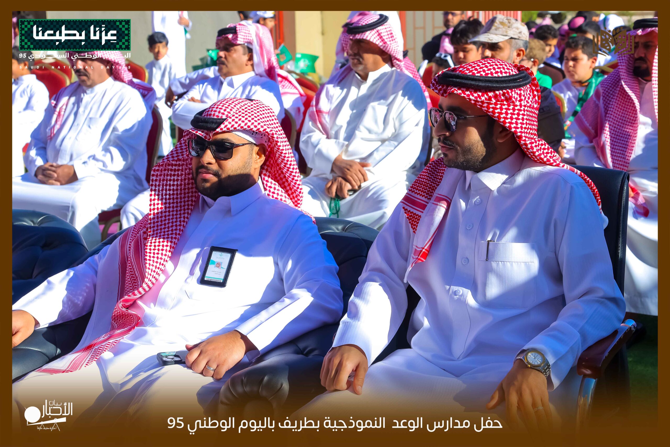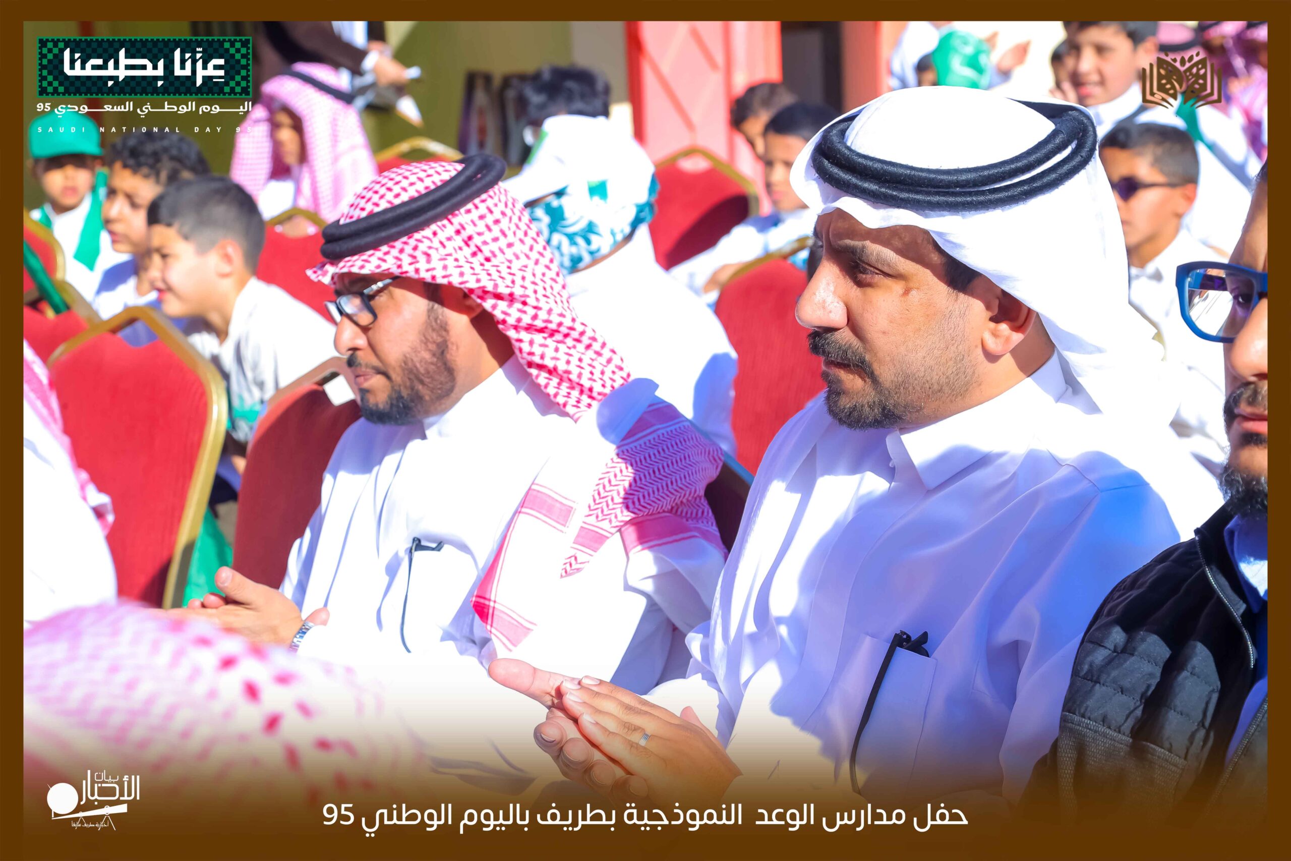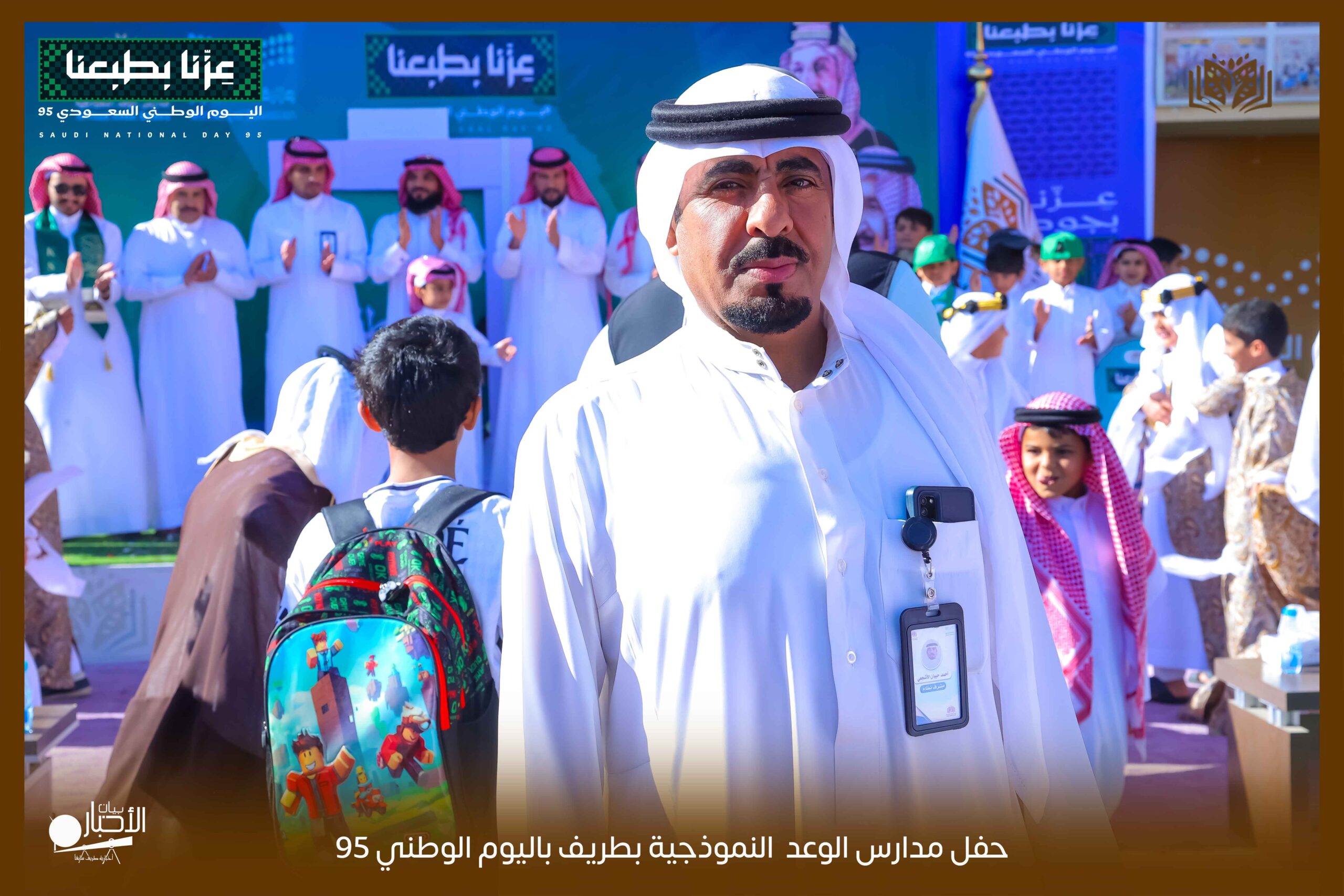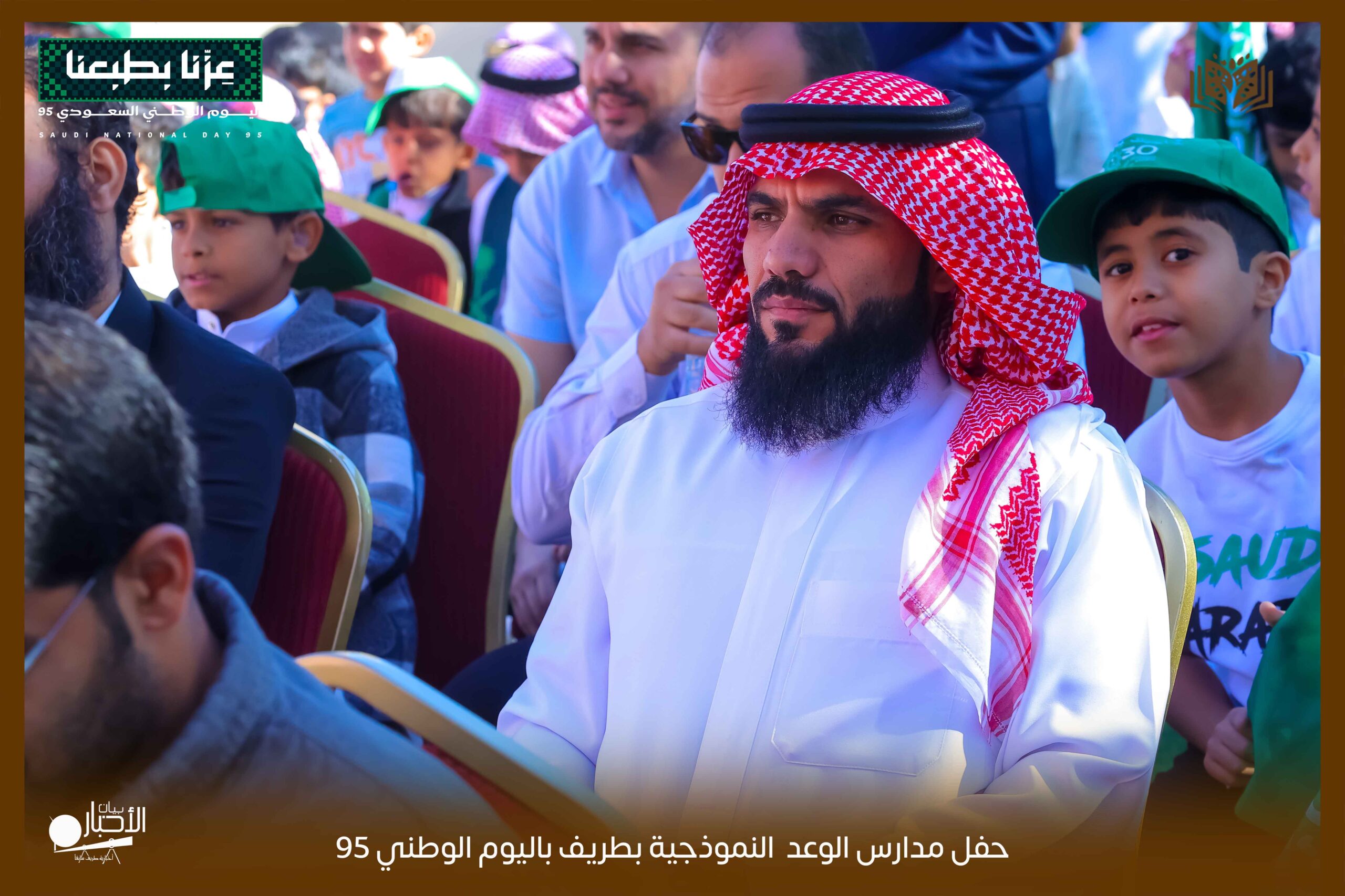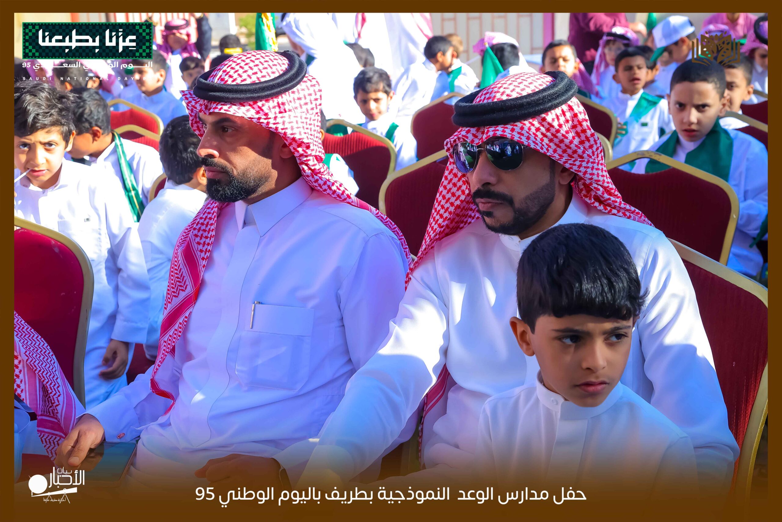 أقامت مدارس الوعد النموذجية الأهلية حفلًا بمناسبة ذكرى( اليوم الوطني السعودي ٩٥ ) ، تلك الذكرى التي تجعلنا نشعر بالاعتزاز والفخر بالانتماء لهذا الوطن العظيم ، حيث بدأ الحفل بعرض السلام الملكي ثم آيات عطرة من الذكر الحكيم ثم كلمة مدير المدرسة الأستاذ إسماعيل صالح العنزي والذي رحب بالسادة الضيوف وأولياء الأمور وتقديم التهنئة للقيادة الحكيمة والشعب السعودي بهذه المناسبة ،ثم تتابعت فقرات الحفل ما بين مشهد لملوك المملكة وعرض مسرحي بعنوان ( عزنا بطبعنا ) ثم فقرة باللغة الإنجليزية في حب الوطن ثم ختم الحفل بأداء الطلاب للعارضة السعودية ٠