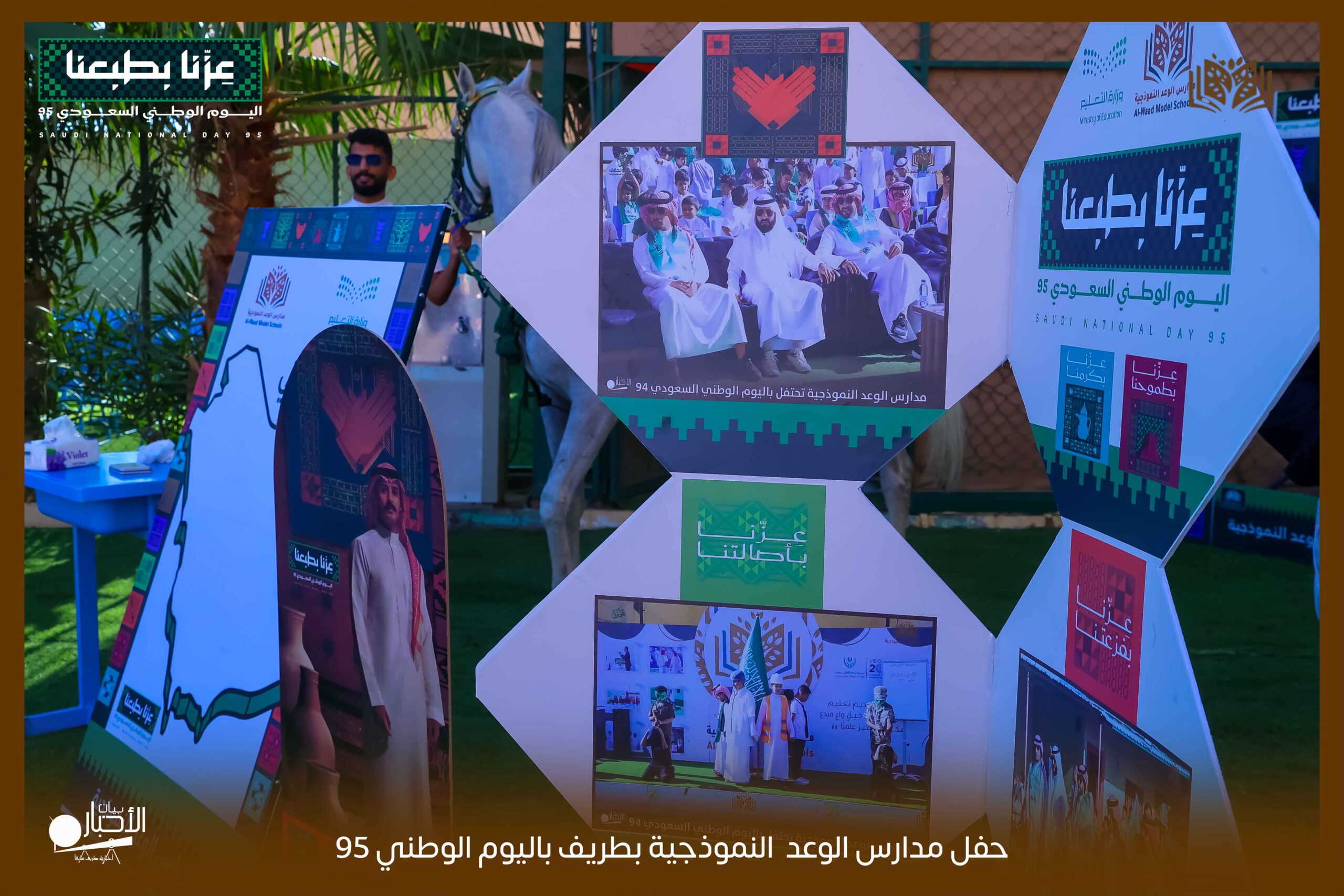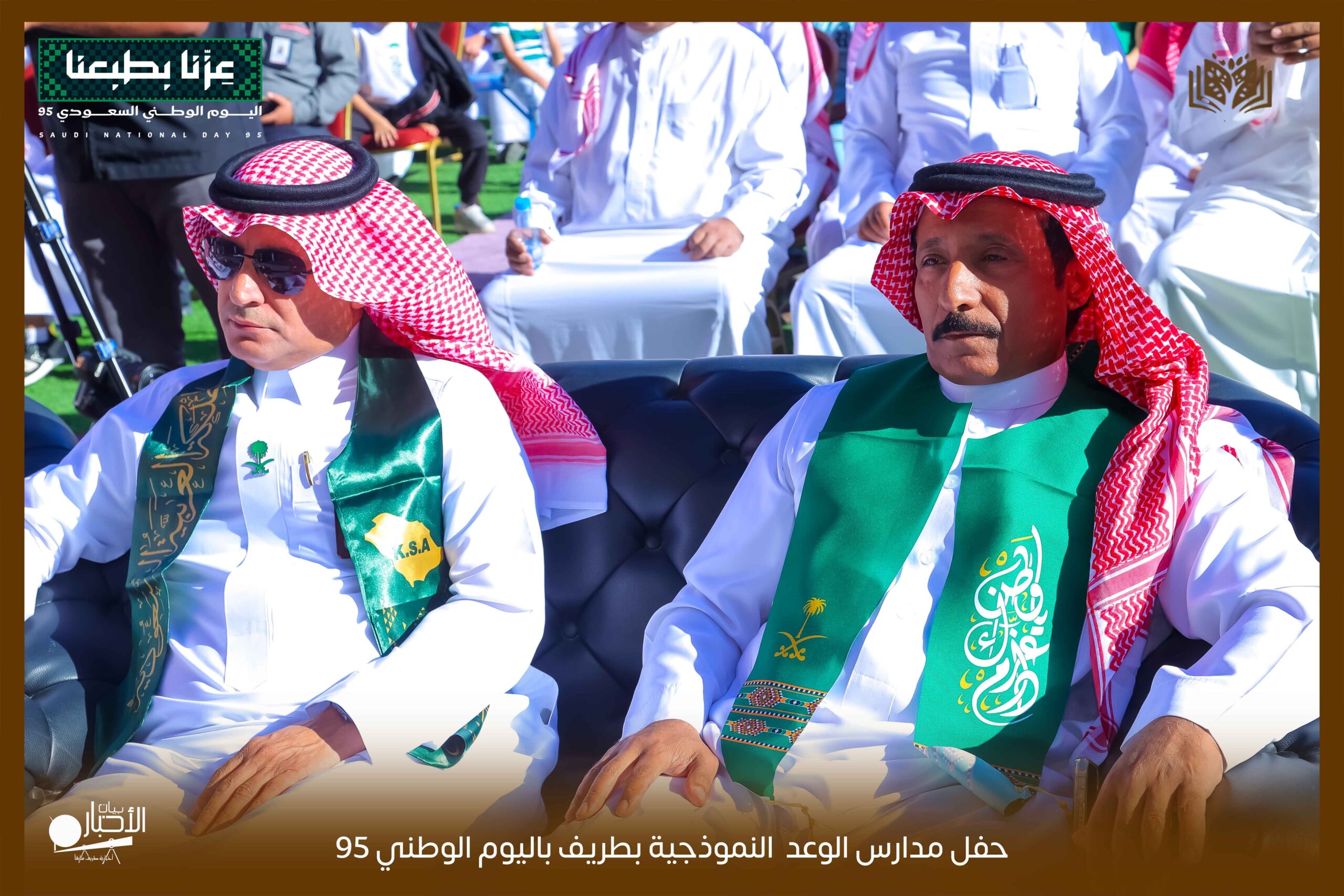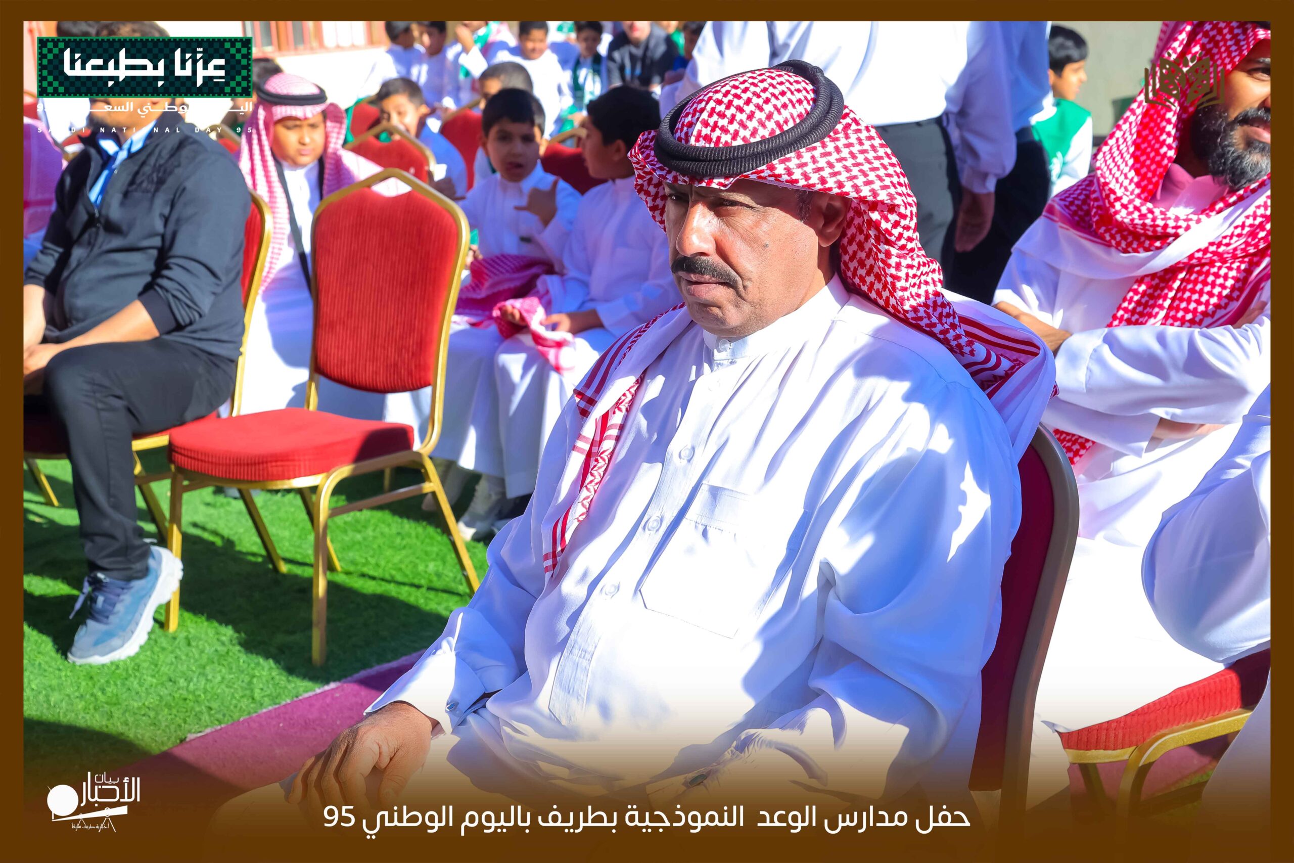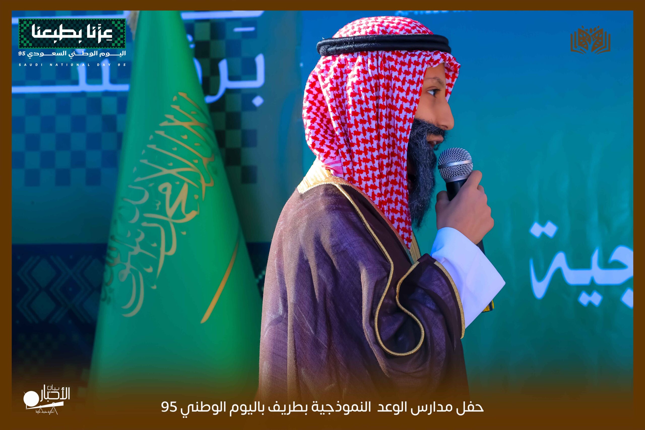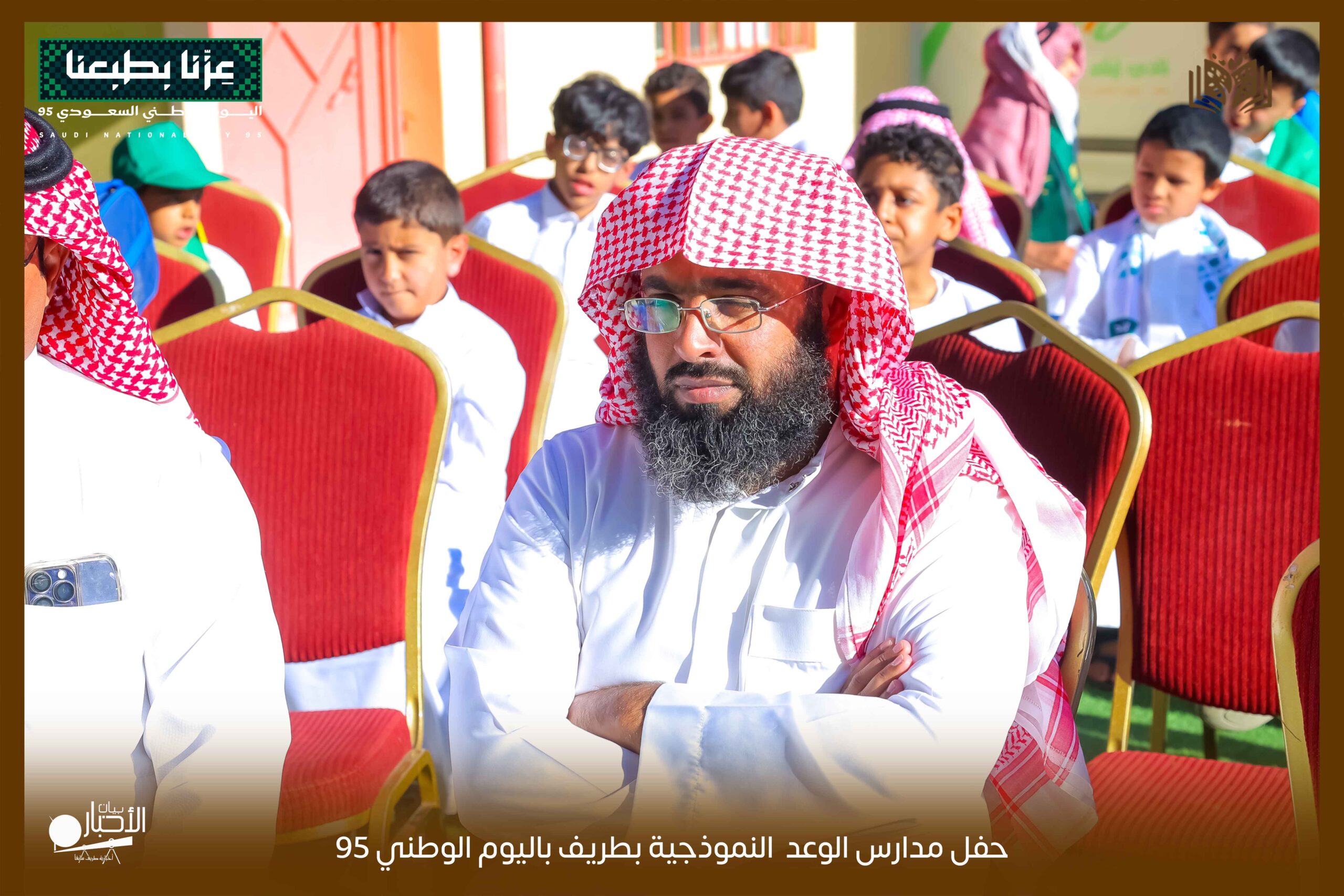 أقامت مدارس الوعد النموذجية الأهلية حفلًا بمناسبة ذكرى( اليوم الوطني السعودي ٩٥ ) ، تلك الذكرى التي تجعلنا نشعر بالاعتزاز والفخر بالانتماء لهذا الوطن العظيم ، حيث بدأ الحفل بعرض السلام الملكي ثم آيات عطرة من الذكر الحكيم ثم كلمة مدير المدرسة الأستاذ إسماعيل صالح العنزي والذي رحب بالسادة الضيوف وأولياء الأمور وتقديم التهنئة للقيادة الحكيمة والشعب السعودي بهذه المناسبة ،ثم تتابعت فقرات الحفل ما بين مشهد لملوك المملكة وعرض مسرحي بعنوان ( عزنا بطبعنا ) ثم فقرة باللغة الإنجليزية في حب الوطن ثم ختم الحفل بأداء الطلاب للعارضة السعودية ٠