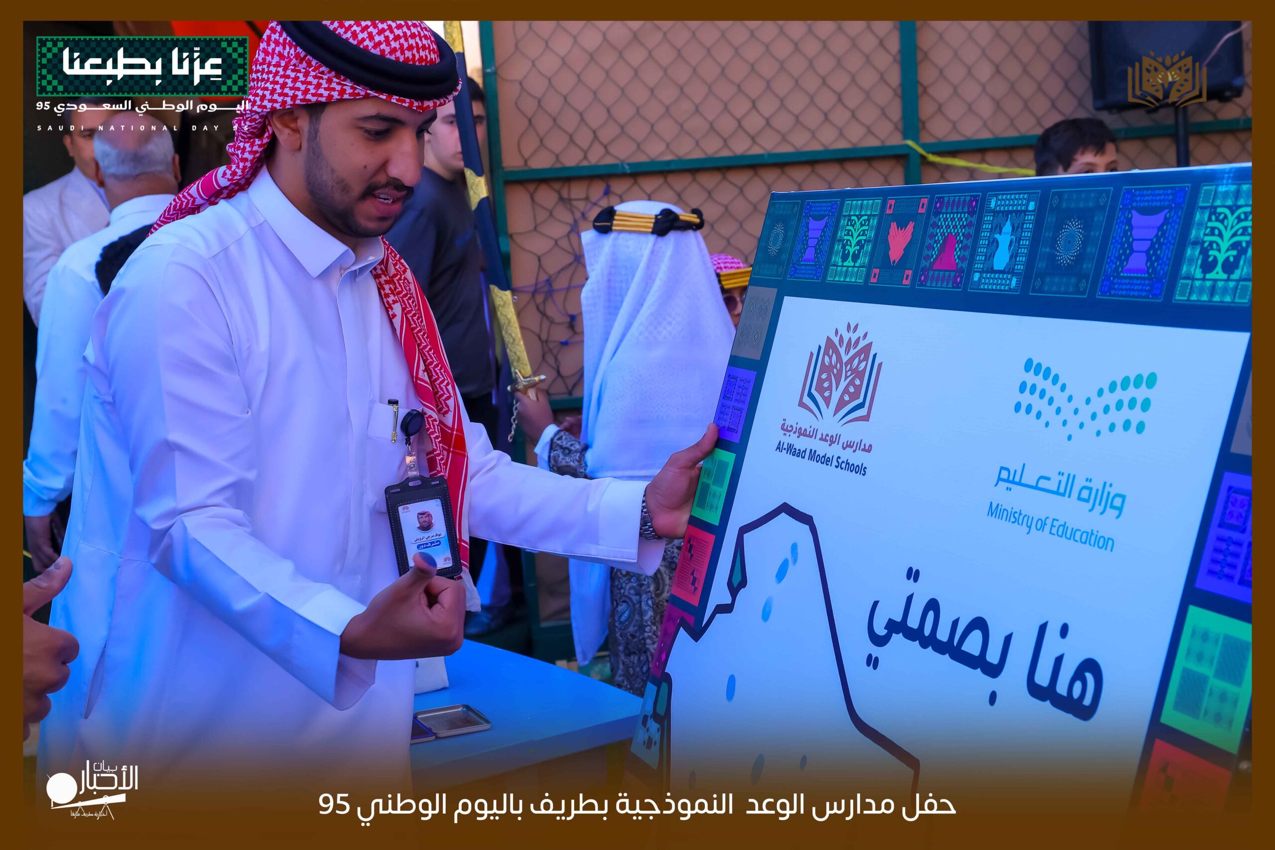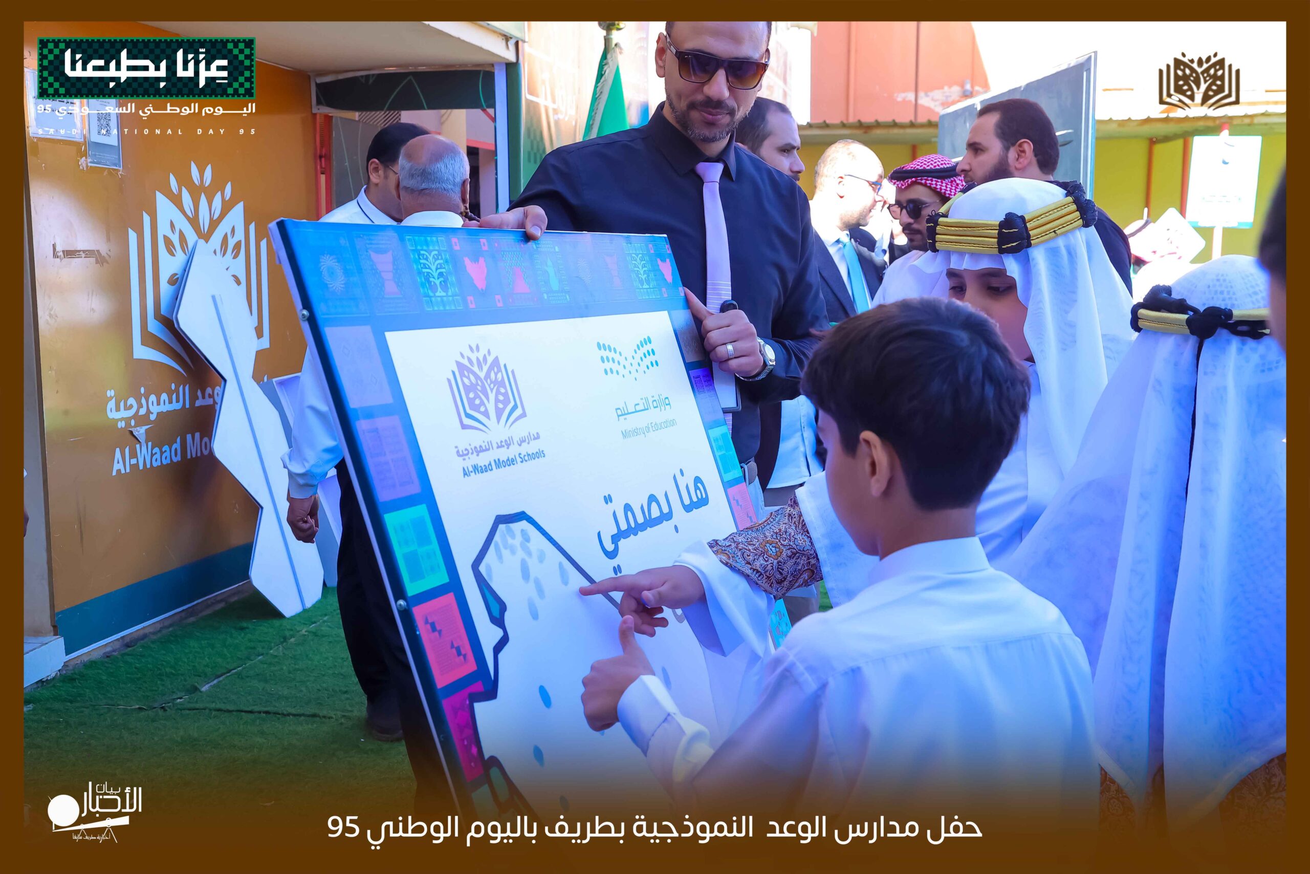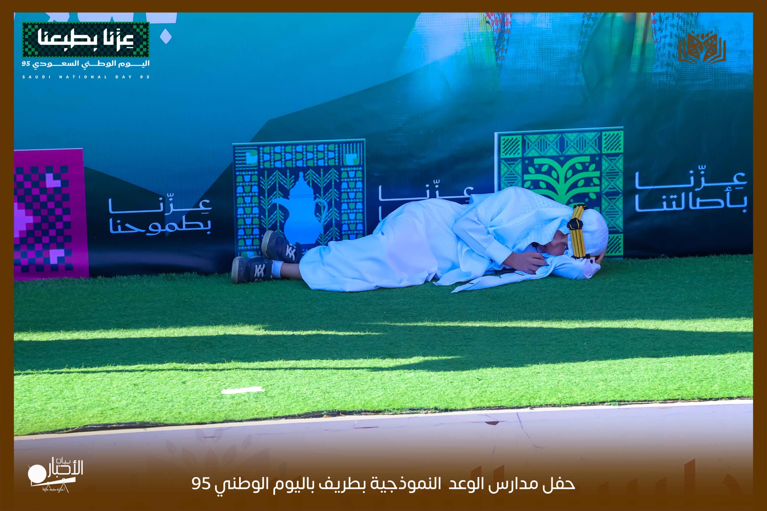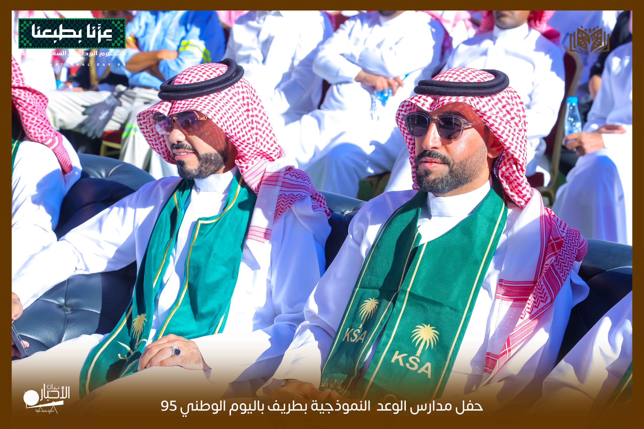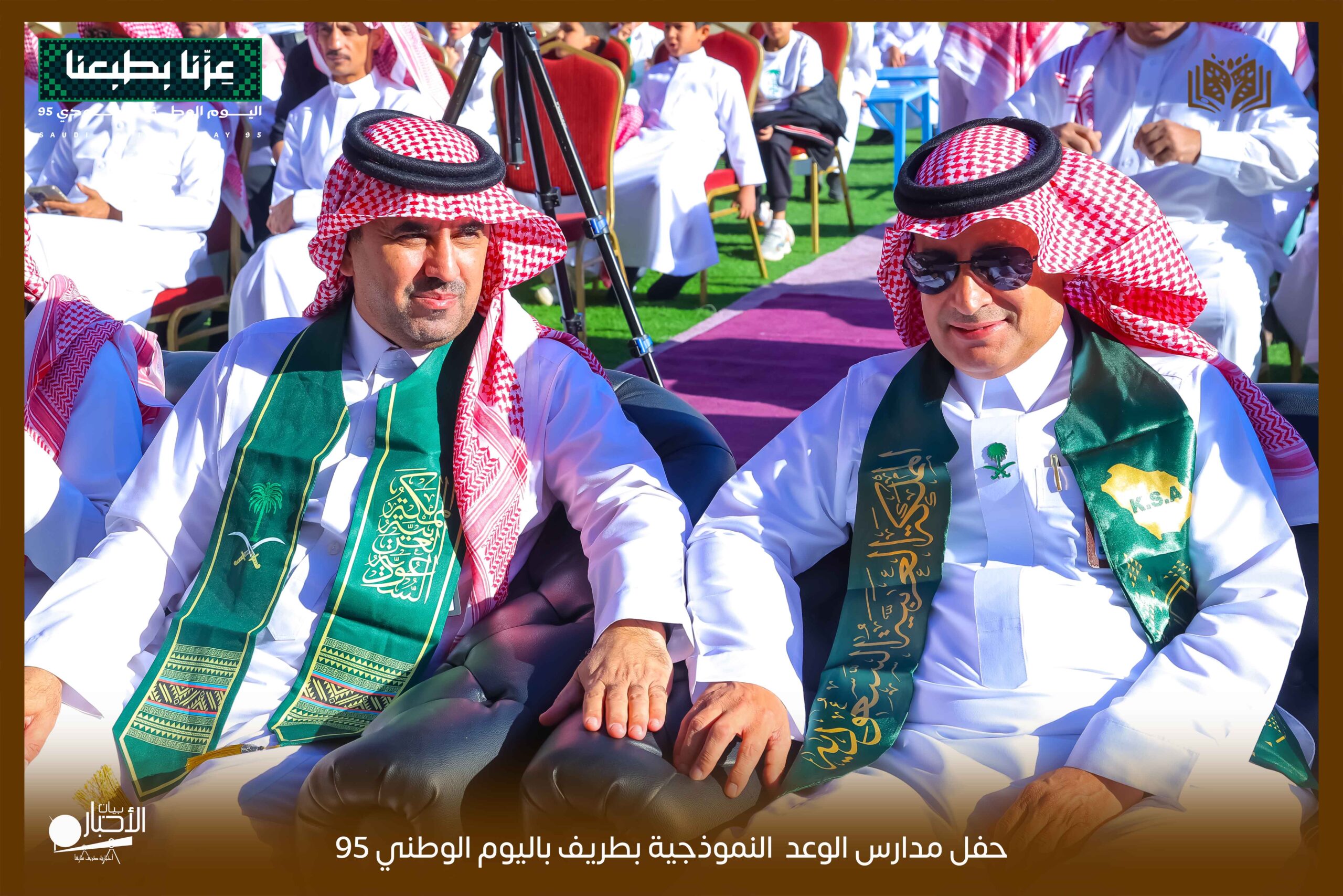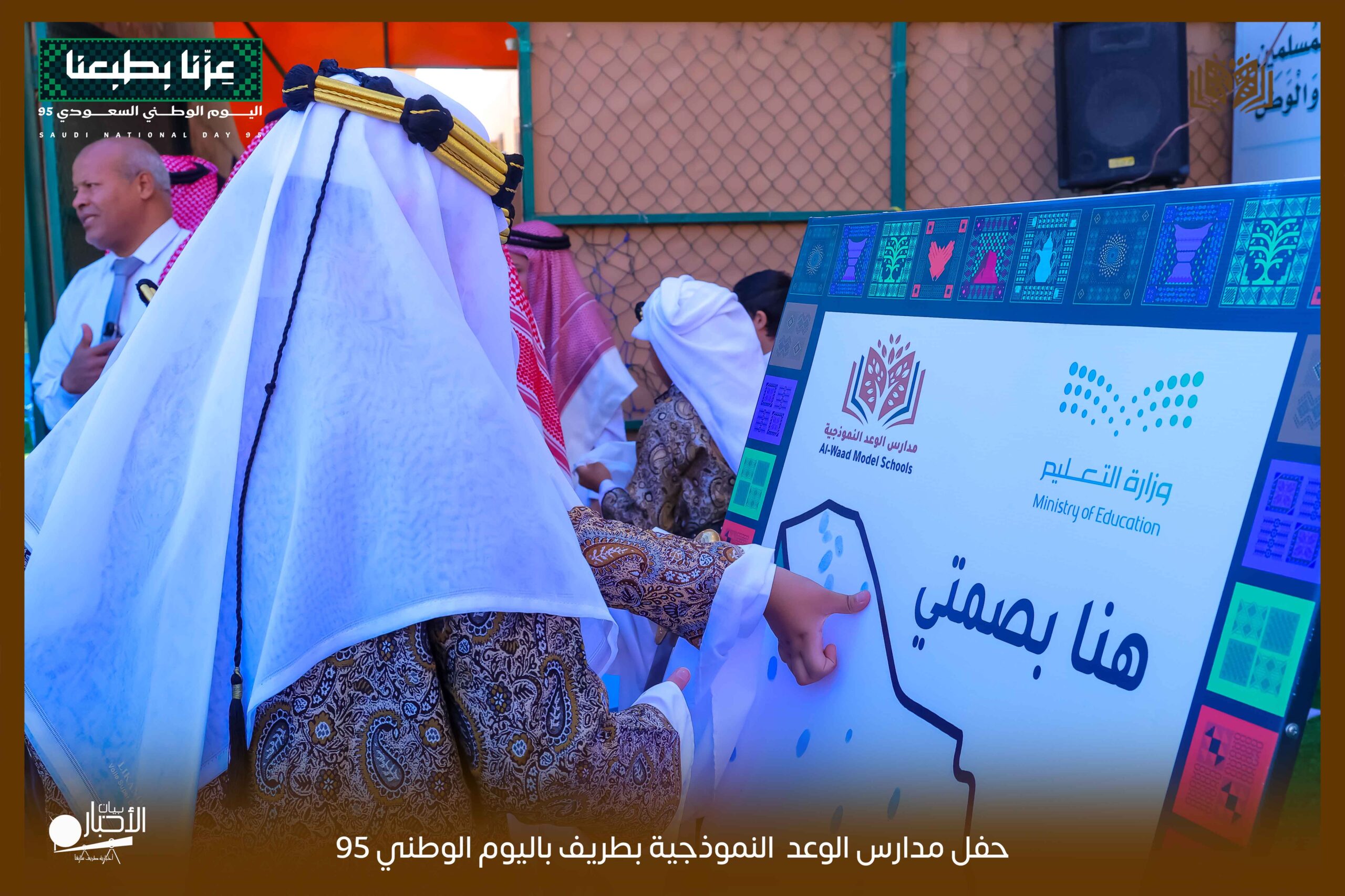 أقامت مدارس الوعد النموذجية الأهلية حفلًا بمناسبة ذكرى( اليوم الوطني السعودي ٩٥ ) ، تلك الذكرى التي تجعلنا نشعر بالاعتزاز والفخر بالانتماء لهذا الوطن العظيم ، حيث بدأ الحفل بعرض السلام الملكي ثم آيات عطرة من الذكر الحكيم ثم كلمة مدير المدرسة الأستاذ إسماعيل صالح العنزي والذي رحب بالسادة الضيوف وأولياء الأمور وتقديم التهنئة للقيادة الحكيمة والشعب السعودي بهذه المناسبة ،ثم تتابعت فقرات الحفل ما بين مشهد لملوك المملكة وعرض مسرحي بعنوان ( عزنا بطبعنا ) ثم فقرة باللغة الإنجليزية في حب الوطن ثم ختم الحفل بأداء الطلاب للعارضة السعودية ٠