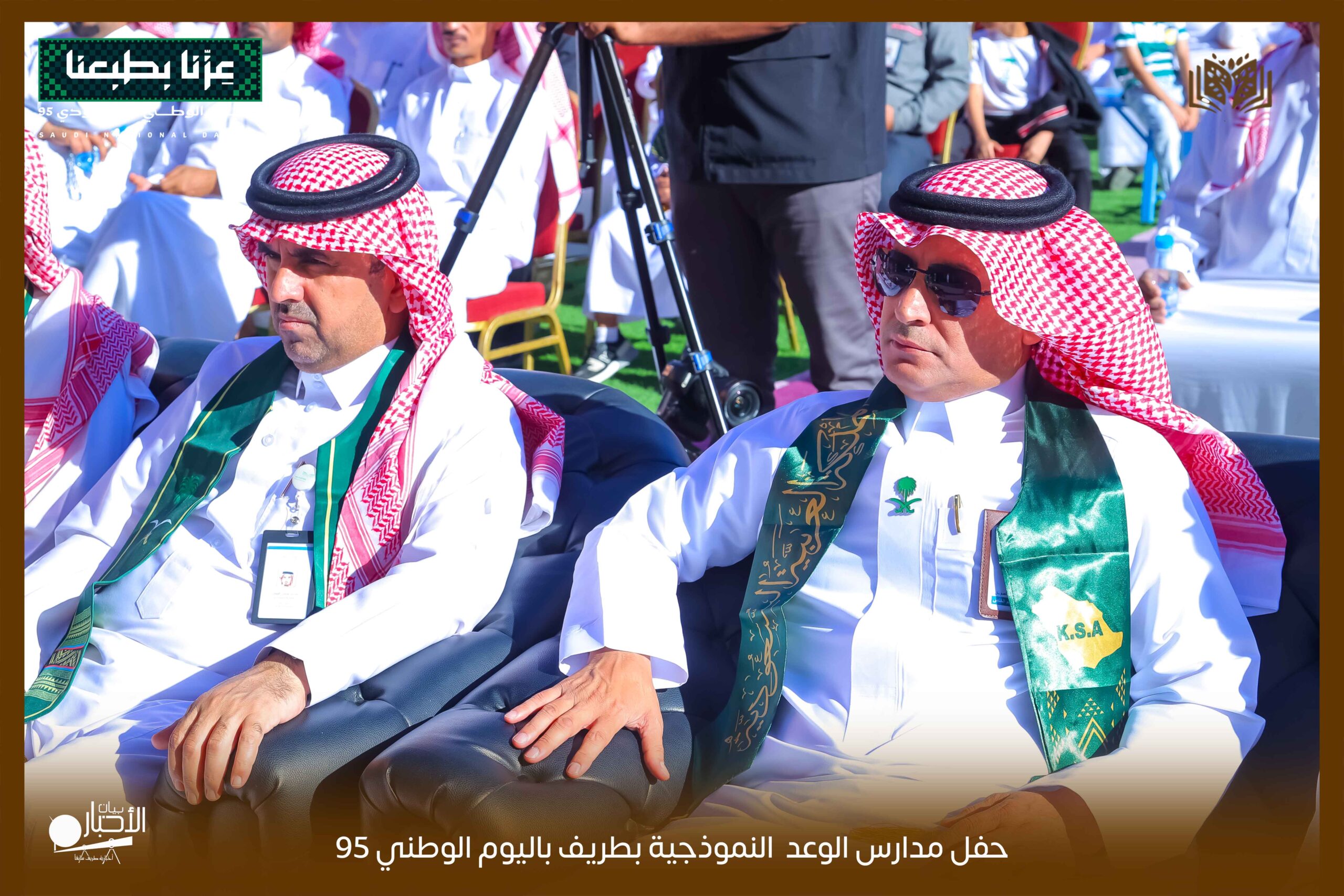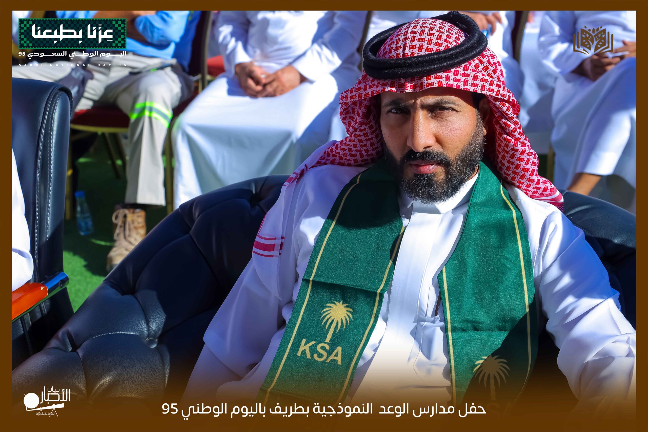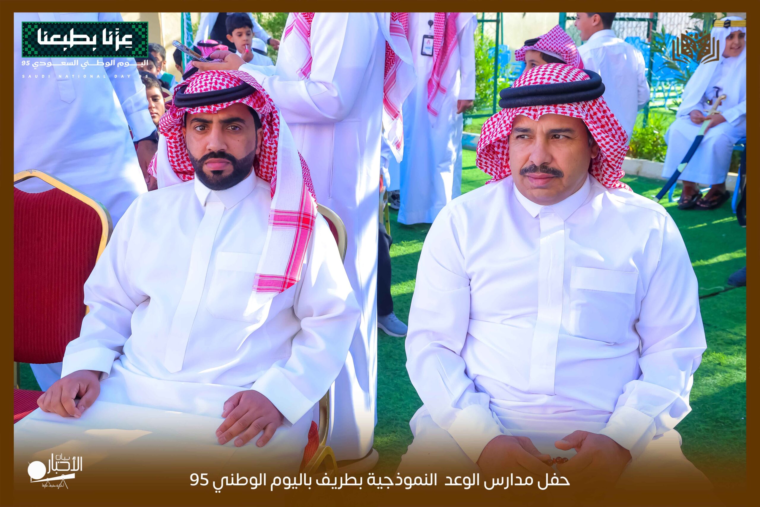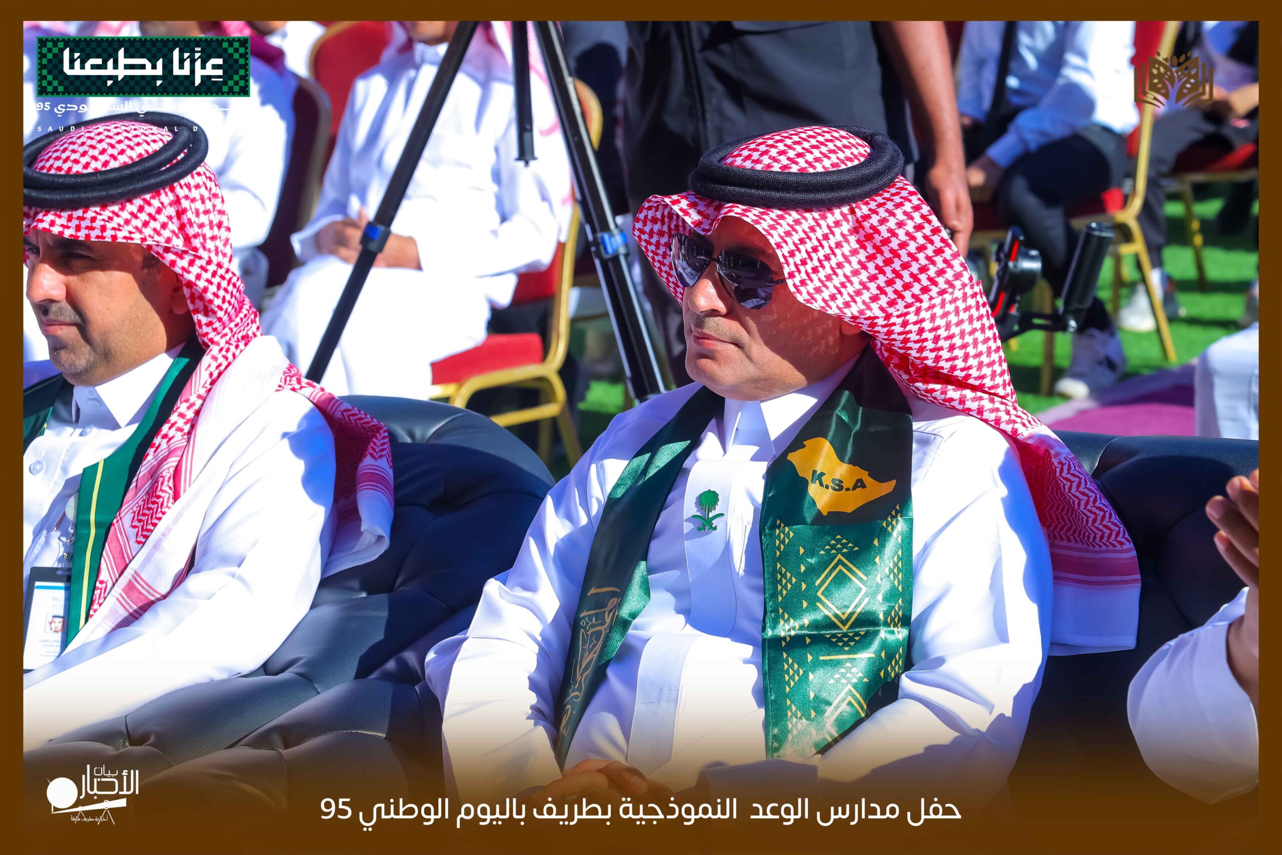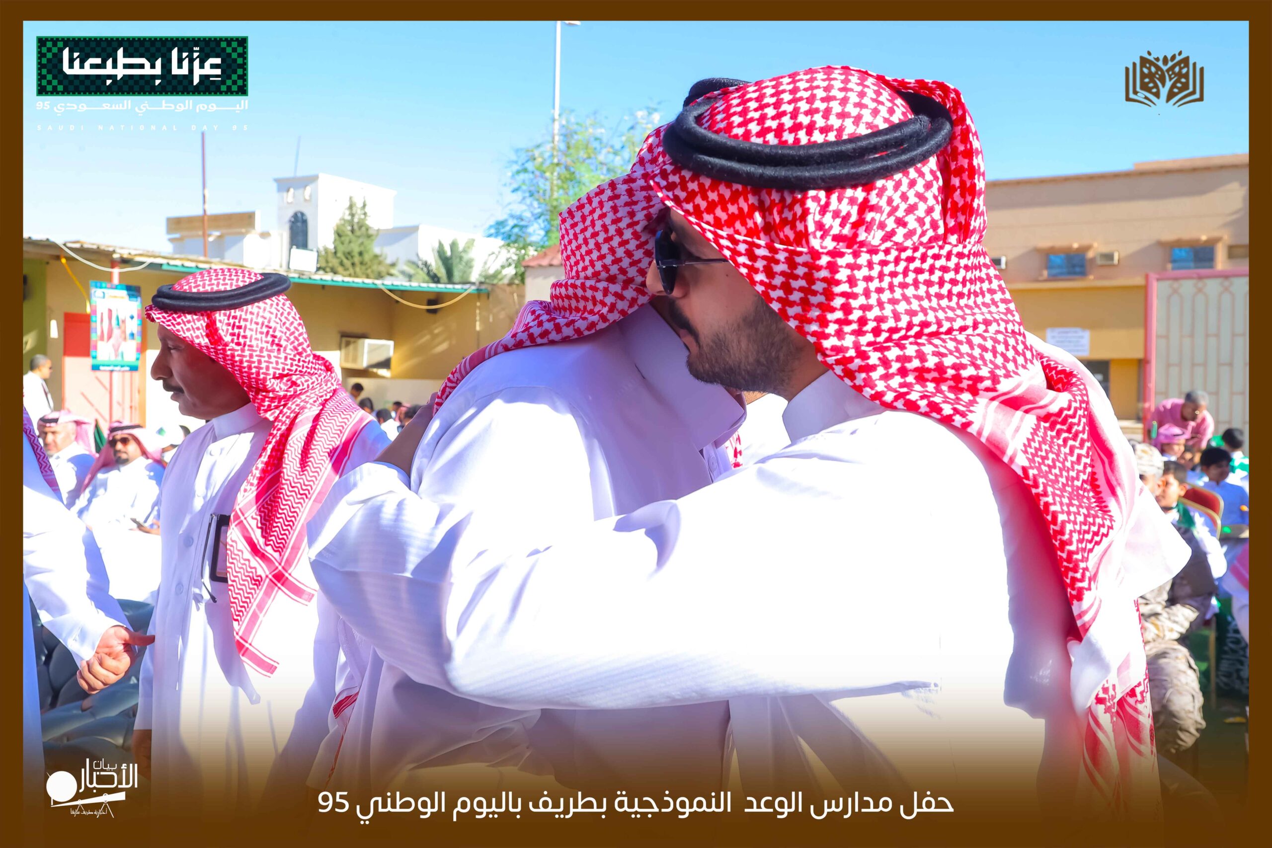 أقامت مدارس الوعد النموذجية الأهلية حفلًا بمناسبة ذكرى( اليوم الوطني السعودي ٩٥ ) ، تلك الذكرى التي تجعلنا نشعر بالاعتزاز والفخر بالانتماء لهذا الوطن العظيم ، حيث بدأ الحفل بعرض السلام الملكي ثم آيات عطرة من الذكر الحكيم ثم كلمة مدير المدرسة الأستاذ إسماعيل صالح العنزي والذي رحب بالسادة الضيوف وأولياء الأمور وتقديم التهنئة للقيادة الحكيمة والشعب السعودي بهذه المناسبة ،ثم تتابعت فقرات الحفل ما بين مشهد لملوك المملكة وعرض مسرحي بعنوان ( عزنا بطبعنا ) ثم فقرة باللغة الإنجليزية في حب الوطن ثم ختم الحفل بأداء الطلاب للعارضة السعودية ٠