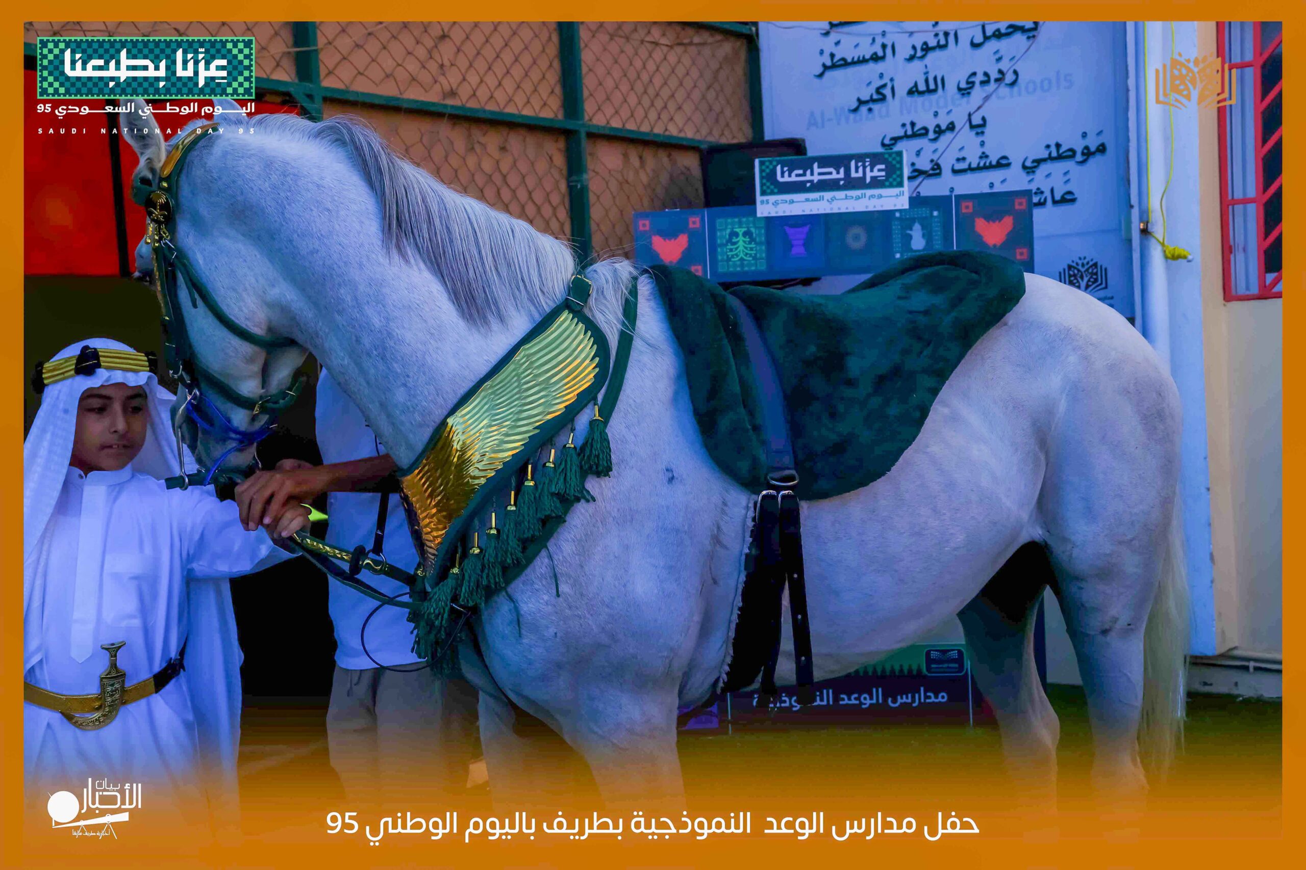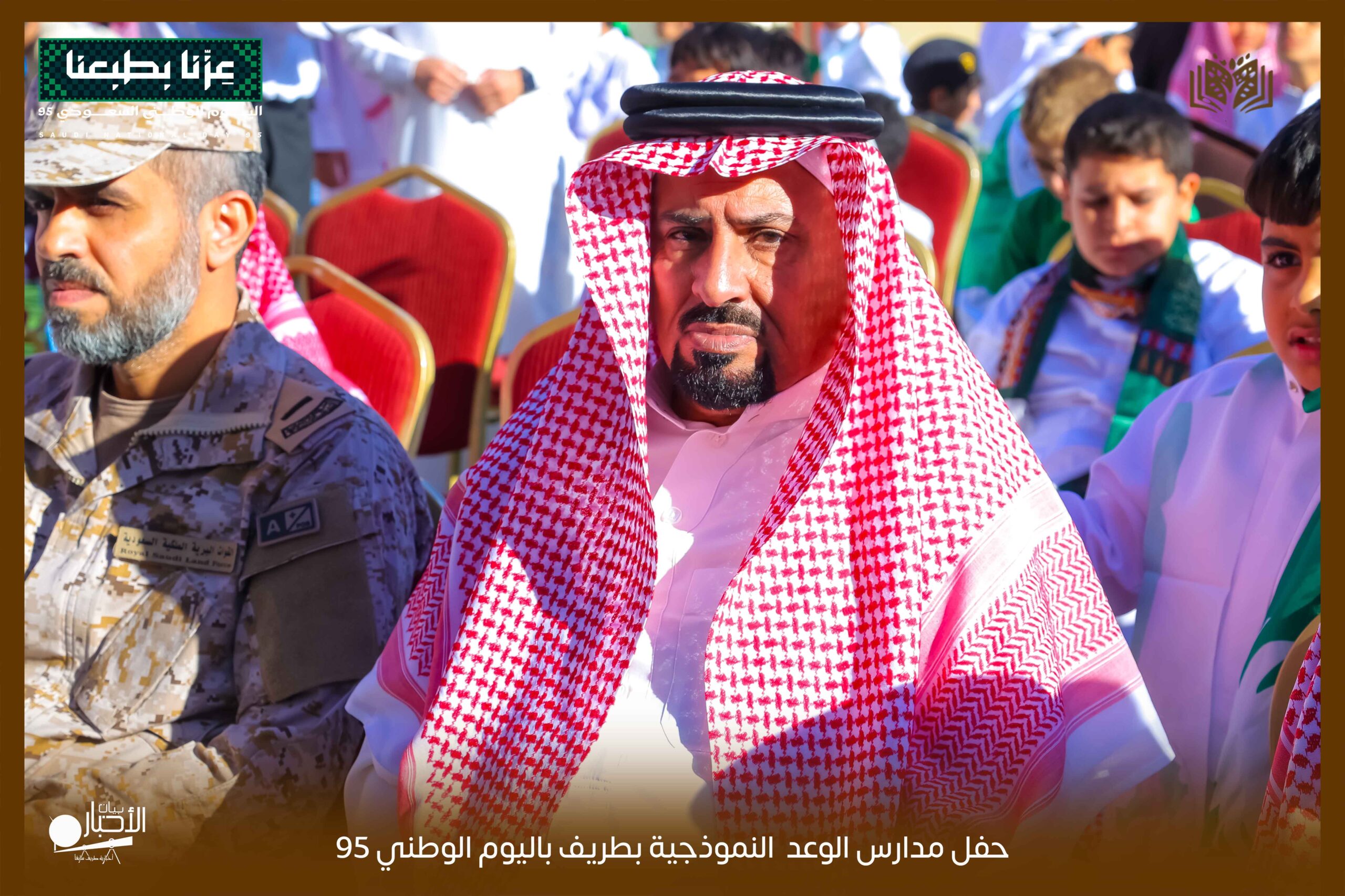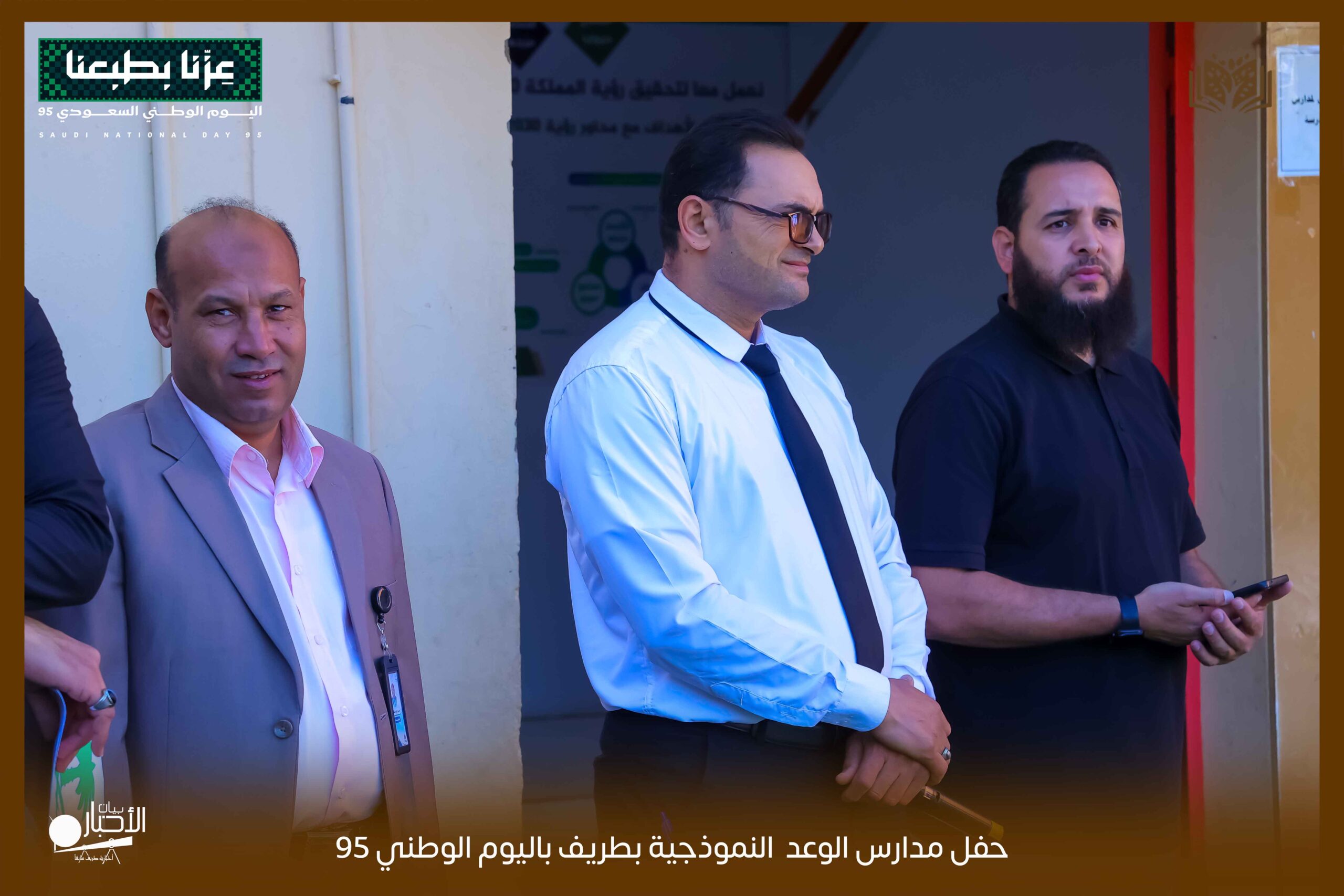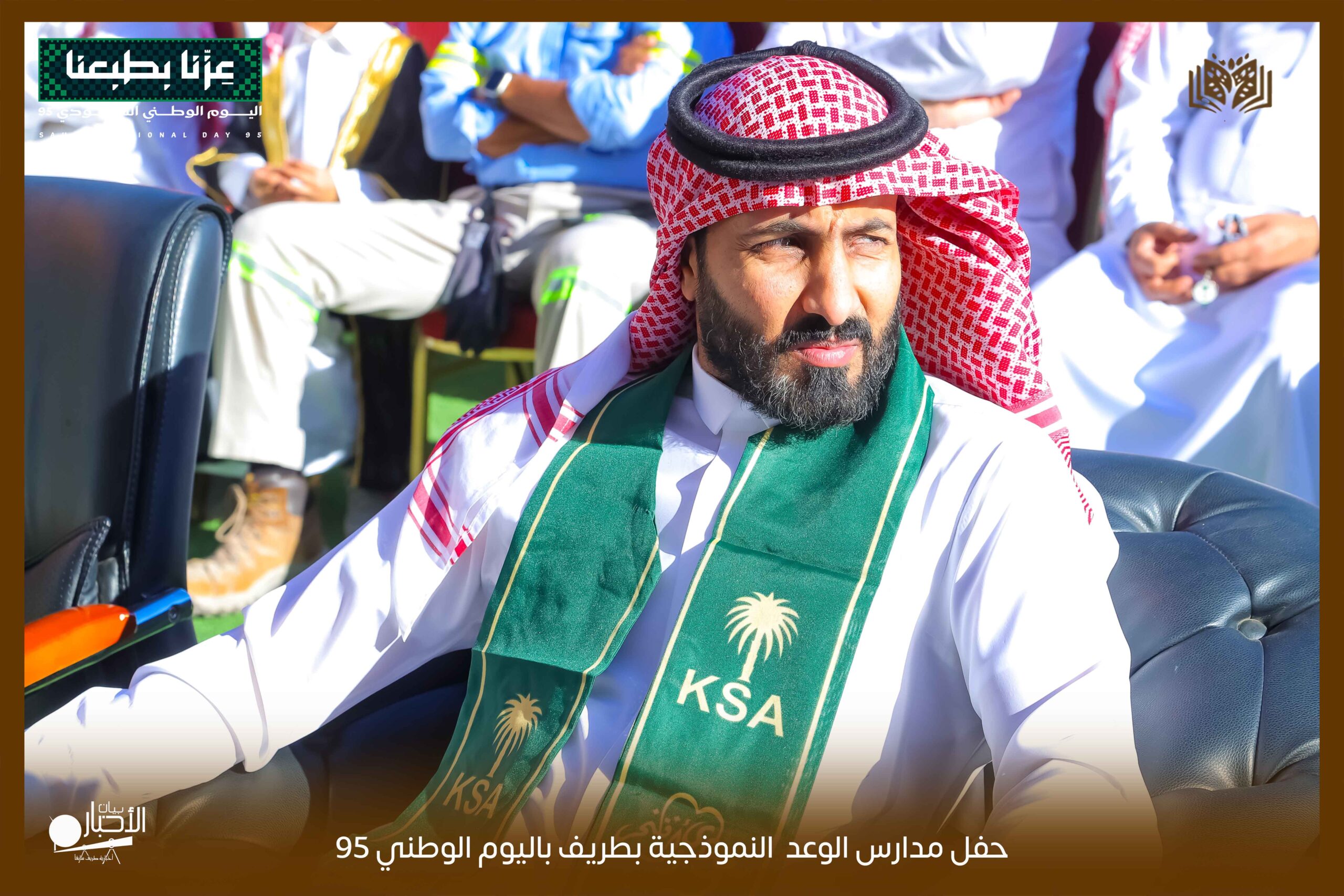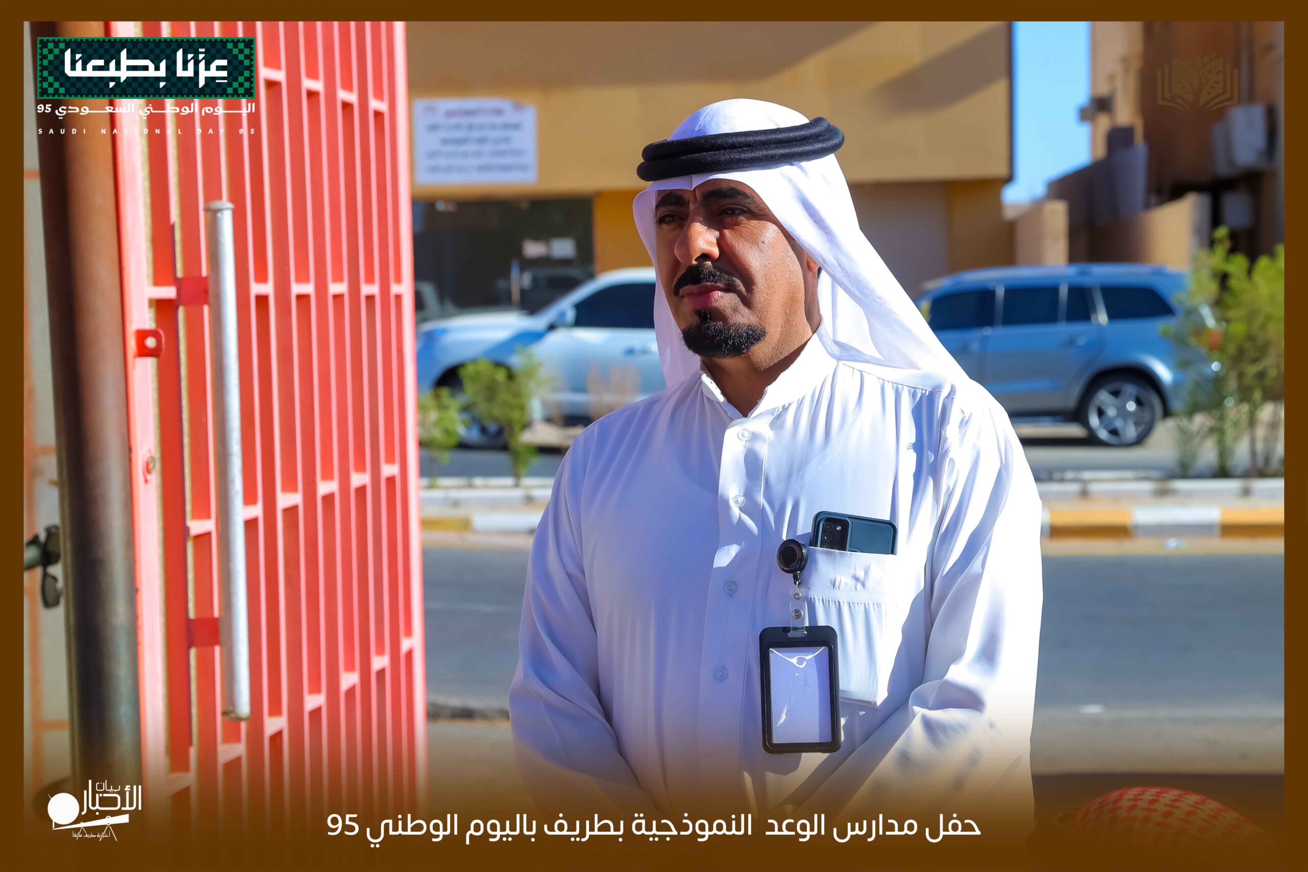 أقامت مدارس الوعد النموذجية الأهلية حفلًا بمناسبة ذكرى( اليوم الوطني السعودي ٩٥ ) ، تلك الذكرى التي تجعلنا نشعر بالاعتزاز والفخر بالانتماء لهذا الوطن العظيم ، حيث بدأ الحفل بعرض السلام الملكي ثم آيات عطرة من الذكر الحكيم ثم كلمة مدير المدرسة الأستاذ إسماعيل صالح العنزي والذي رحب بالسادة الضيوف وأولياء الأمور وتقديم التهنئة للقيادة الحكيمة والشعب السعودي بهذه المناسبة ،ثم تتابعت فقرات الحفل ما بين مشهد لملوك المملكة وعرض مسرحي بعنوان ( عزنا بطبعنا ) ثم فقرة باللغة الإنجليزية في حب الوطن ثم ختم الحفل بأداء الطلاب للعارضة السعودية ٠