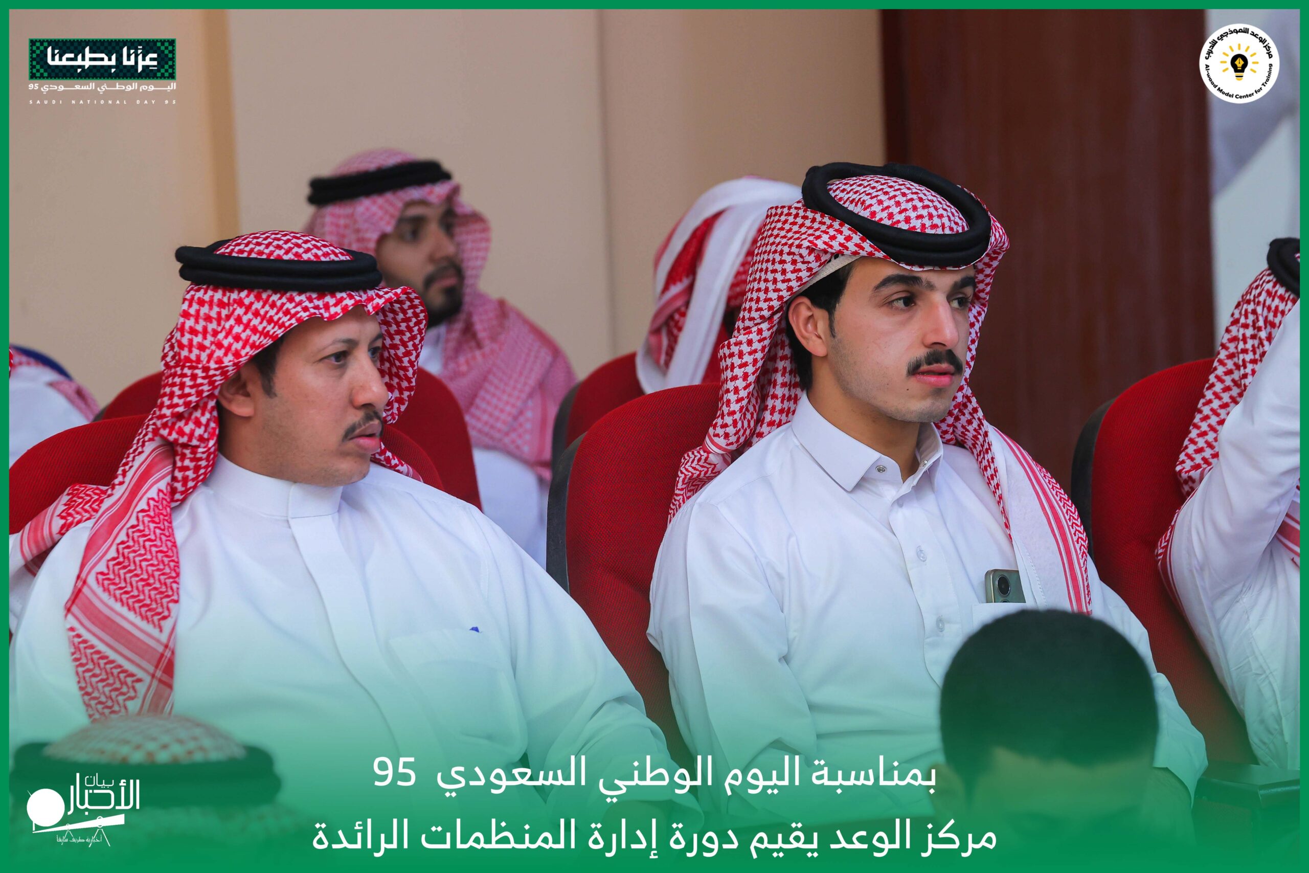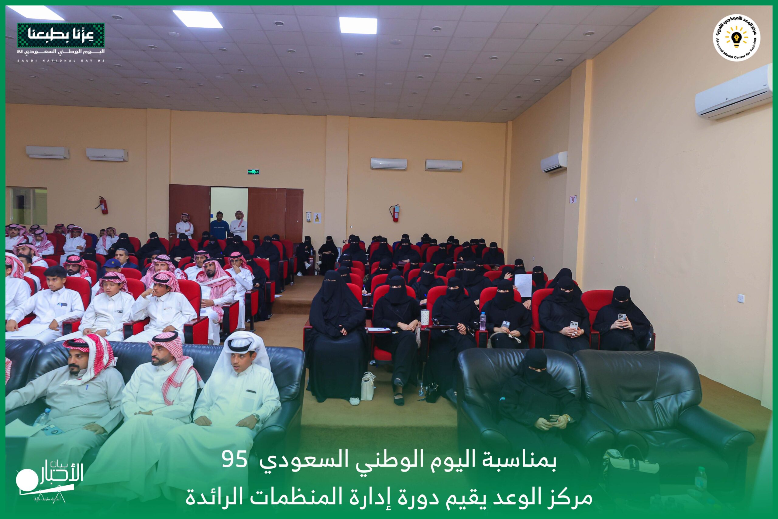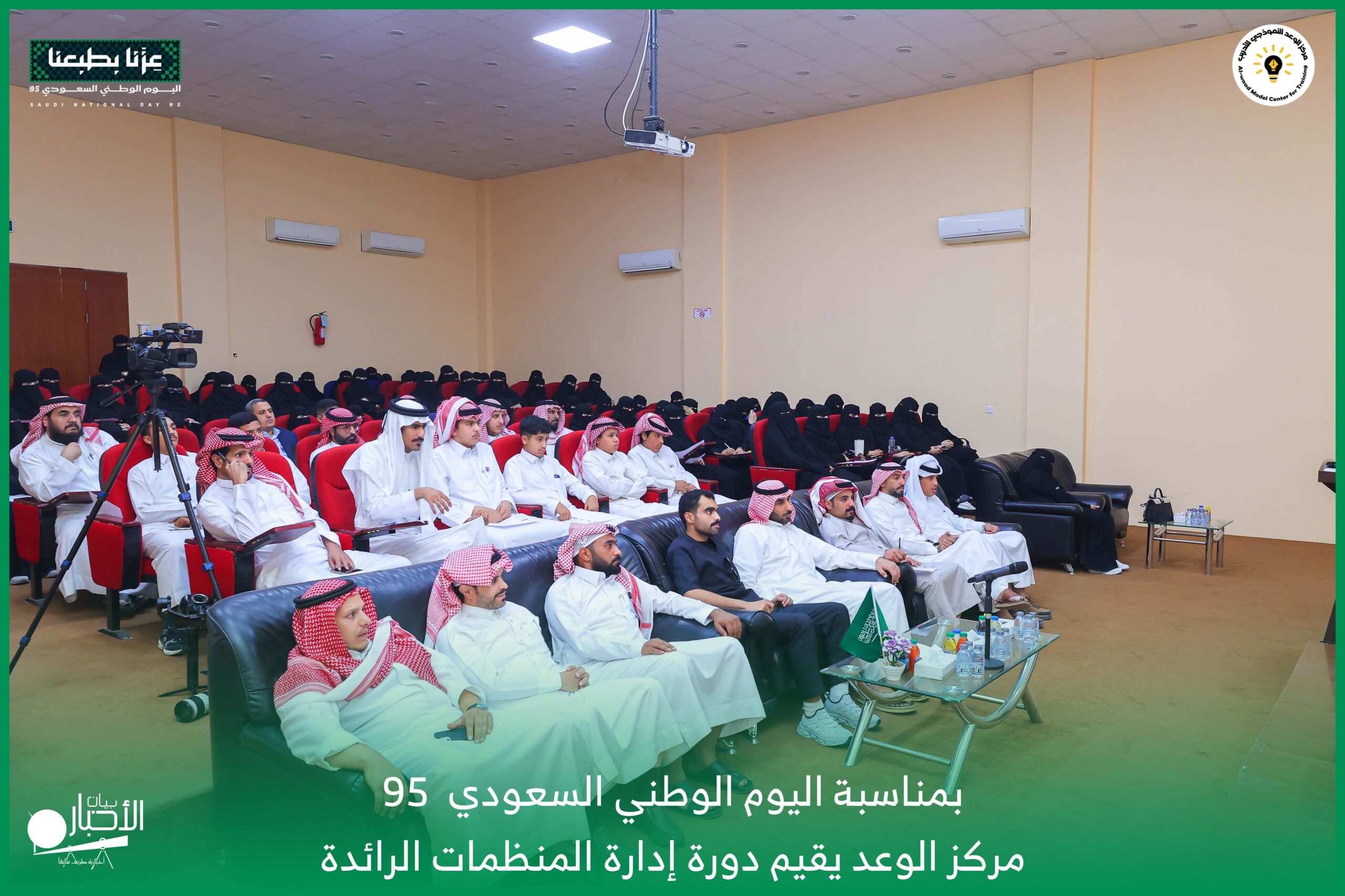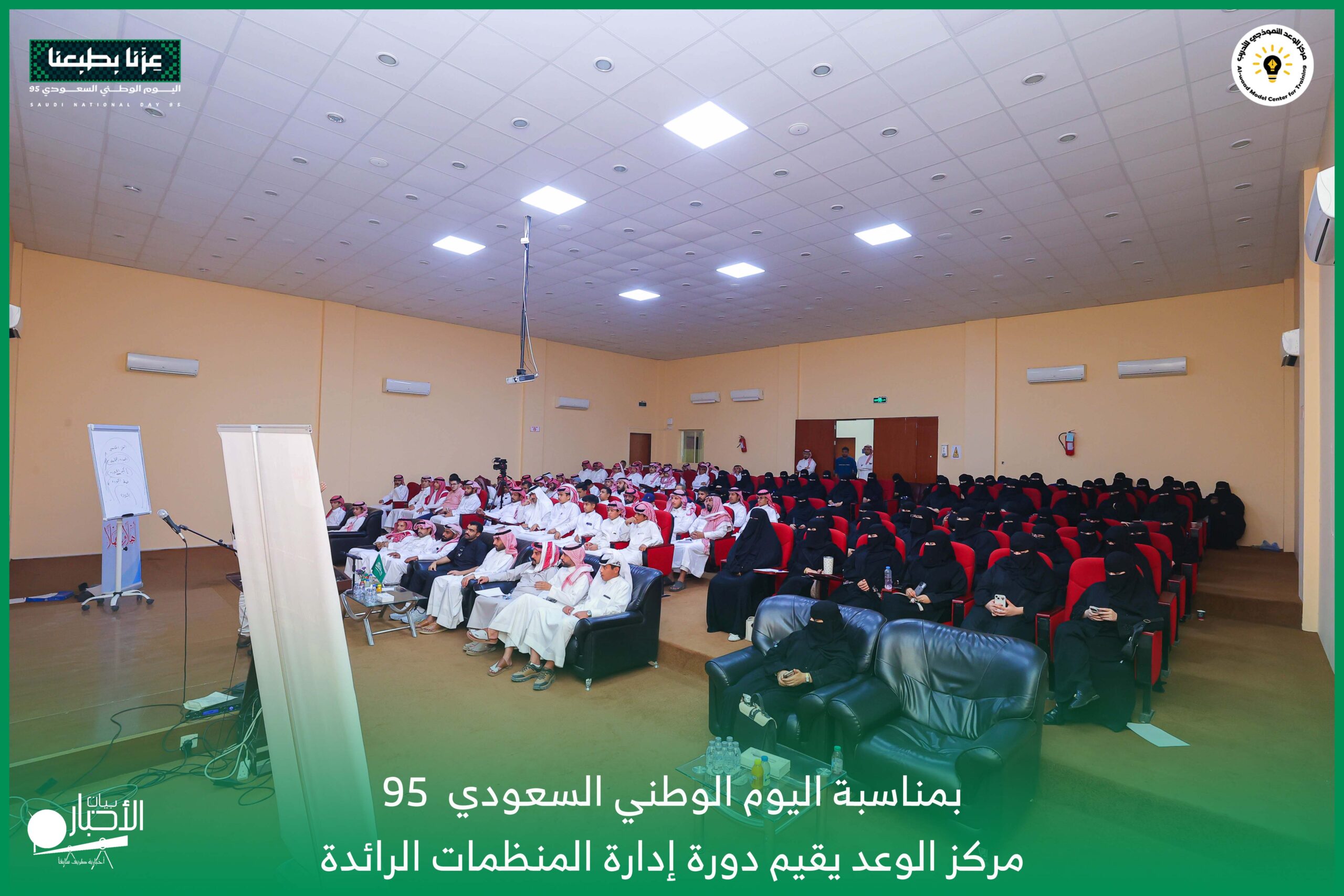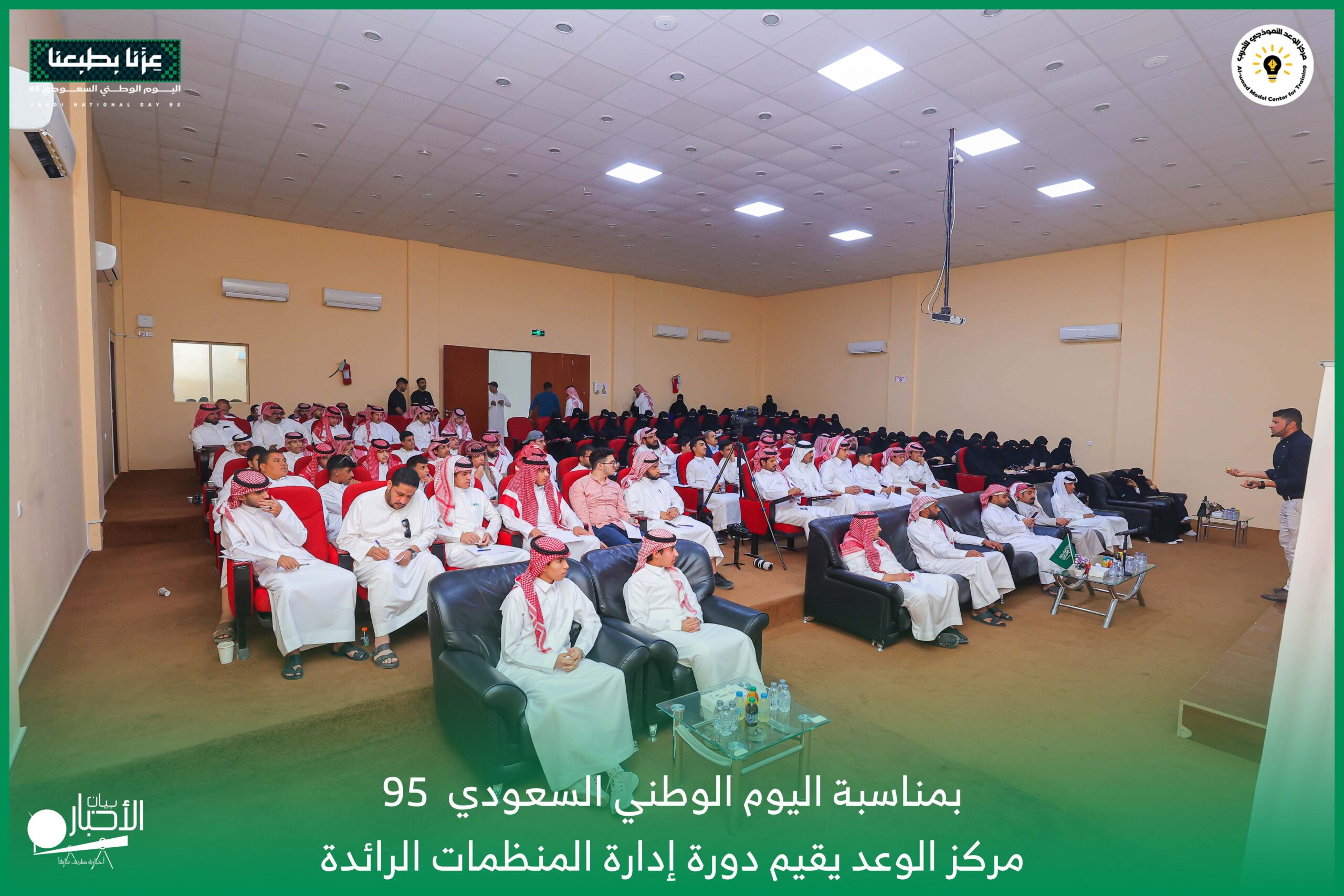 نظم مركز الوعد النموذجي للتدريب دورة تدريبية بعنوان “إدارة المنظمات الرائدة”، وذلك بمناسبة اليوم الوطني السعودي الـ95 ، وفي إطار مساهمته في تنمية المهارات وبناء القدرات المجتمعية.