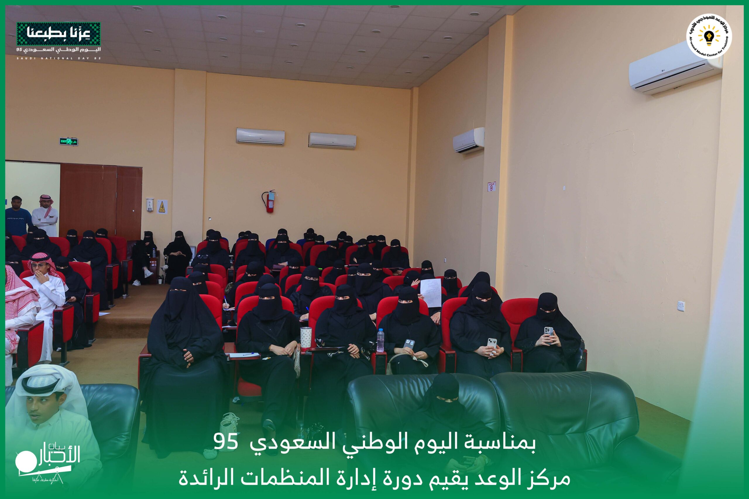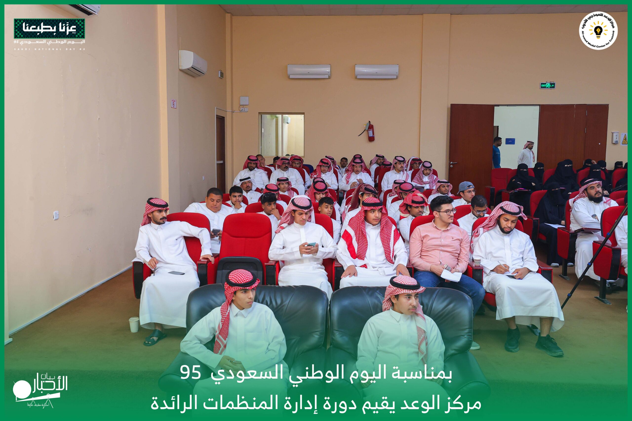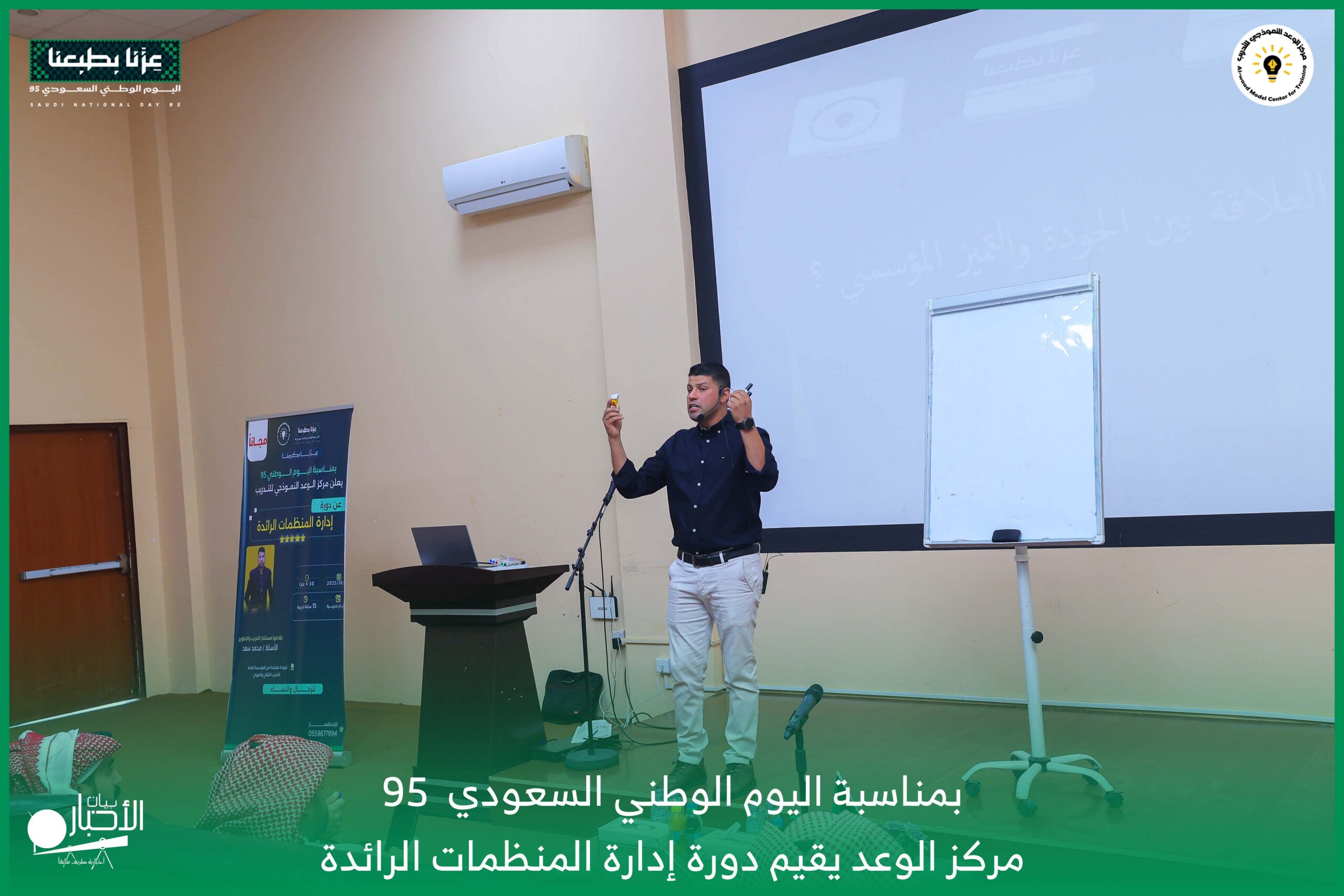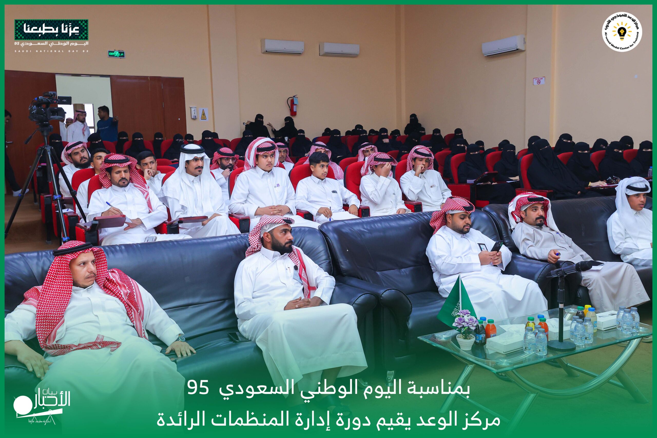 نظم مركز الوعد النموذجي للتدريب دورة تدريبية بعنوان “إدارة المنظمات الرائدة”، وذلك بمناسبة اليوم الوطني السعودي الـ95 ، وفي إطار مساهمته في تنمية المهارات وبناء القدرات المجتمعية.