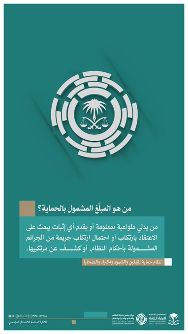 أوضحت النيابة العامة أن نظام حماية المبلغين والشهود والخبراء والضحايا يكفل توفير الحماية لكل من يُسهم في الكشف عن الجرائم، ويضمن عدم تعرضه لأي ضرر، من خلال إجراءات وضمانات محددة.