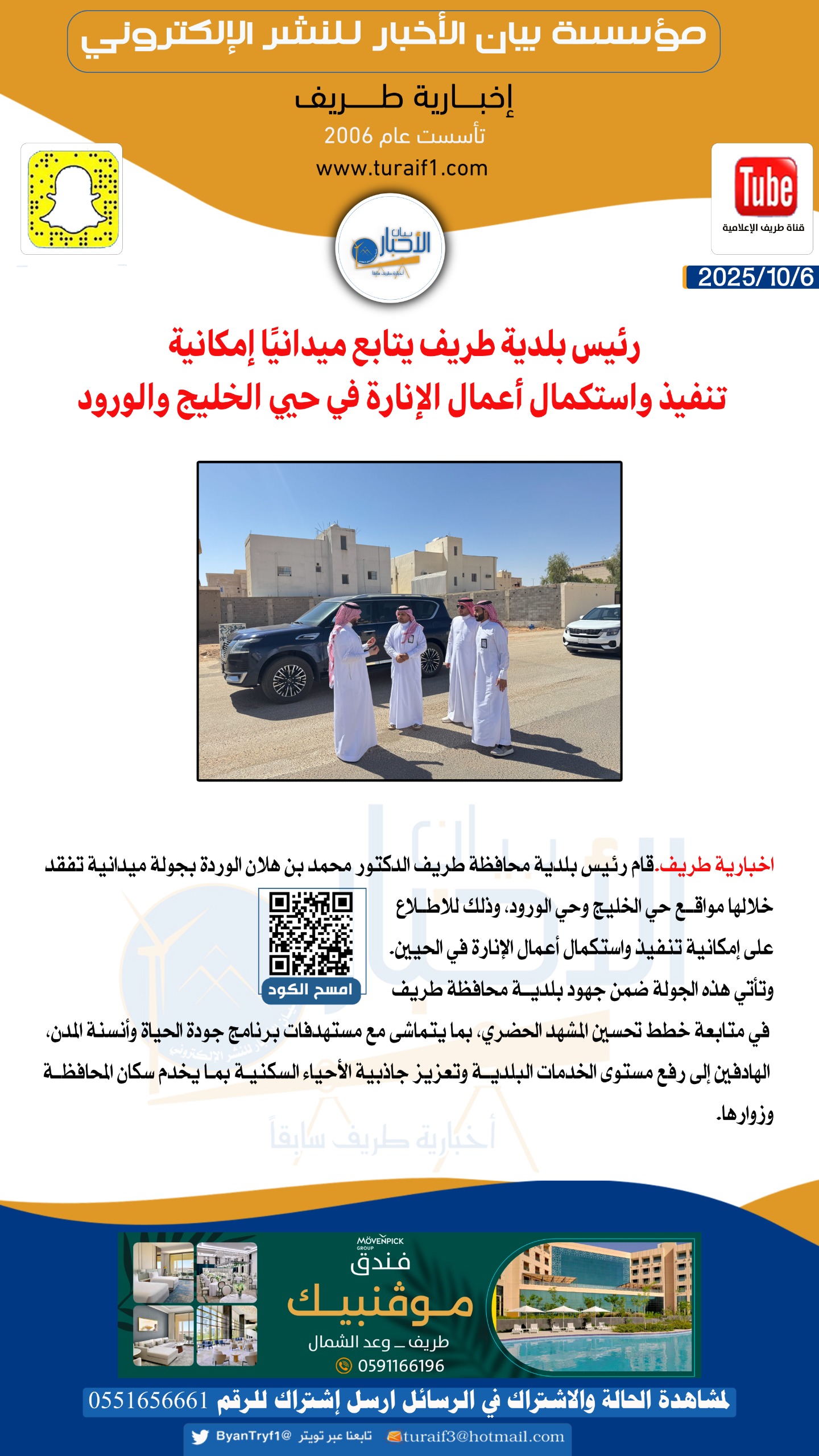 قام رئيس بلدية محافظة طريف الدكتور محمد بن هلان الوردة بجولة ميدانية تفقد خلالها مواقع حي الخليج وحي الورود، وذلك للاطلاع على إمكانية تنفيذ واستكمال أعمال الإنارة في الحيين.