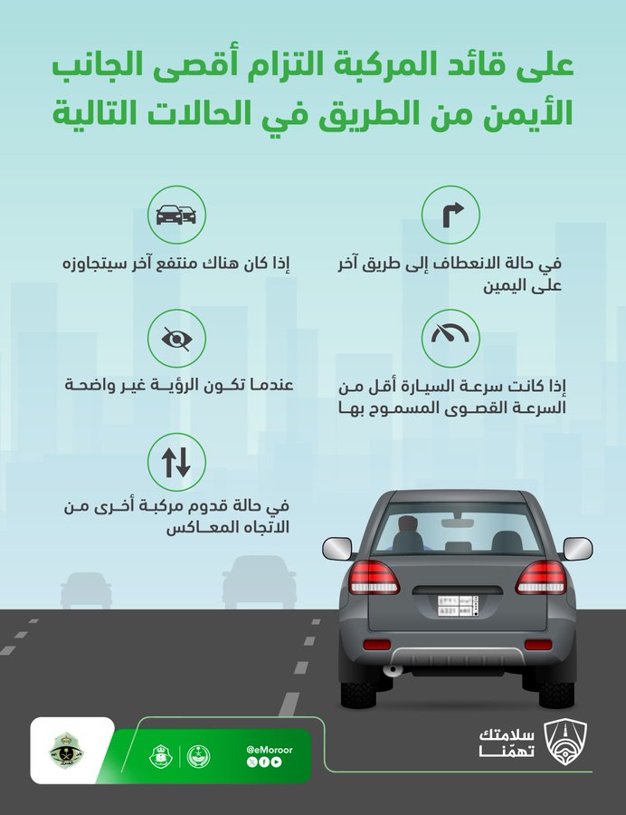 وتابعت الإدارة، أن حالات التزام قائد المركبة أقصى الجانب الأيمن تشمل كذلك، عدم وضوح الرؤية أو كانت سرعة السيارة أقل من السرعة القصوى المسموح بها، أو في حالة قدوم مركبة أخرى من الاتجاه المعاكس.
