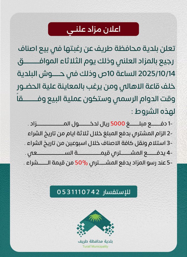 أعلنت بلدية محافظة طريف عن رغبتها في بيع أصناف رجيع بالمزاد العلني، وذلك يوم الثلاثاء الموافق 14 / 10 / 2025م في تمام الساعة 10 صباحاً، وذلك في حوش البلدية خلف قاعة الأهالي.