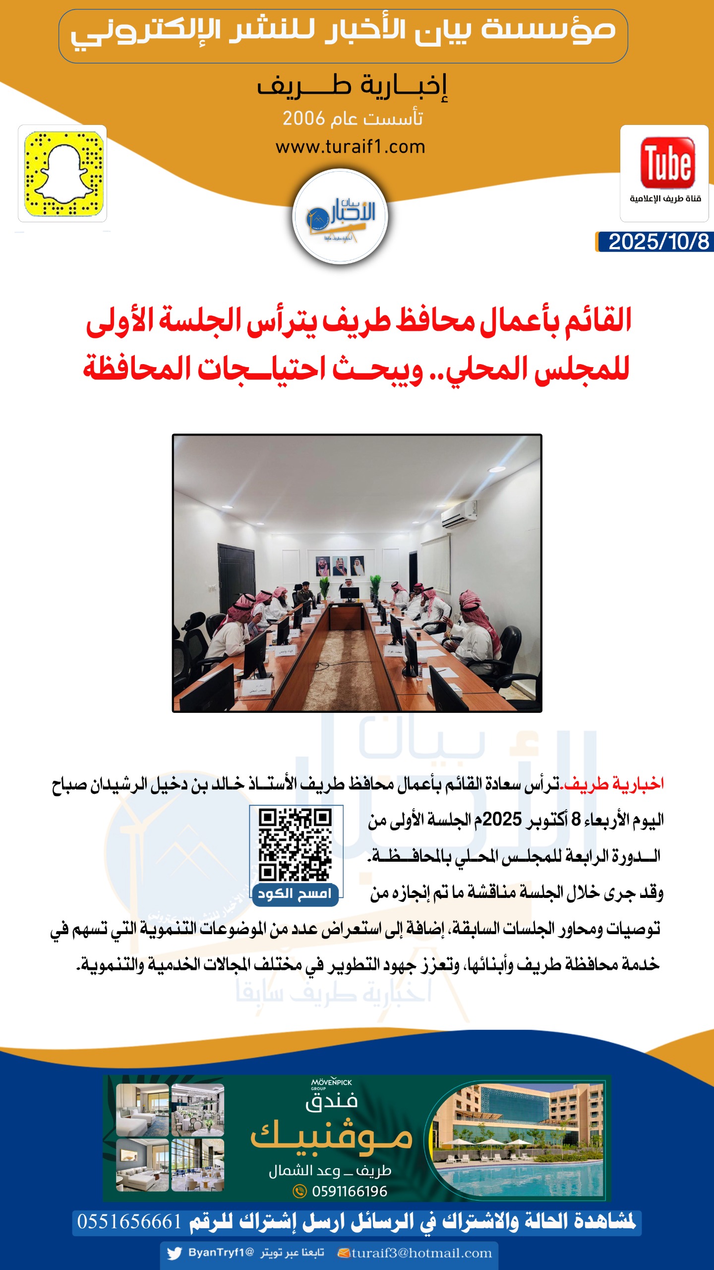 عقد المجلس المحلي بمحافظة طريف الجلسة الأولى من الدورة الرابعة للمجلس المحلي بالمحافظة لعام 2025، صباح اليوم الأربعاء 8 أكتوبر 2025م ، وذلك برئاسة سعادة القائم بأعمال محافظ طريف الأستاذ خالد بن دخيل الرشيدان.