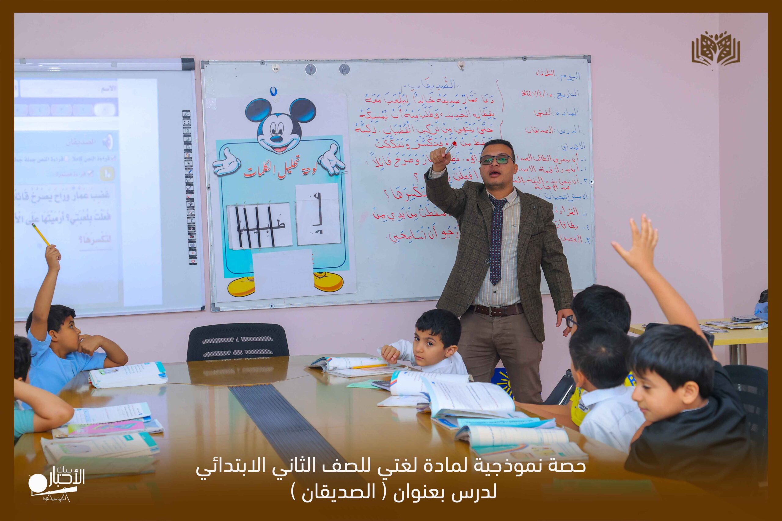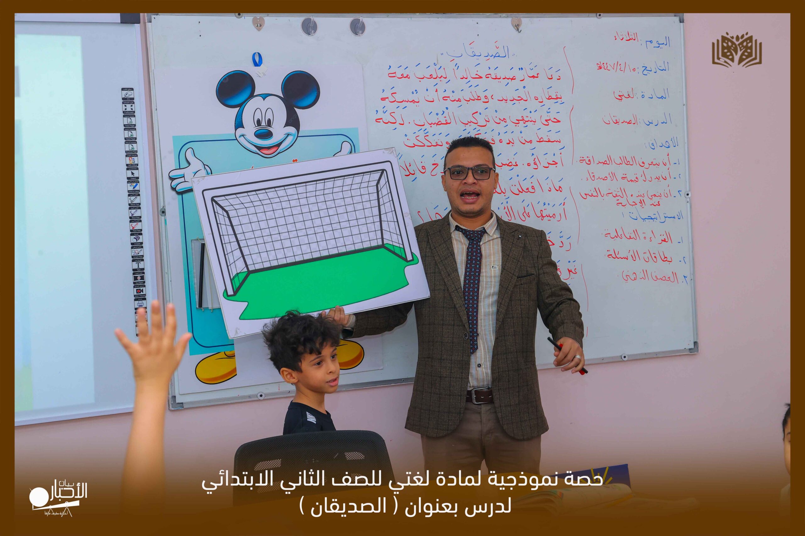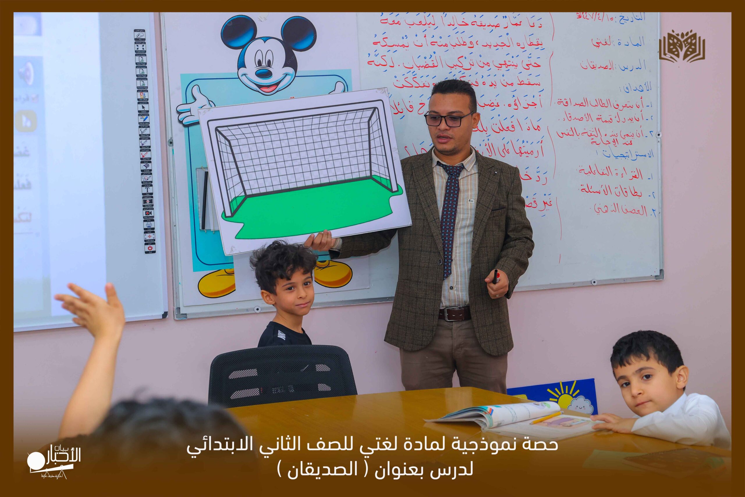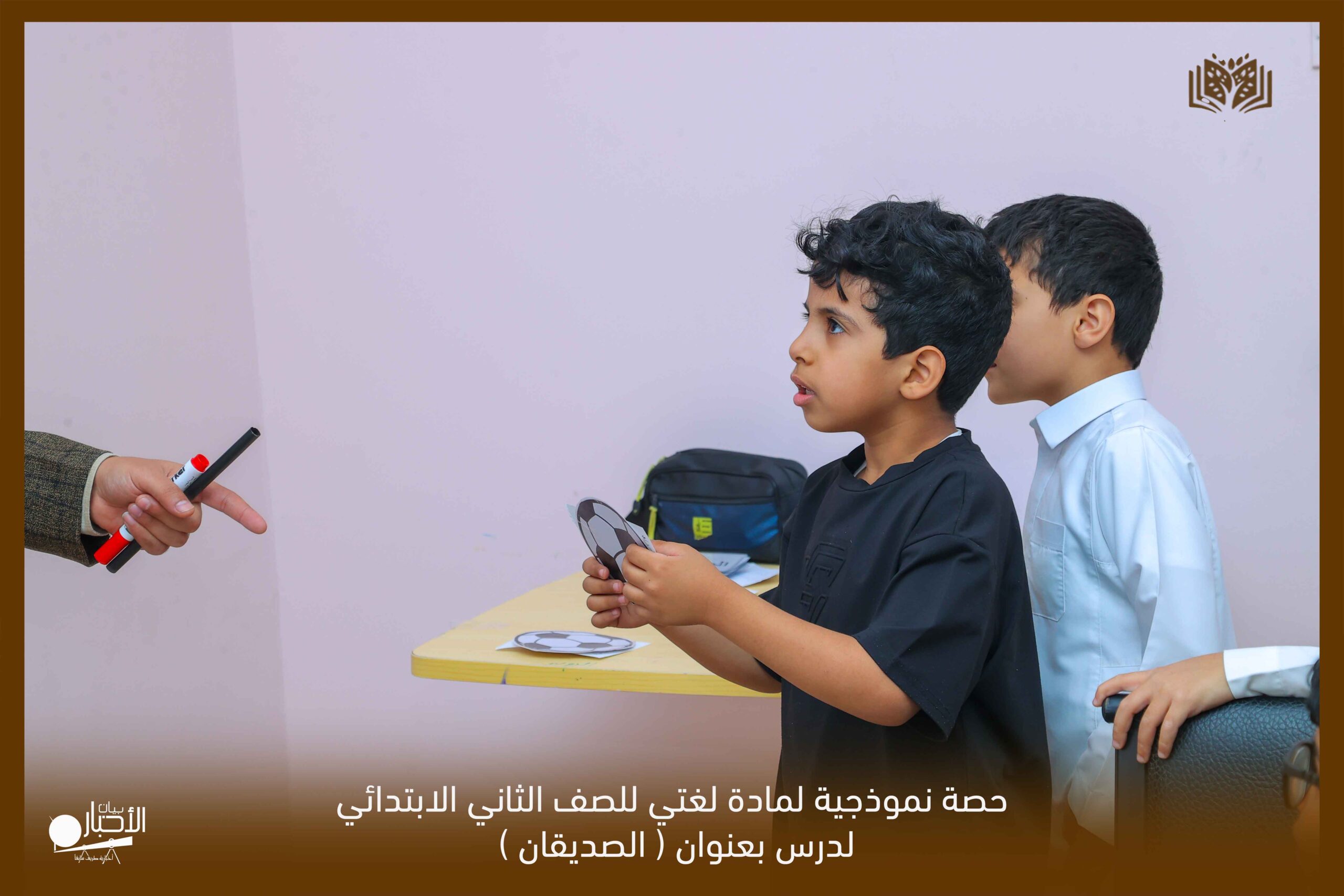 أقامت مدارس الوعد النموذجية حصة نموذجية لمادة لغتي للصف الثاني الابتدائي لدرس بعنوان ( الصديقان ) حيث استخدم المعلم استراتيجيات التعلم في التدريس ومنها ( التعلم النشط – العصف الذهني – التعلم التعاوني ) حيث تفاعل الطلاب مع المعلم أثناء الدرس تفاعلًا رائعًا وذلك باستخدام وسائل تعليمية متنوعة ٠