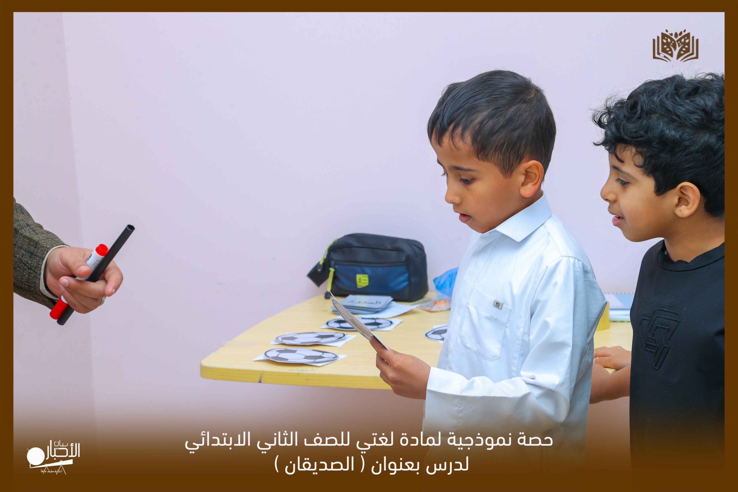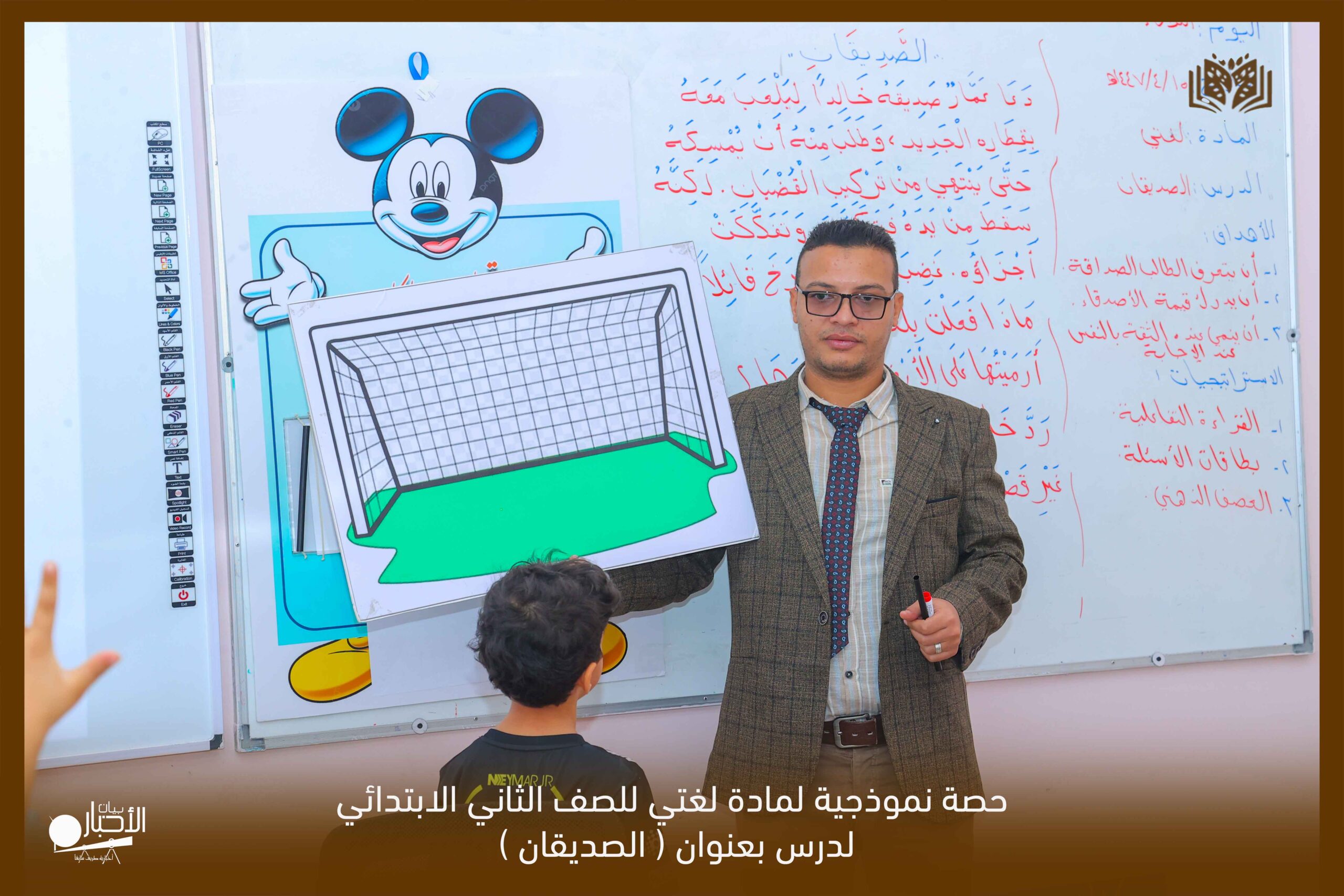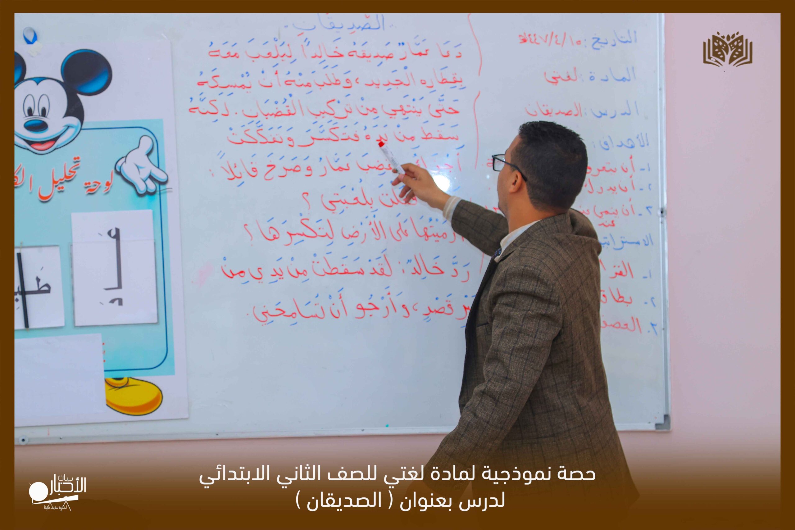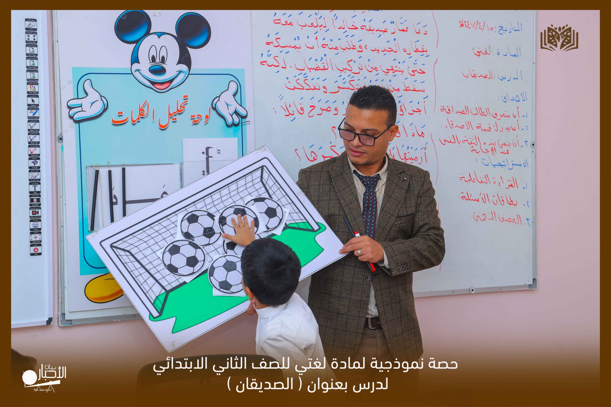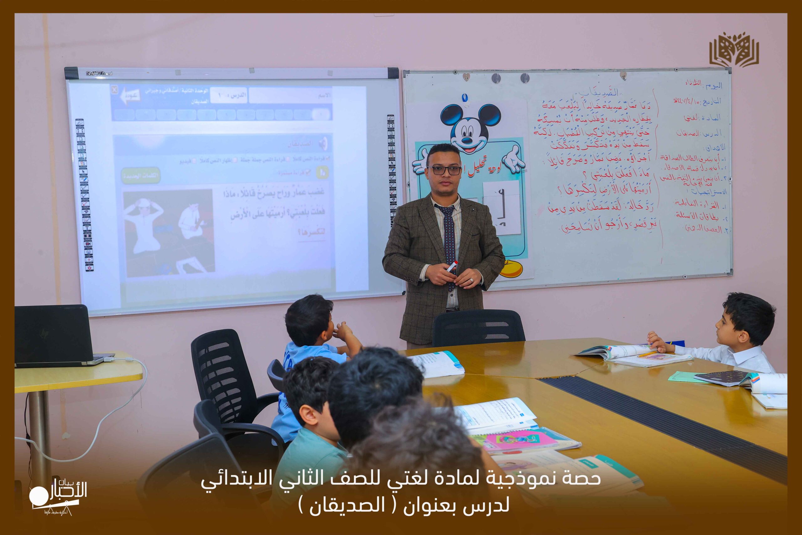 أقامت مدارس الوعد النموذجية حصة نموذجية لمادة لغتي للصف الثاني الابتدائي لدرس بعنوان ( الصديقان ) حيث استخدم المعلم استراتيجيات التعلم في التدريس ومنها ( التعلم النشط – العصف الذهني – التعلم التعاوني ) حيث تفاعل الطلاب مع المعلم أثناء الدرس تفاعلًا رائعًا وذلك باستخدام وسائل تعليمية متنوعة ٠