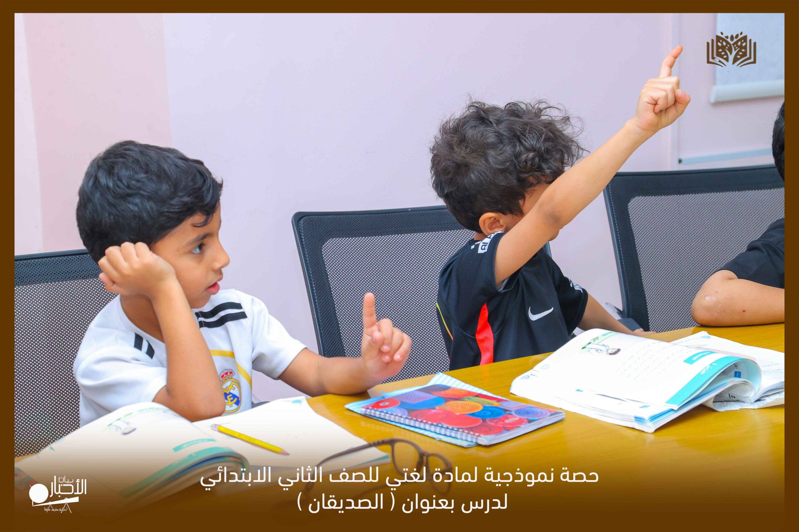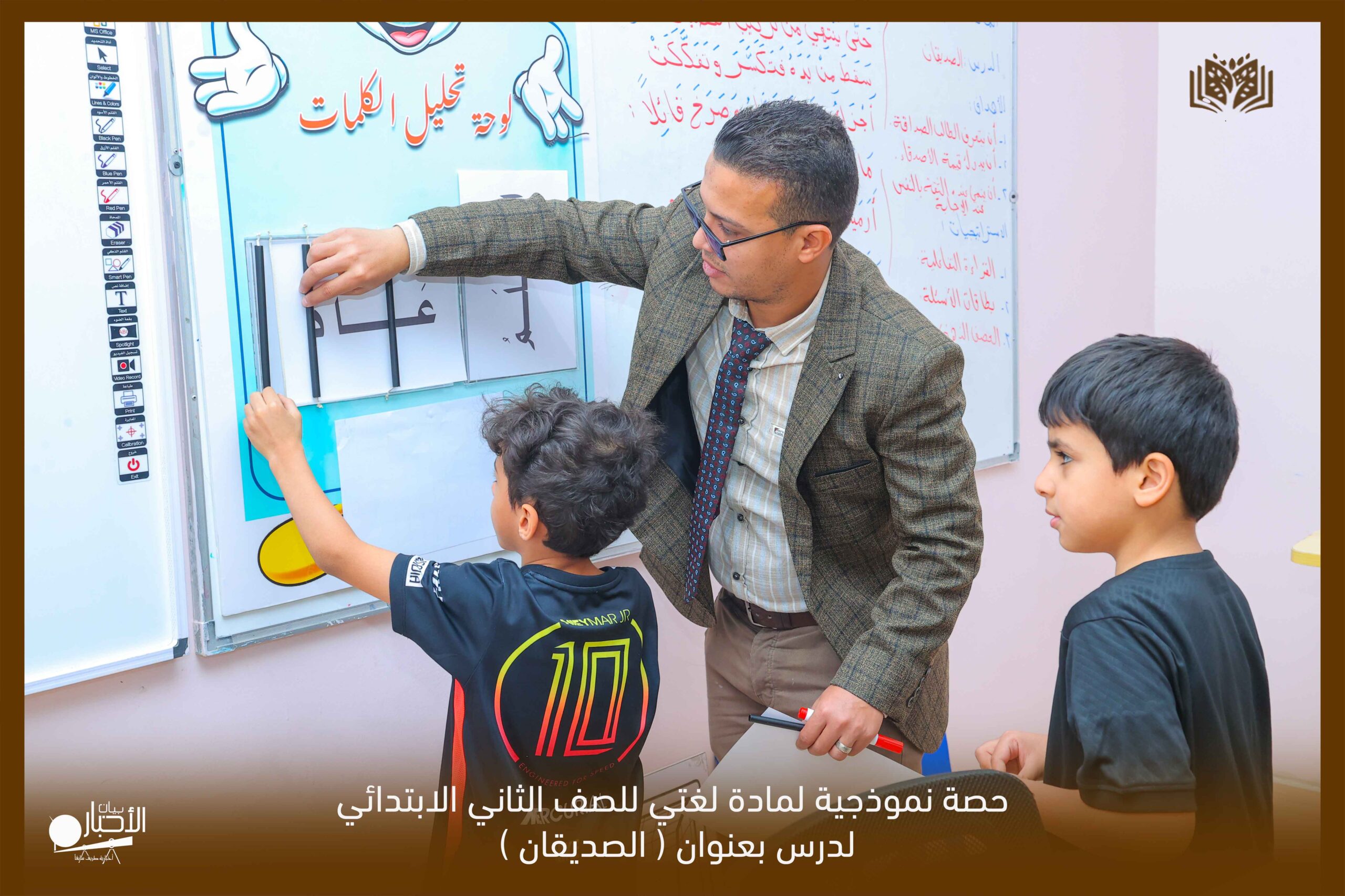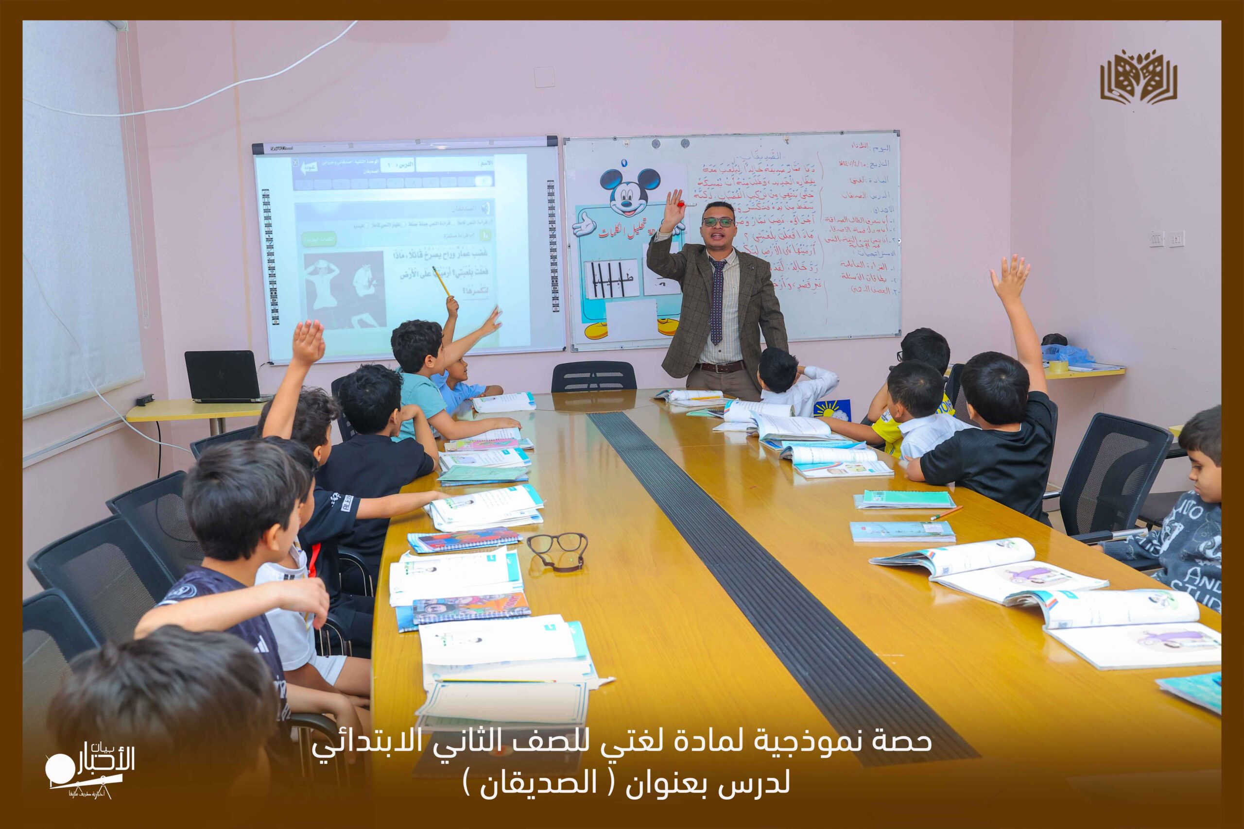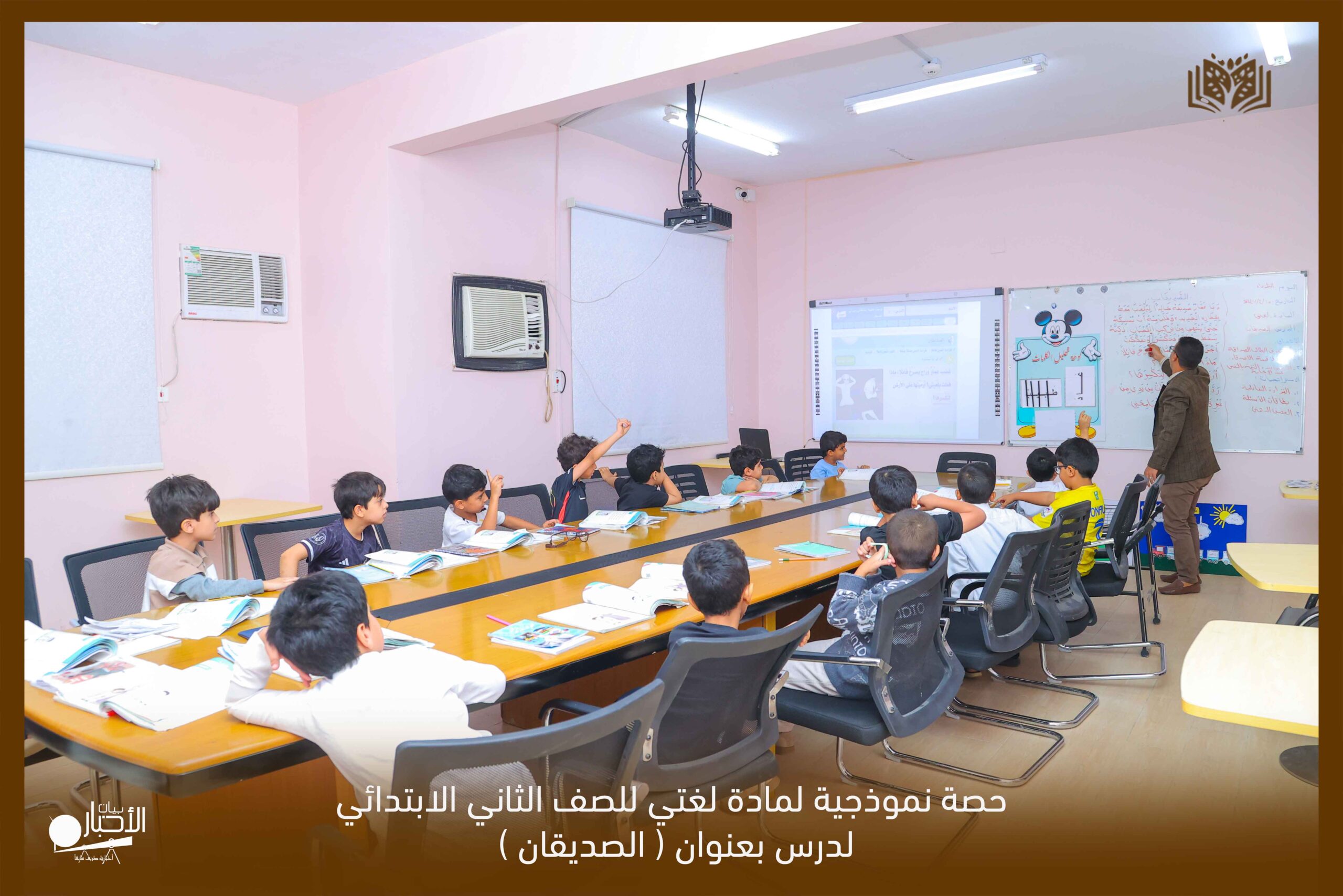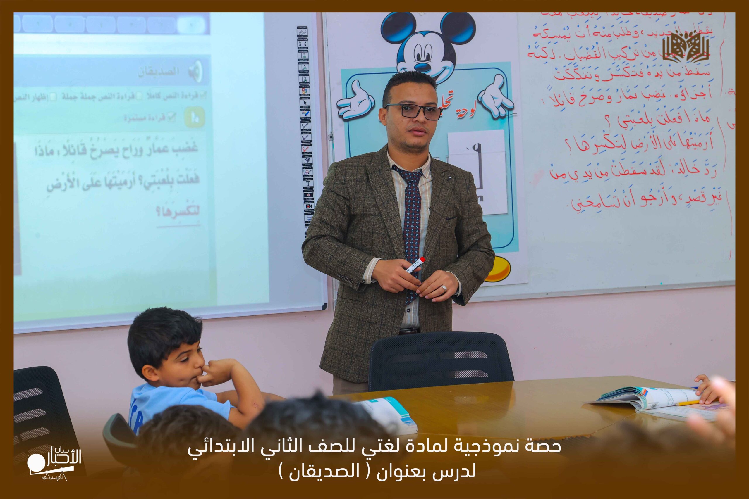 أقامت مدارس الوعد النموذجية حصة نموذجية لمادة لغتي للصف الثاني الابتدائي لدرس بعنوان ( الصديقان ) حيث استخدم المعلم استراتيجيات التعلم في التدريس ومنها ( التعلم النشط – العصف الذهني – التعلم التعاوني ) حيث تفاعل الطلاب مع المعلم أثناء الدرس تفاعلًا رائعًا وذلك باستخدام وسائل تعليمية متنوعة ٠