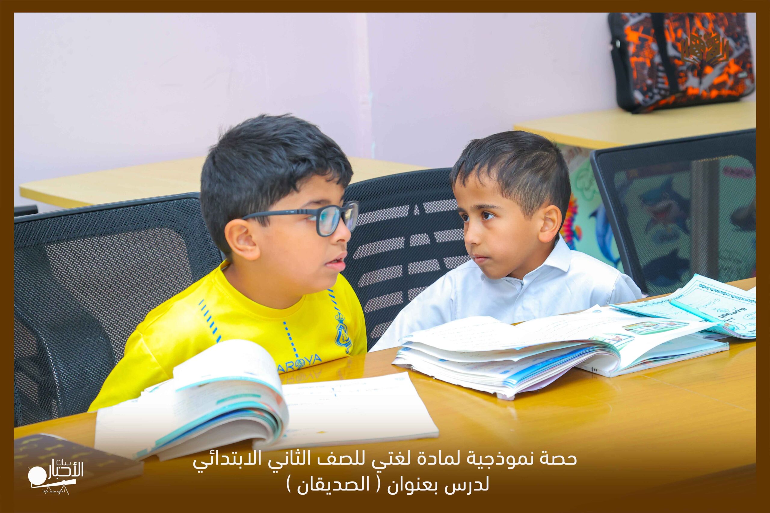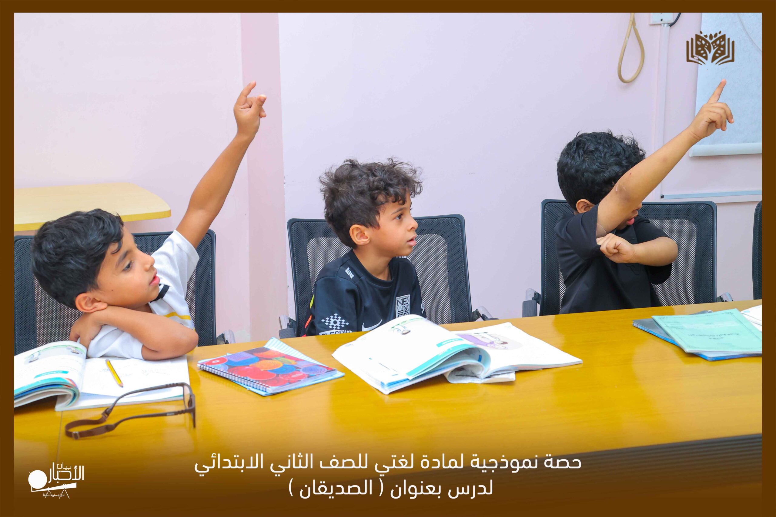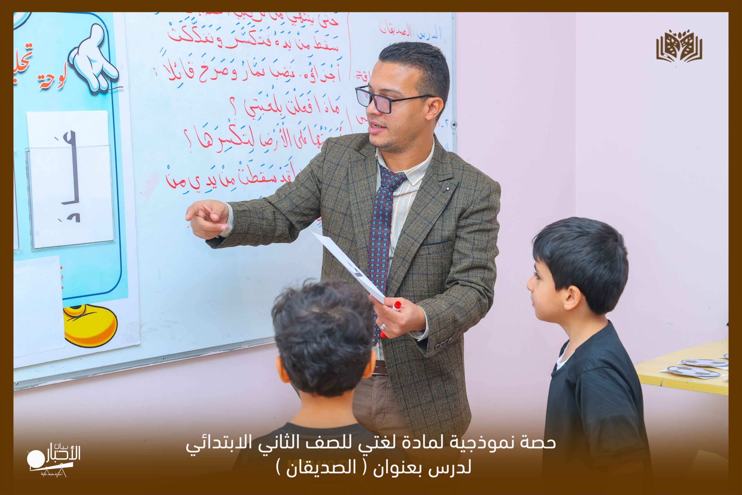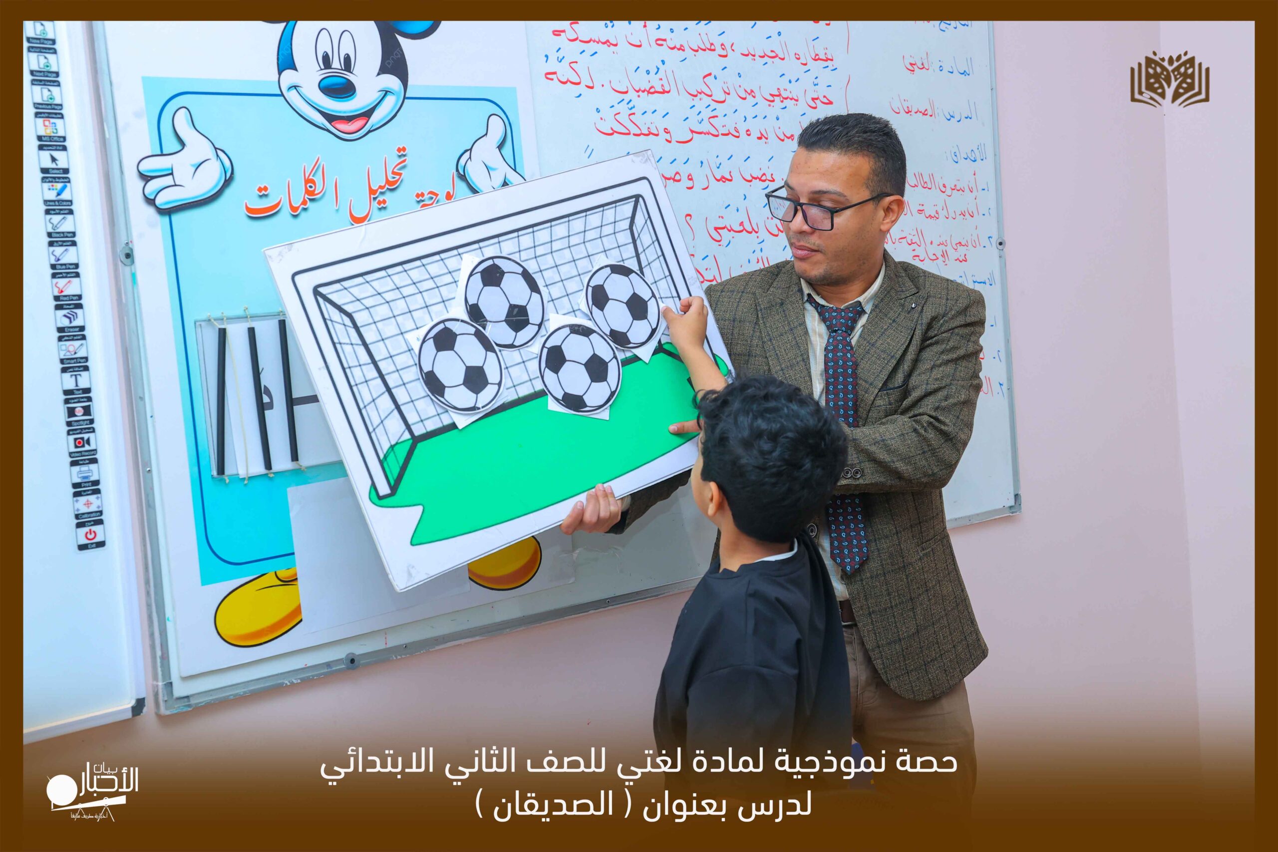 أقامت مدارس الوعد النموذجية حصة نموذجية لمادة لغتي للصف الثاني الابتدائي لدرس بعنوان ( الصديقان ) حيث استخدم المعلم استراتيجيات التعلم في التدريس ومنها ( التعلم النشط – العصف الذهني – التعلم التعاوني ) حيث تفاعل الطلاب مع المعلم أثناء الدرس تفاعلًا رائعًا وذلك باستخدام وسائل تعليمية متنوعة ٠