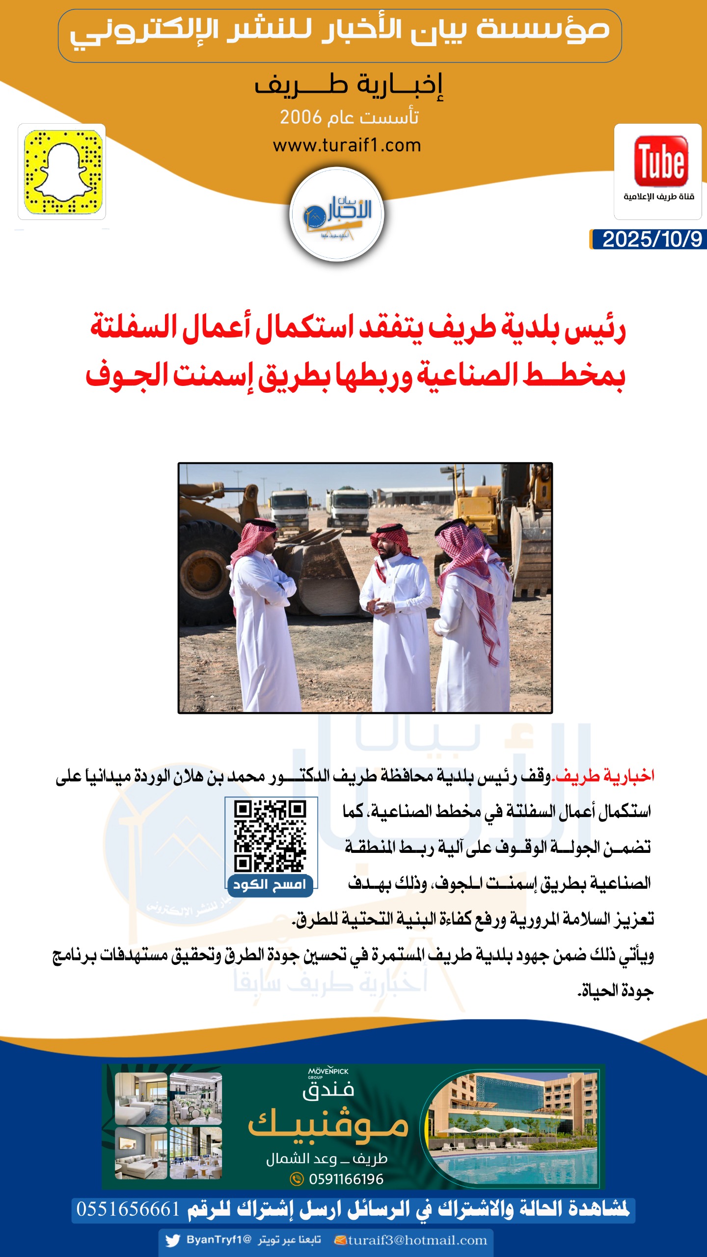 • 09/10/2025 بالصور.. رئيس بلدية طريف يتفقد استكمال أعمال السفلتة بمخطط الصناعية وربطها بطريق إسمنت الجوف