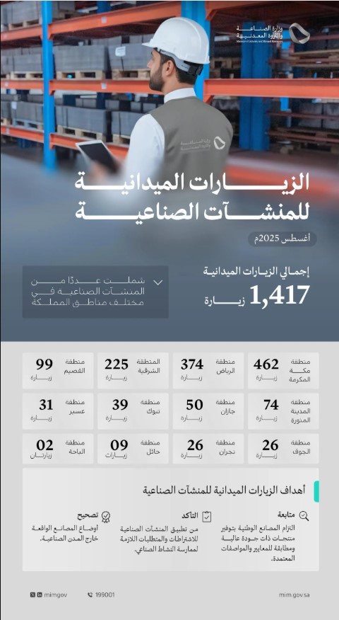 وأوضح المتحدث الرسمي لوزارة الصناعة والثروة المعدنية جراح بن محمد الجراح، أنَّ الزيارات الميدانية المُنفَّذة خلال شهر أغسطس 2025، شملت 462 زيارة للمصانع في منطقة مكة المكرمة، و374 زيارة في منطقة الرياض، و225 زيارة في المنطقة الشرقية، إضافة إلى 99 زيارة في منطقة القصيم، و74 زيارة في منطقة المدينة المنورة، و50 زيارة في منطقة جازان، و39 زيارة في منطقة تبوك، و31 زيارة في منطقة عسير، و26 زيارة منطقة الجوف، و26 زيارة في منطقة نجران، و9 زيارات في منطقة حائل، فيما نفذت زيارتين في منطقة الباحة.