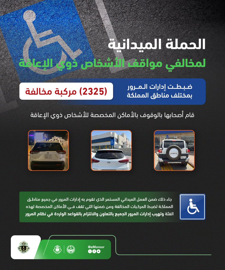 يأتي ذلك ضمن العمل الميداني المستمر الذي تقوم به إدارات المرور في جميع مناطق المملكة لضبط المركبات المخالفة ومن ضمنها التي تقف في الأماكن المخصصة لهذه الفئة وتهيب إدارات المرور الجميع بالتعاون والالتزام بالقواعد الواردة في نظام المرور.
