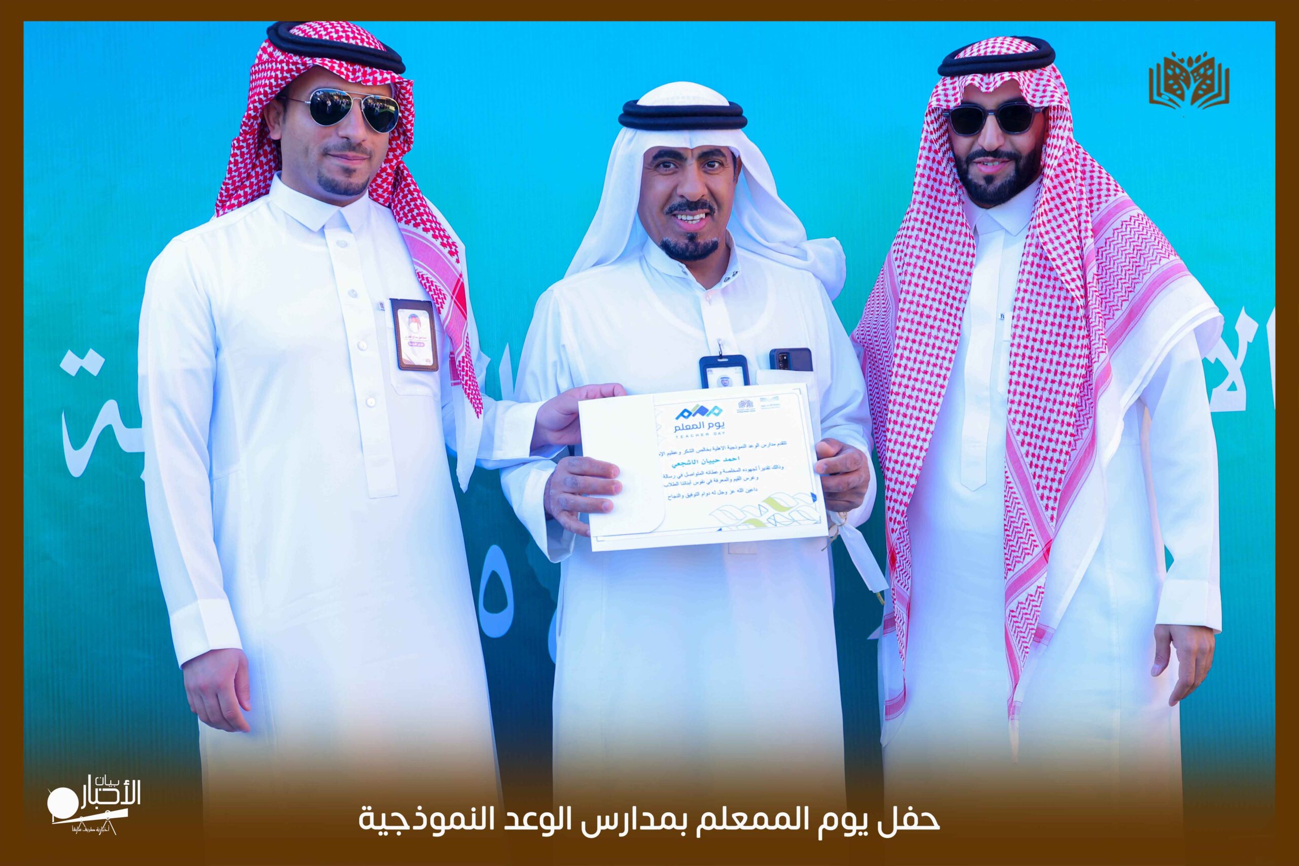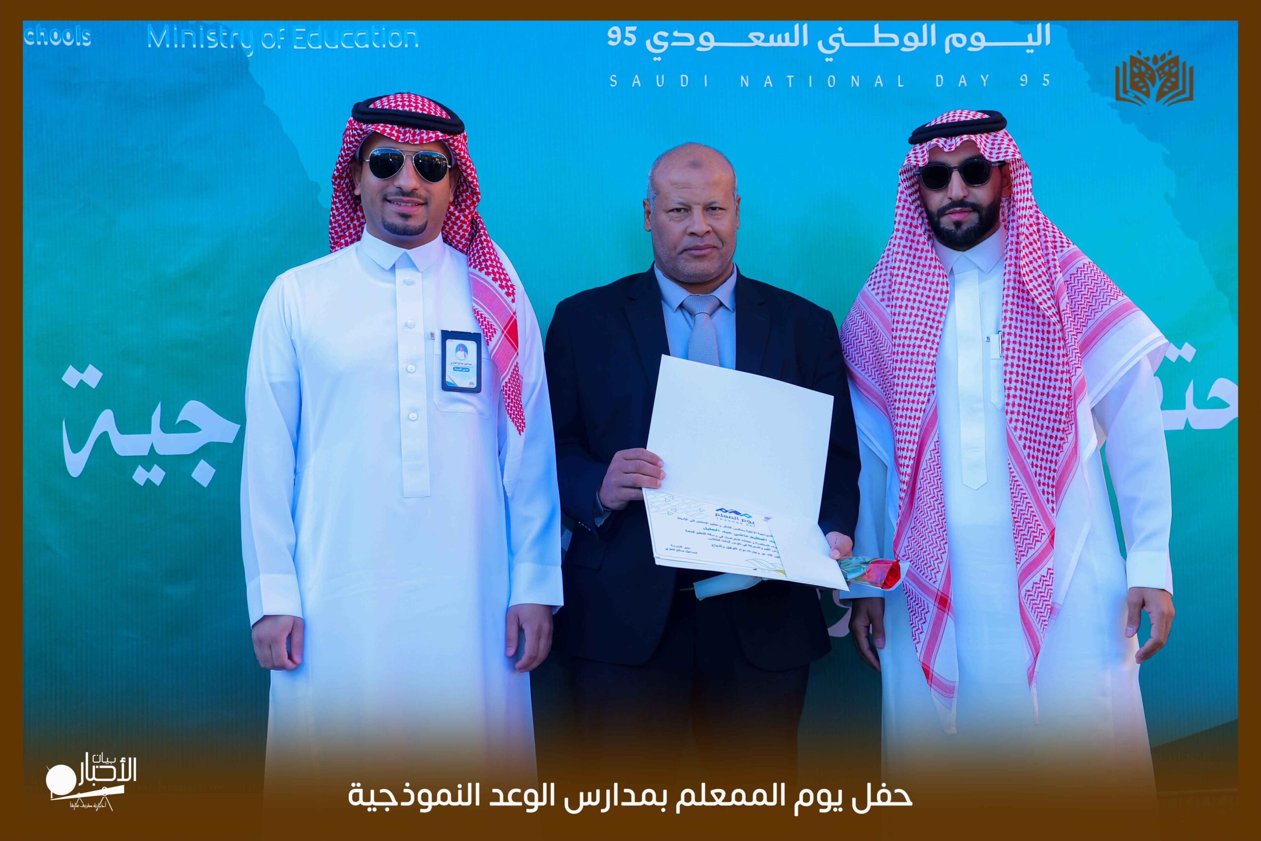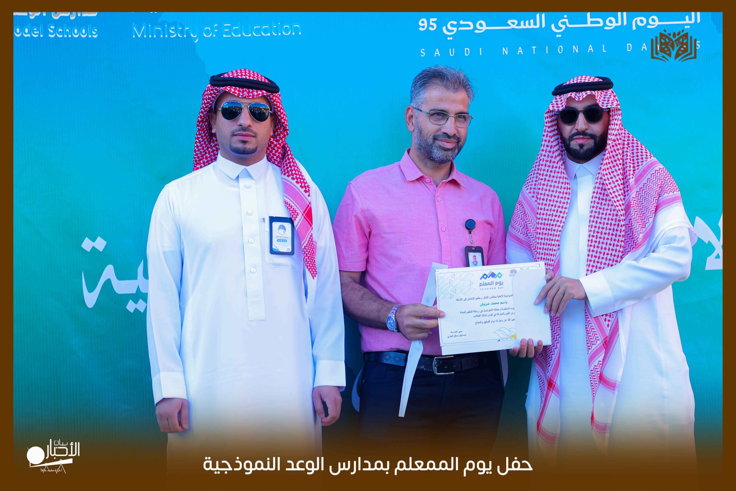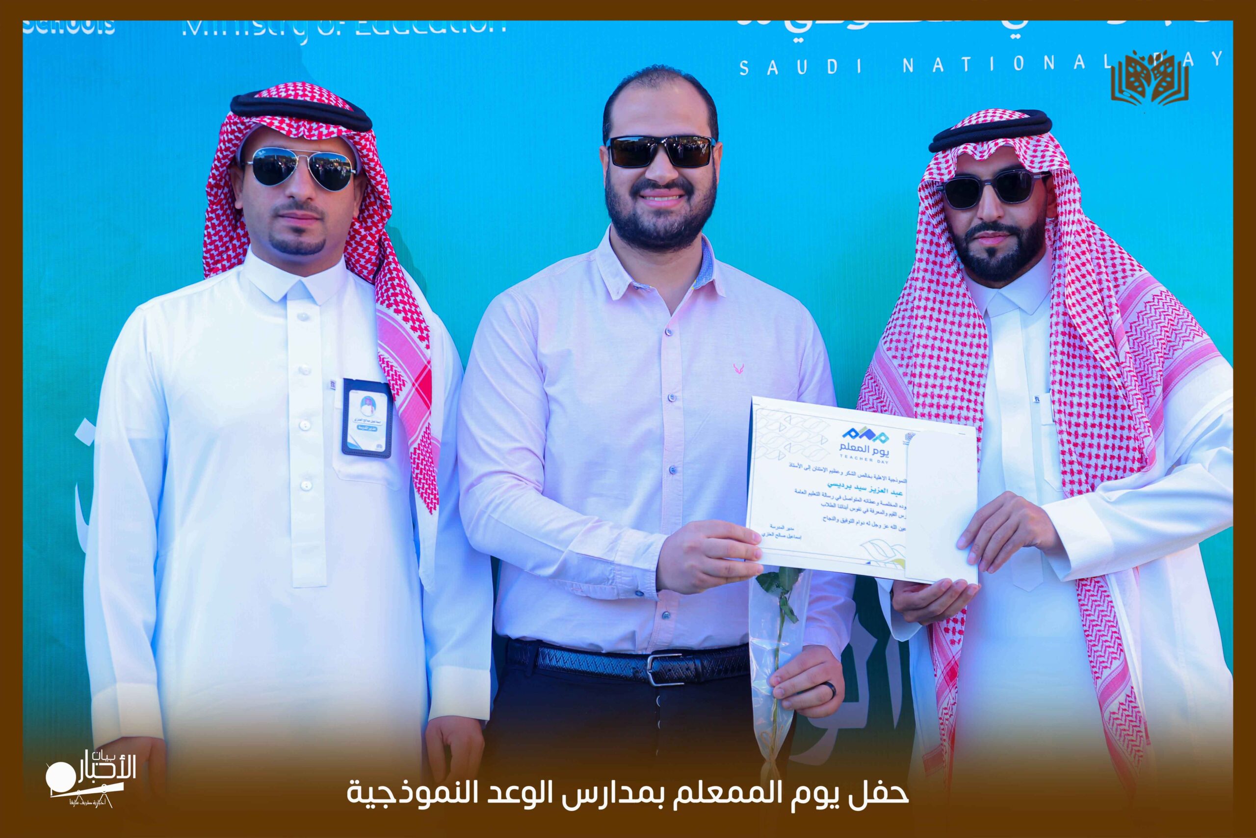 جاء ذلك التكريم من مدير المدرسة الأستاذ إسماعيل صالح العنزي حيث تم تكريم كلا من الأستاذ محمد سالم الرويلي المشرف العام على مدارس الوعد النموذجية والأستاذ عبدالرحمن حمود الرويلي مدير المرحلة المتوسطة والثانوية والأستاذ محمد سعد المشرف الفني بالمرحلة المتوسطة والثانوية ثم تكريم معلمي المدرسة وسط أجواء سادها روح المحبة والإخاء داعين الله عز وجل أن يكتب أجرهم ويجعل ما قدموا في ميزان حسناتهم ٠