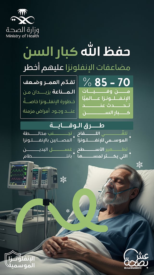 وأكدت الوزارة أن كبار السن يشكّلون النسبة الأكبر من وفيات الإنفلونزا عالميًا، إذ تتراوح نسبتهم بين 70 و85%، مشيرة إلى أن التقدّم في العمر وضعف جهاز المناعة يزيدان من خطر الإصابة، لا سيما في حال وجود أمراض مزمنة.