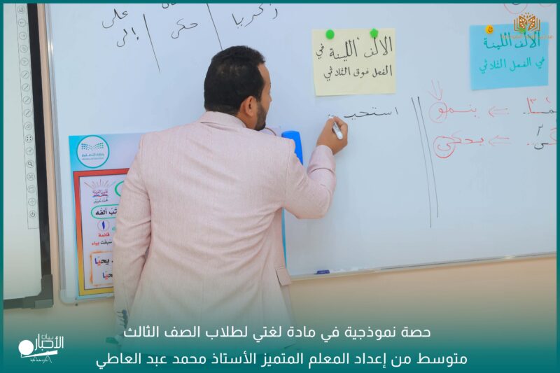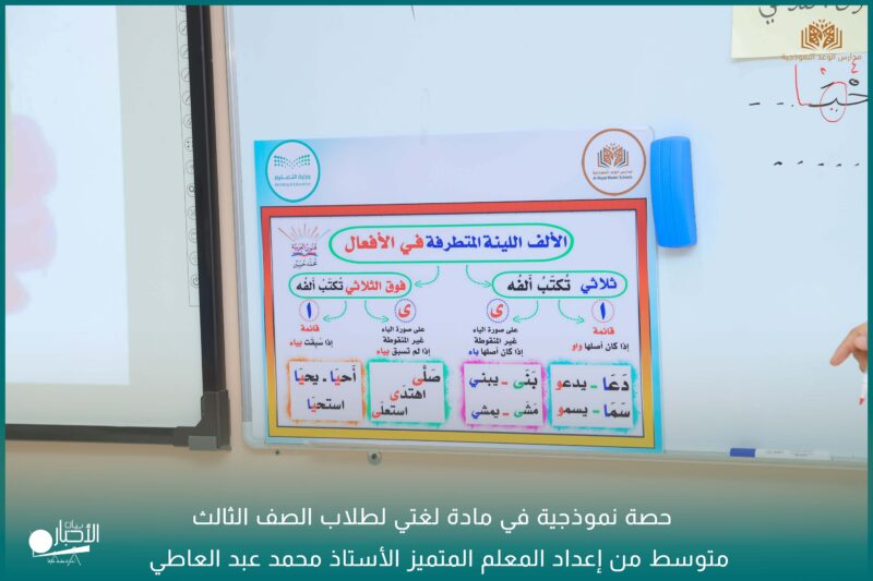 حيث استخدم المعلم استراتيجيات التعلم في التدريس ومنها ( التعلم النشط – بطاقات التفكير – التعلم التعاوني – خذ رقم / اسحب بطاقة – ) لشرح درس( الألف اللينة في آخر الفعل ).
