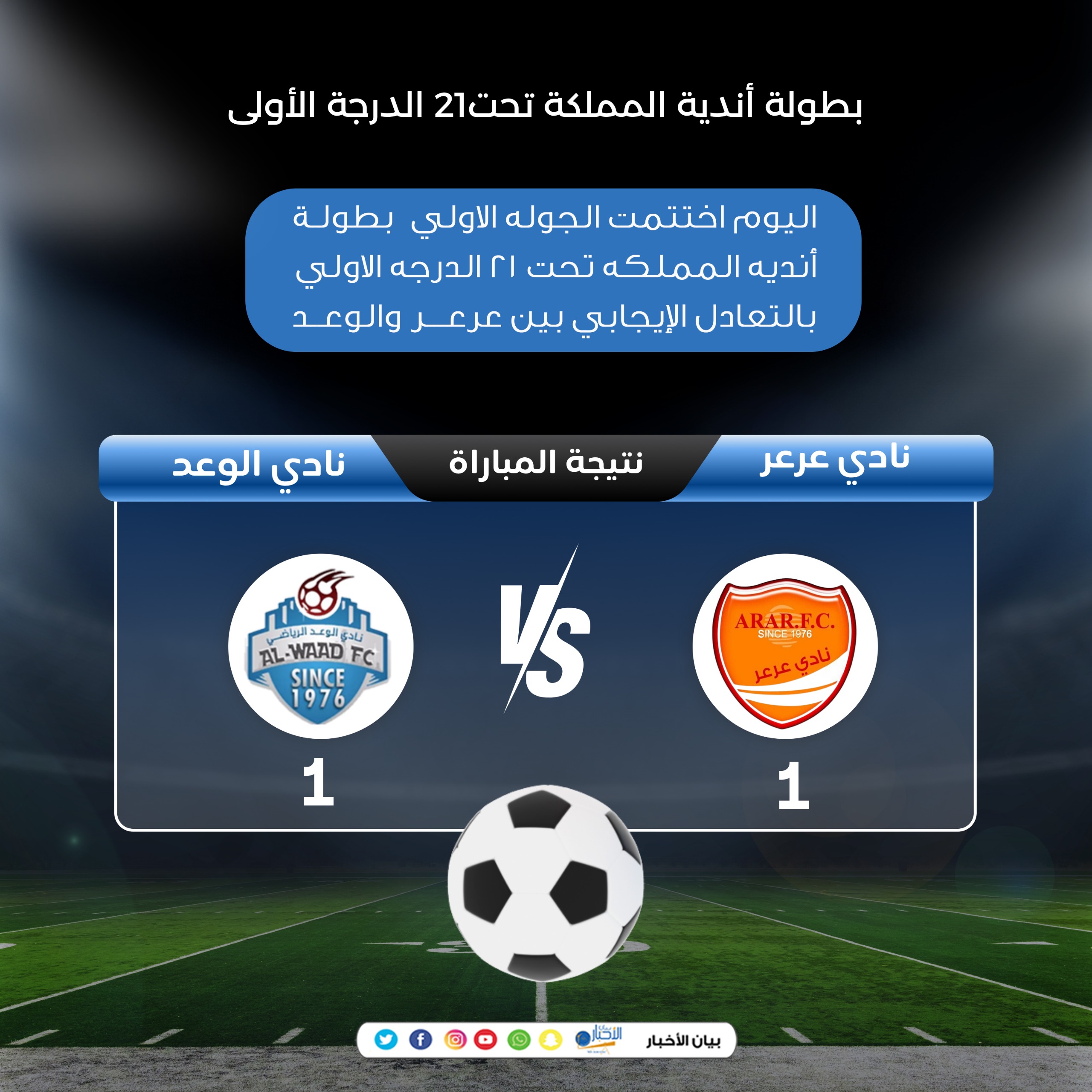 اختتمت أمس الثلاثاء الموافق 14 أكتوبر 2025م منافسات الجولة الأولى من بطولة أندية المملكة تحت 21 سنة – الدرجة الأولى، حيث شهدت المباراة الختامية تعادلًا إيجابيًا بين فريقي عرعر والوعد، بهدف واحد لكل منهما، في لقاءٍ اتسم بالندية والحماس بين الفريقين.