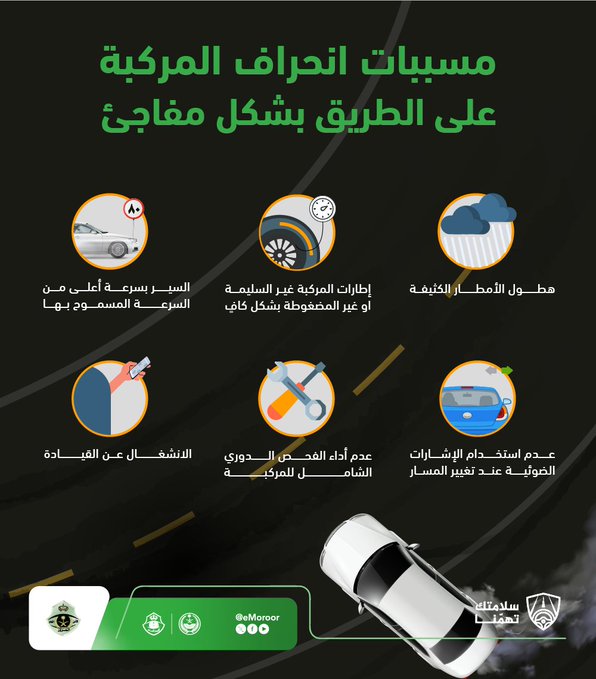 حذرت الإدارة العامة للمرور، من الانحراف المُفاجئ على الطريق، والذي يُعرض حياة قائد المركبة وحياة الآخرين للخطر.