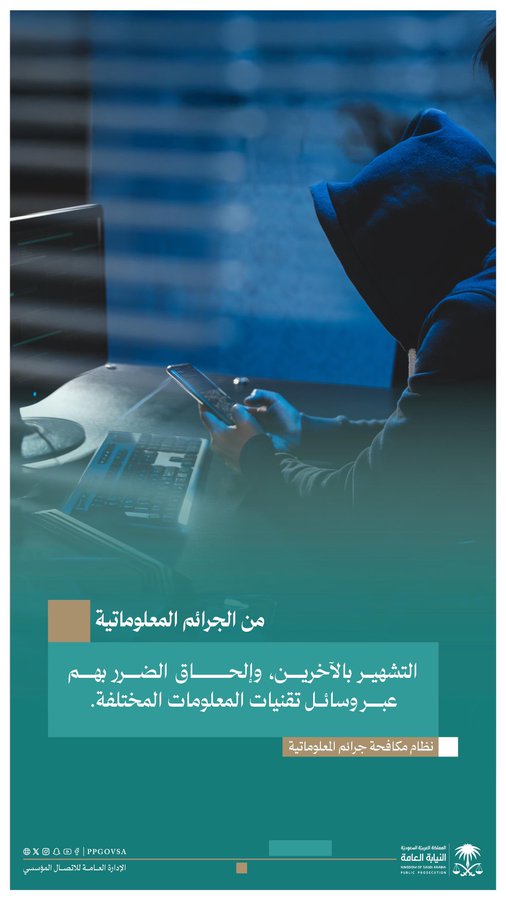 وأوضحت النيابة أن التشهير بالآخرين أو إلحاق الضرر بهم عبر وسائل تقنيات المعلومات المختلفة يُعد من الجرائم المعلوماتية، ويُعرض مرتكبيه للمساءلة القانونية وفق ما نص عليه النظام.