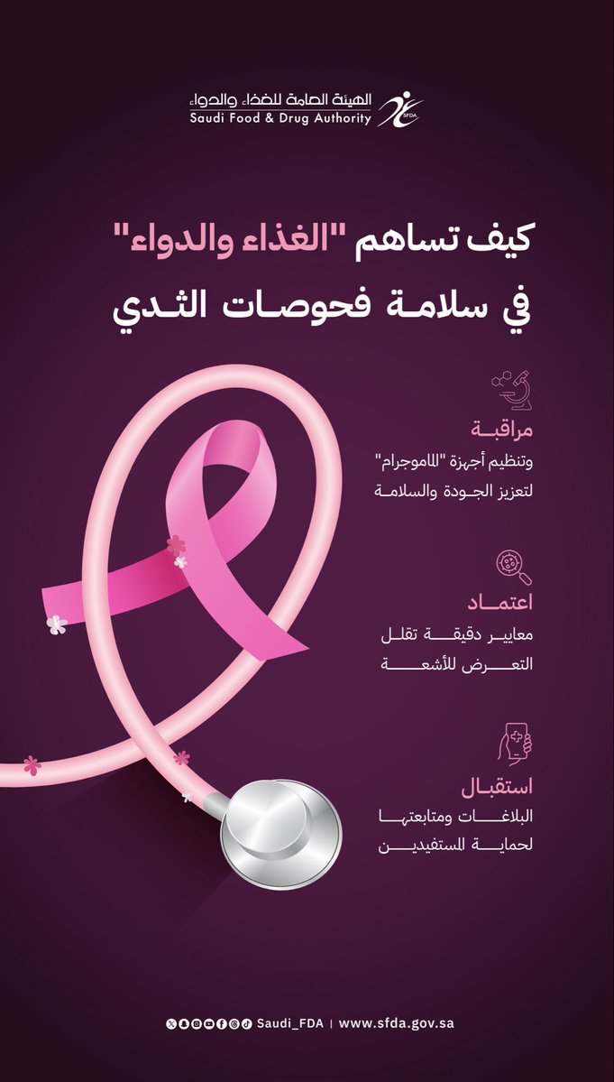تسهم الهيئة العامة للغذاء والدواء في تعزيز سلامة فحوصات الثدي، من خلال مراقبة وتنظيم أجهزة «الماموجرام» المعتمدة في المنشآت الصحية، بما يضمن جودة أدائها وسلامة استخدامها.
