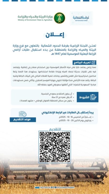 أعلنت اللجنة الزراعية بغرفة الحدود الشمالية بالتعاون مع فرع وزارة البيئة والمياه والزراعة بالمنطقة، عن بدء استقبال طلبات الأراضي الزراعية البعلية الموسمية لعام 1447هـ.