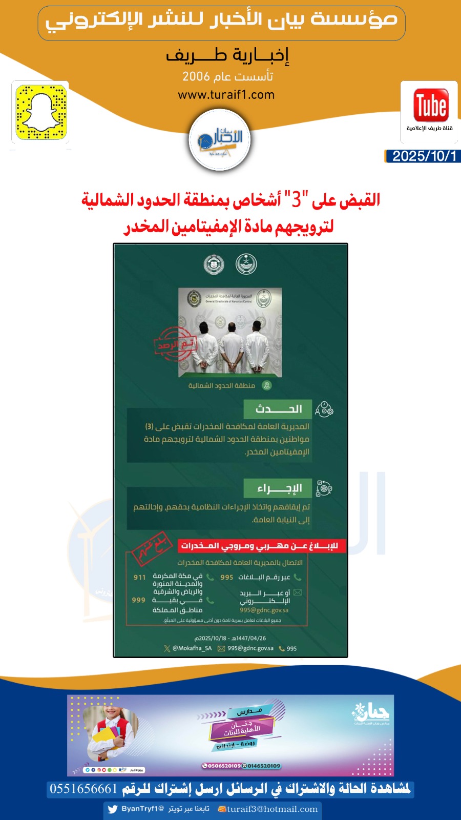 قبضت المديرية العامة لمكافحة المخدرات على (3) مواطنين بمنطقة الحدود الشمالية لترويجهم مادة الإمفيتامين المخدر، وجرى إيقافهم واتخاذ الإجراءات النظامية بحقهم، وإحالتهم إلى النيابة العامة.