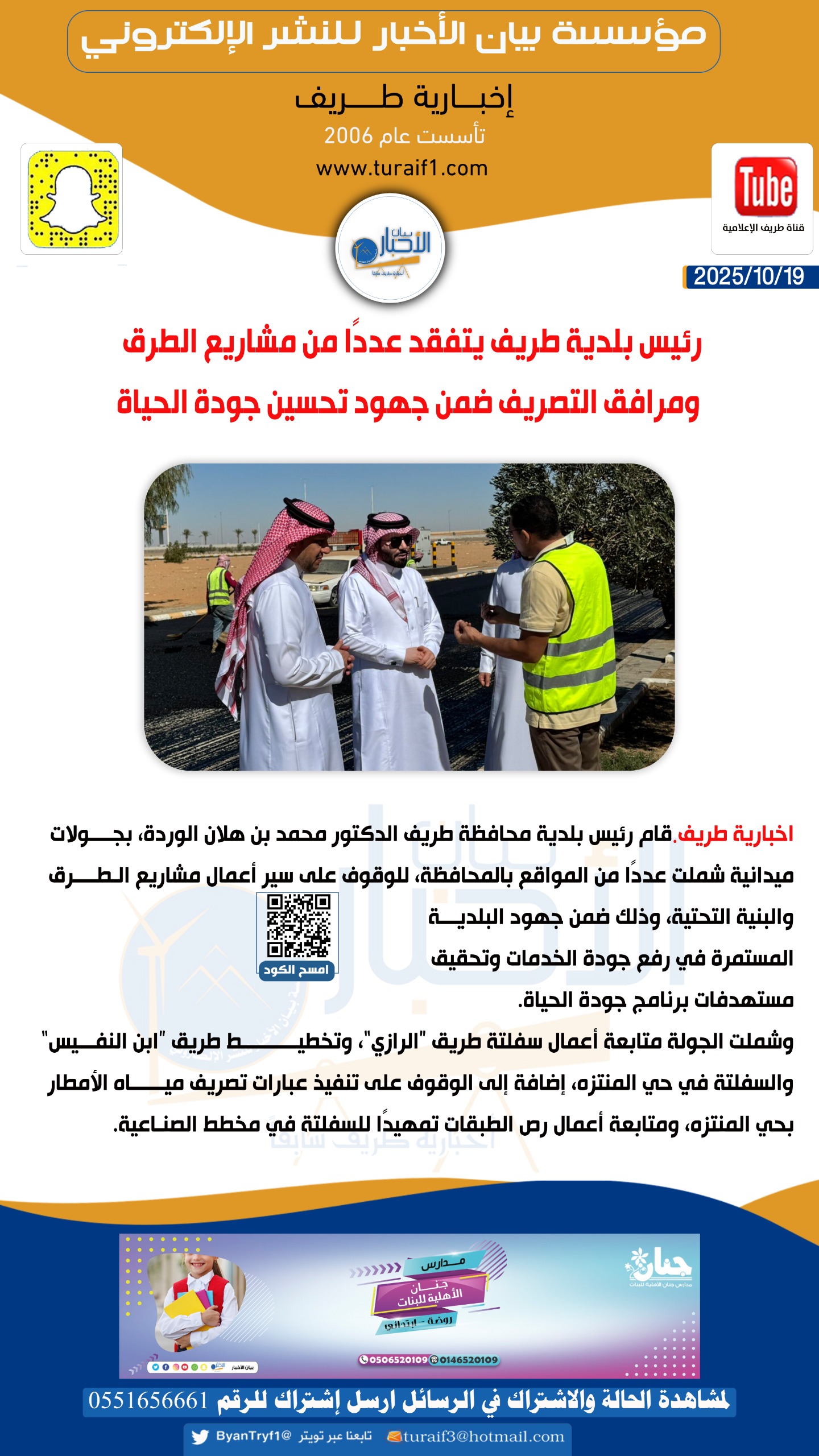 • 19/10/2025 بالصور.. رئيس بلدية طريف يتفقد عددًا من مشاريع الطرق ومرافق التصريف ضمن جهود تحسين جودة الحياة