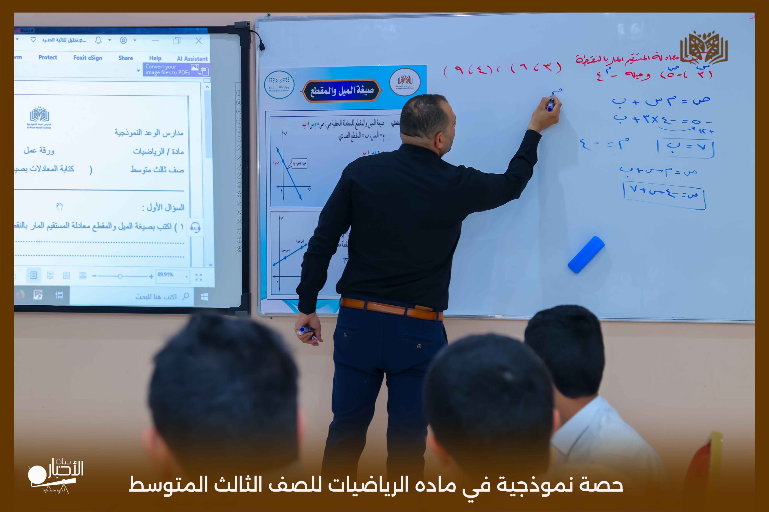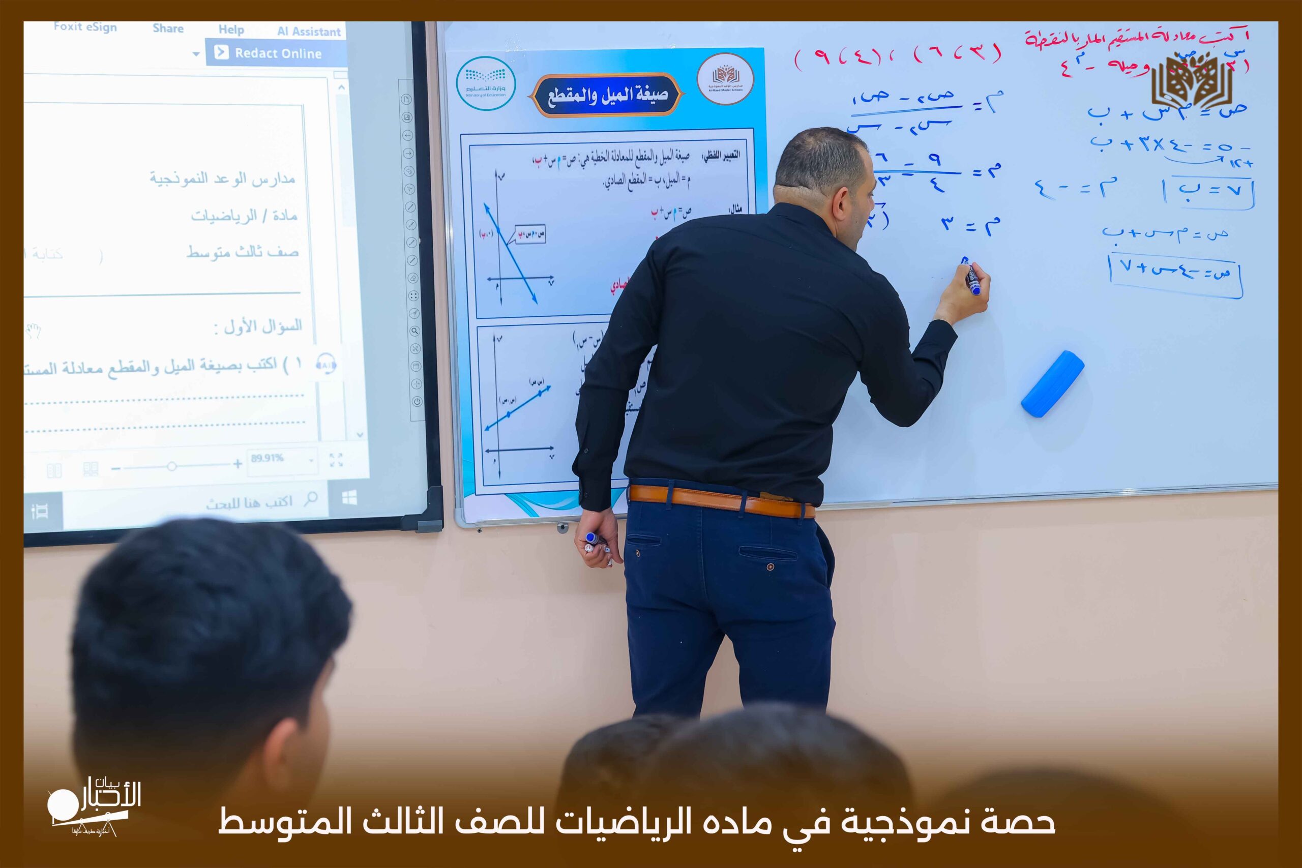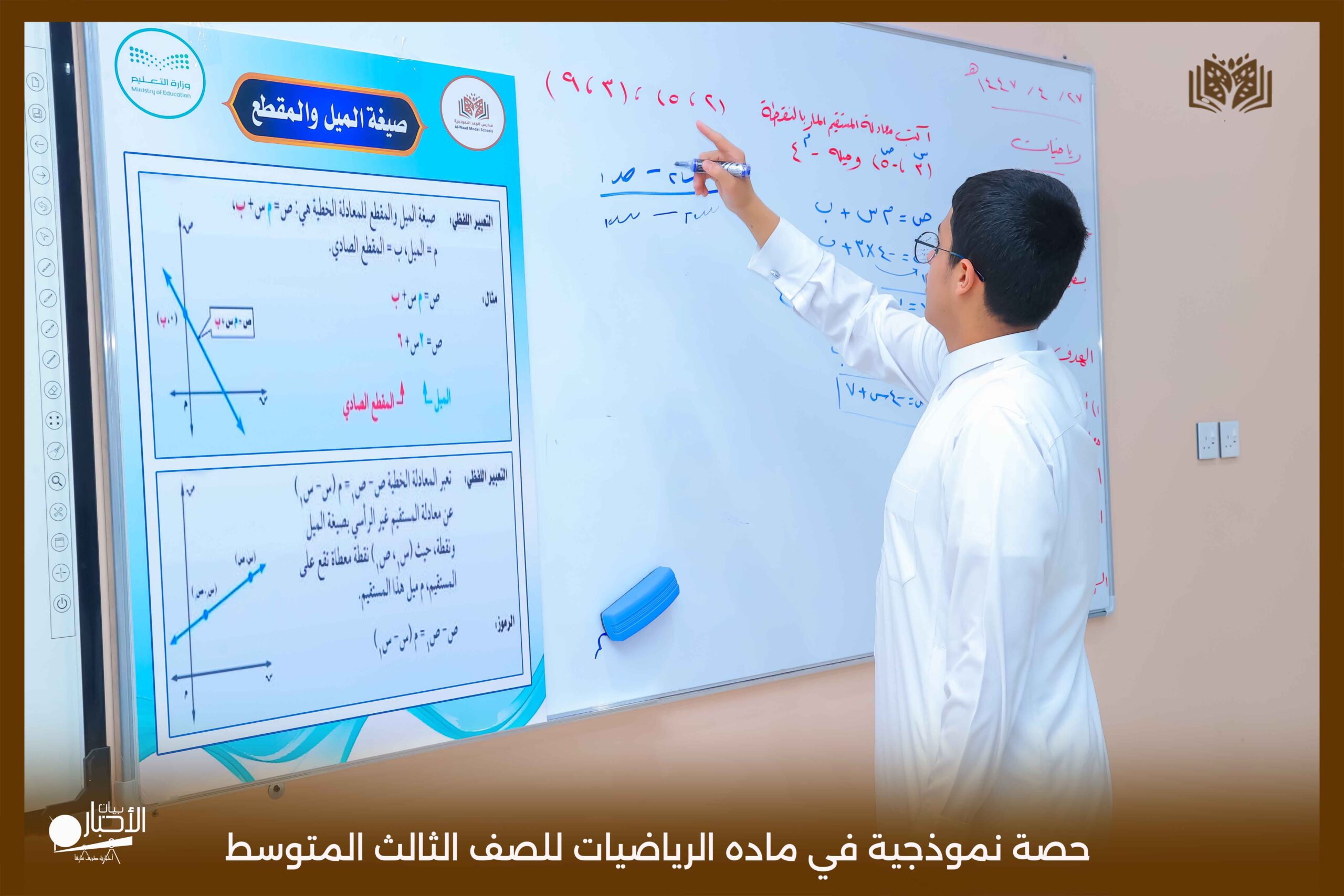 قدمت اليوم مدارس الوعد النموذجية بالقسم المتوسط والثانوي حصة نموذجية في ماده الرياضيات للصف الثالث المتوسط كانت بعنوان كتابة المعادلات بصيغة الميل والمقطع.