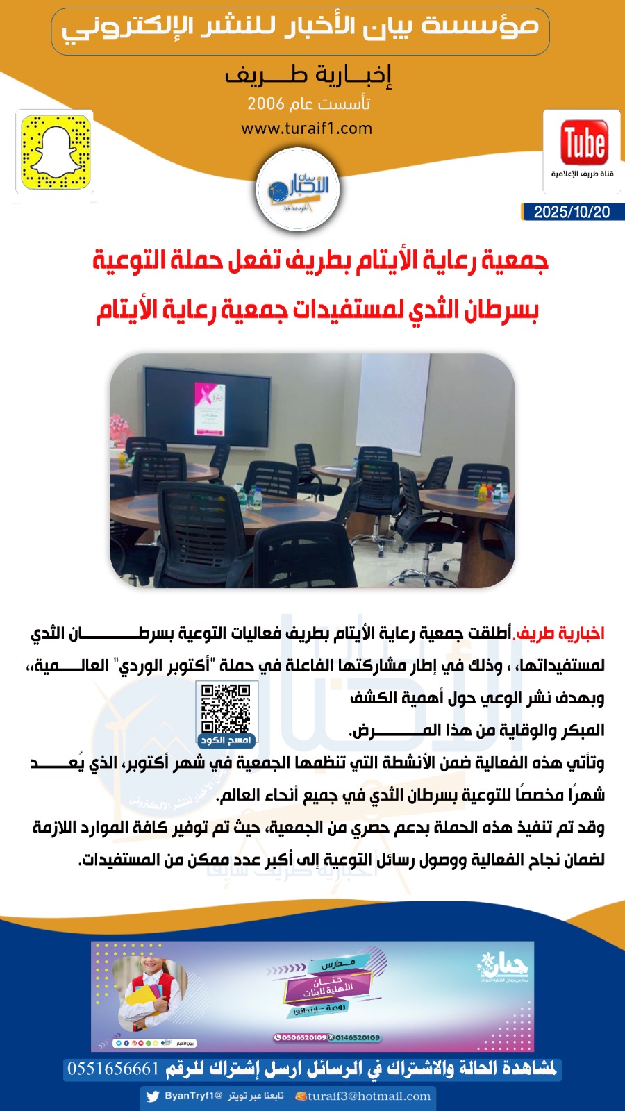 أطلقت جمعية رعاية الأيتام بطريف فعاليات التوعية بسرطان الثدي لمستفيداتها، ، وذلك في إطار مشاركتها الفاعلة في حملة “أكتوبر الوردي” العالمية،، وبهدف نشر الوعي حول أهمية الكشف المبكر والوقاية من هذا المرض.