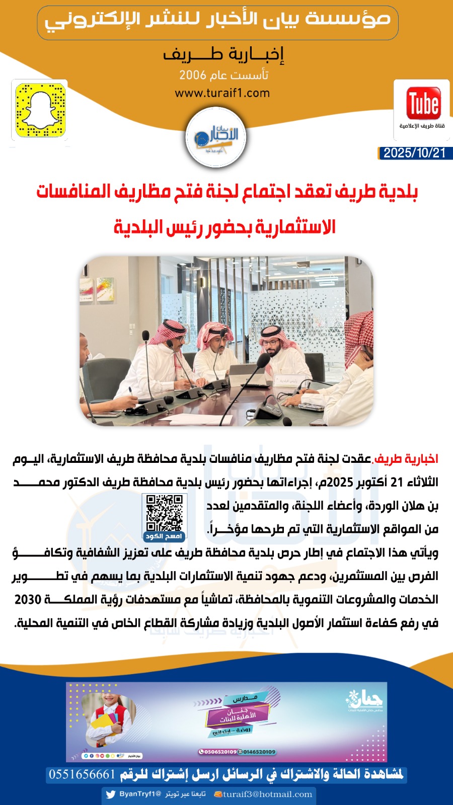 ويأتي هذا الاجتماع في إطار حرص بلدية محافظة طريف على تعزيز الشفافية وتكافؤ الفرص بين المستثمرين، ودعم جهود تنمية الاستثمارات البلدية بما يسهم في تطوير الخدمات والمشروعات التنموية بالمحافظة، تماشياً مع مستهدفات رؤية المملكة 2030 في رفع كفاءة استثمار الأصول البلدية وزيادة مشاركة القطاع الخاص في التنمية المحلية.