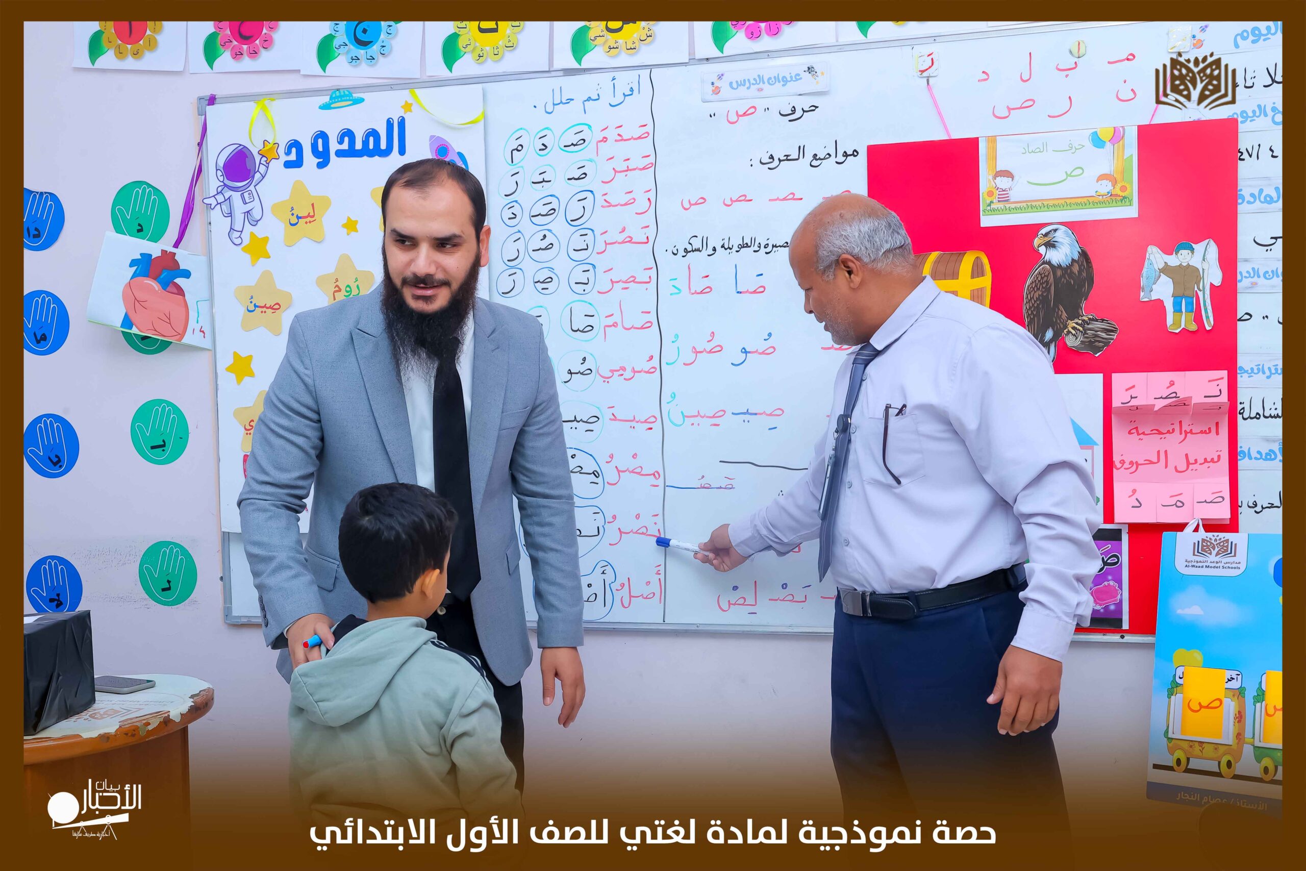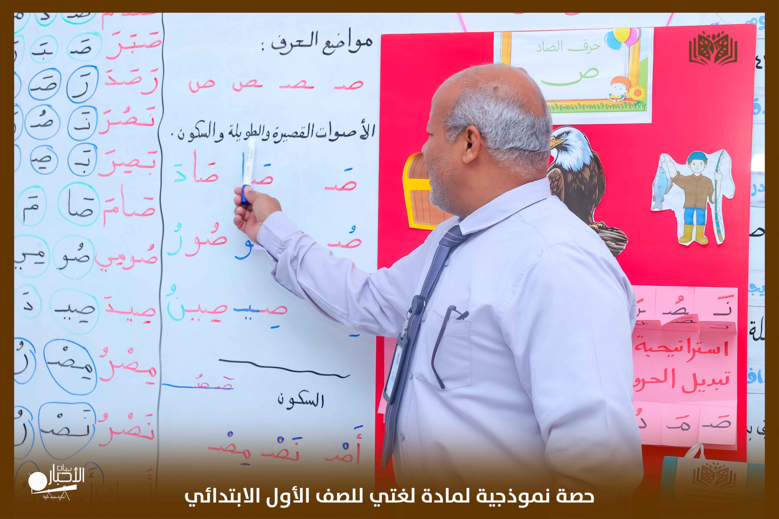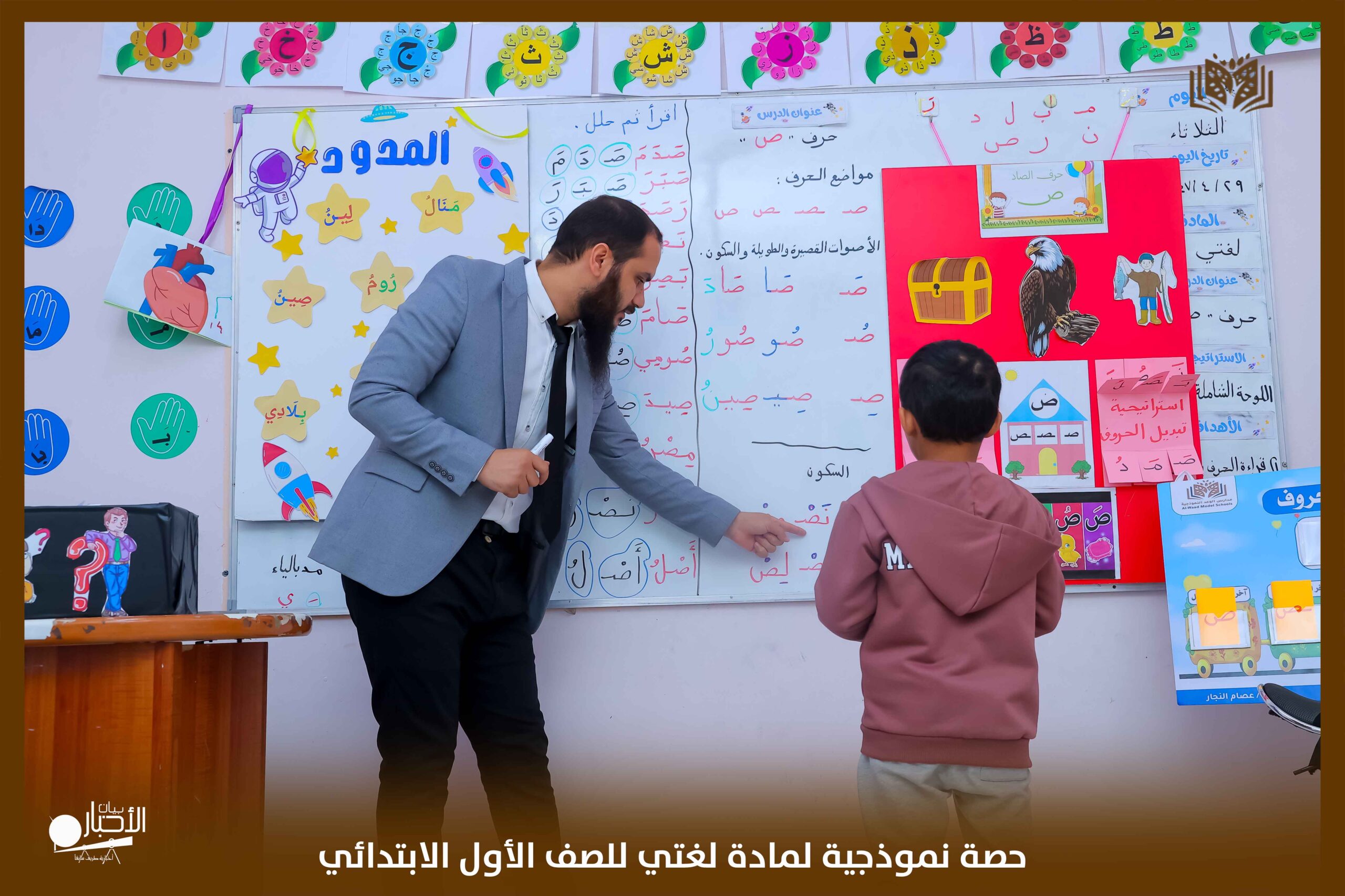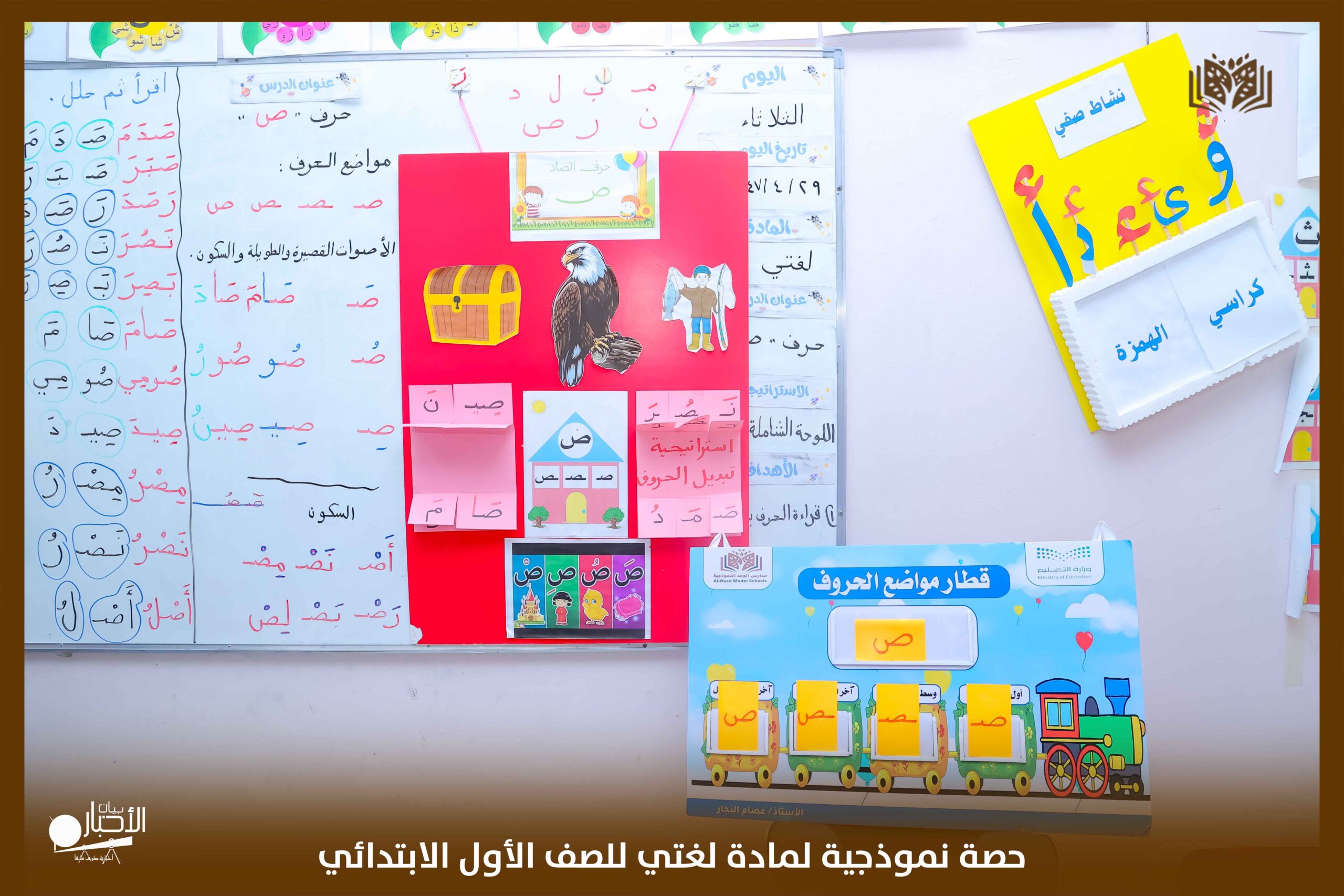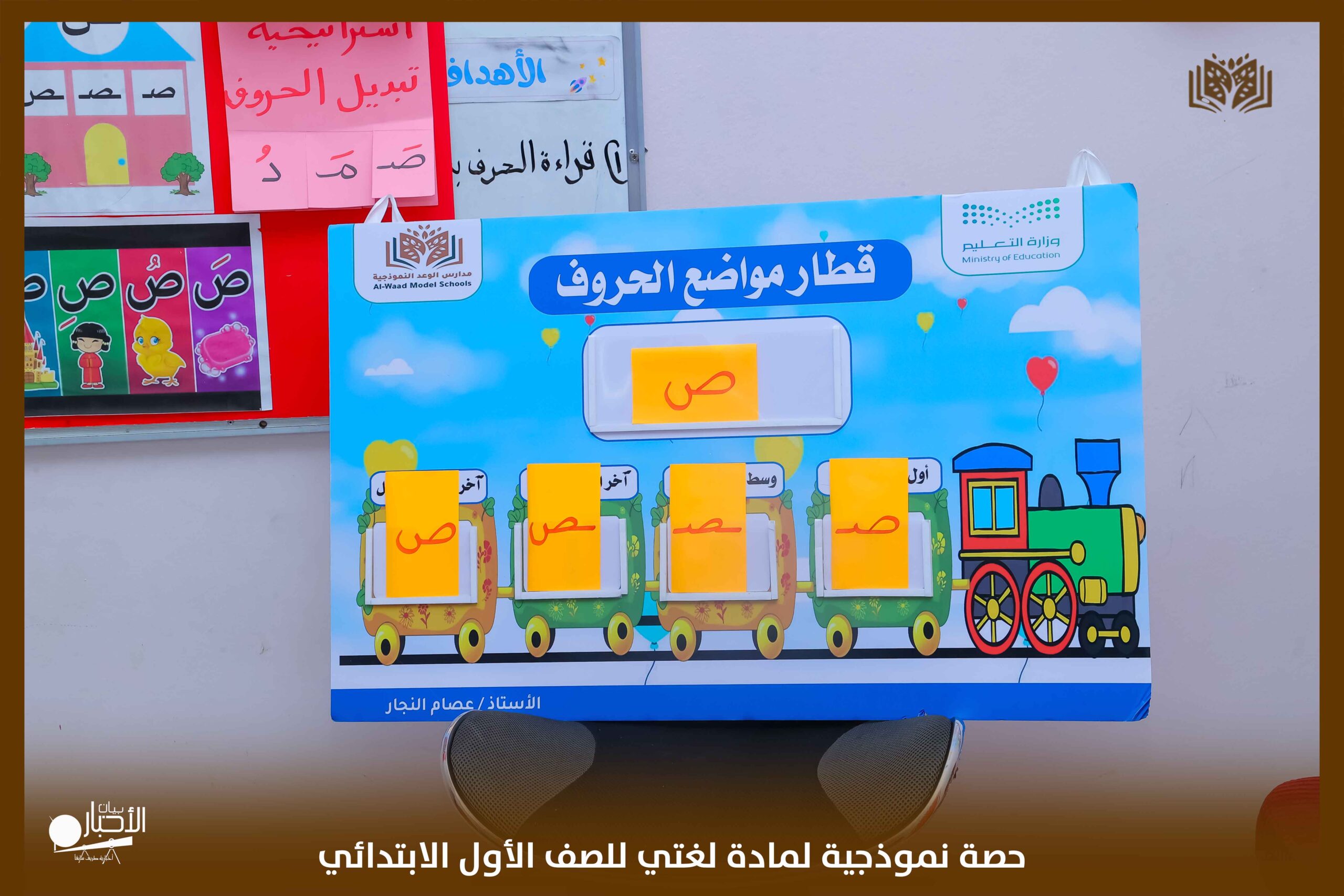 أقامت مدارس الوعد النموذجية حصة نموذجية لمادة لغتي للصف الأول الابتدائي لدرس بعنوان ( حرف الصاد بمهاراته المقررة) حيث استخدم المعلم استراتيجيات التعلم في التدريس ومنها ( التعلم النشط – العصف الذهني – التعلم التعاوني ) حيث تفاعل الطلاب مع المعلم أثناء الدرس تفاعلًا رائعًا وذلك باستخدام وسائل تعليمية متنوعة واللوحات الشاملة ولوحات التعزيز ٠
