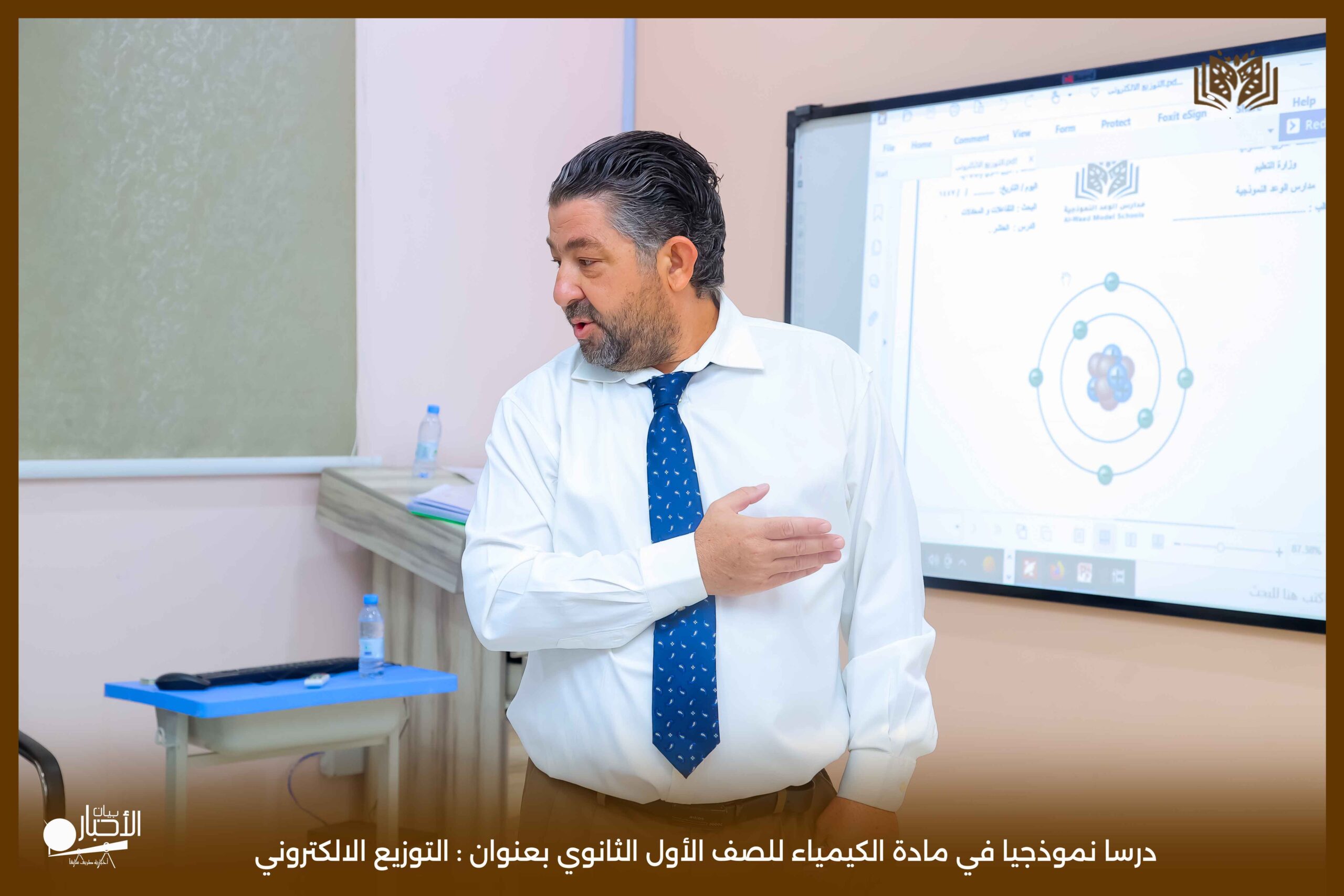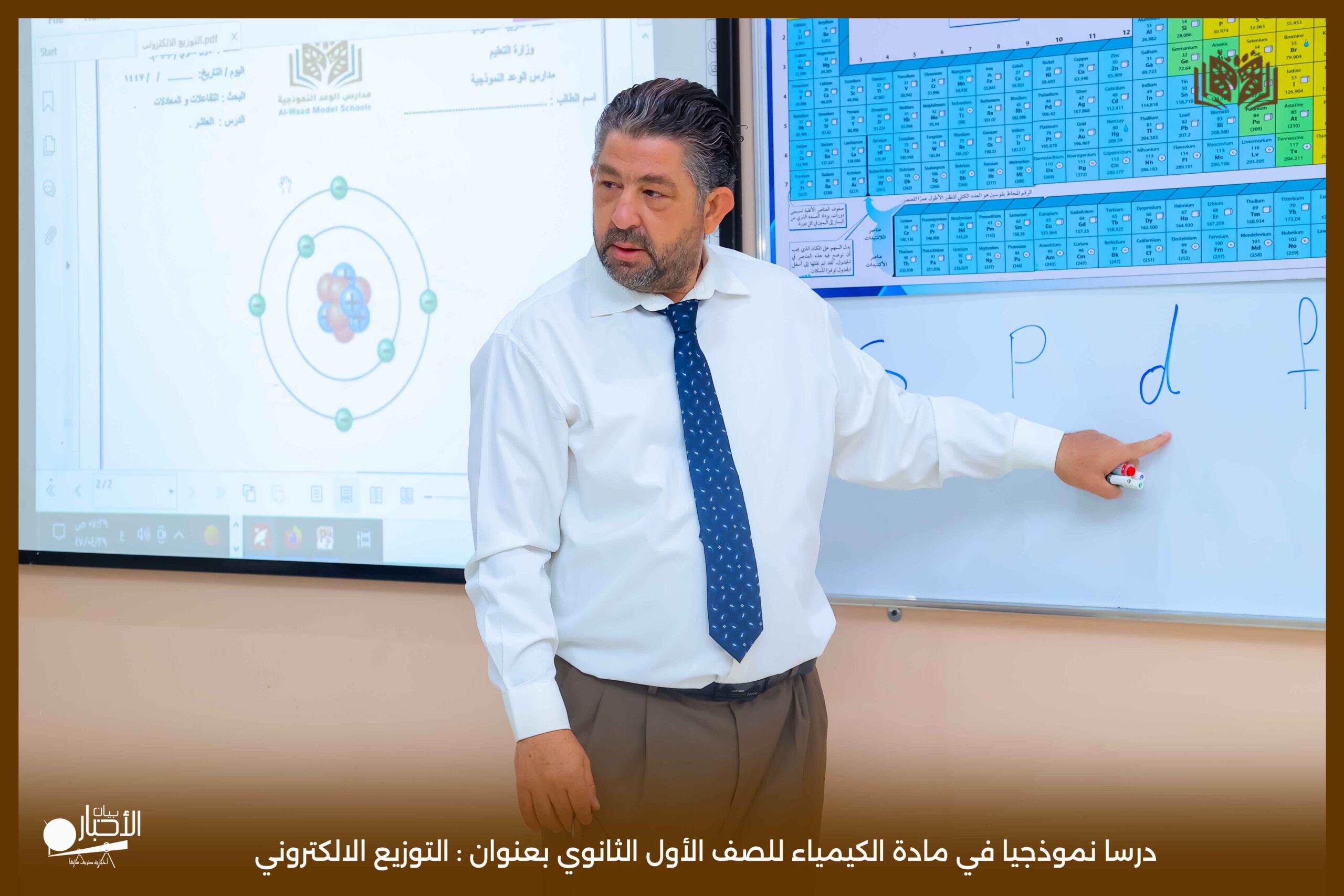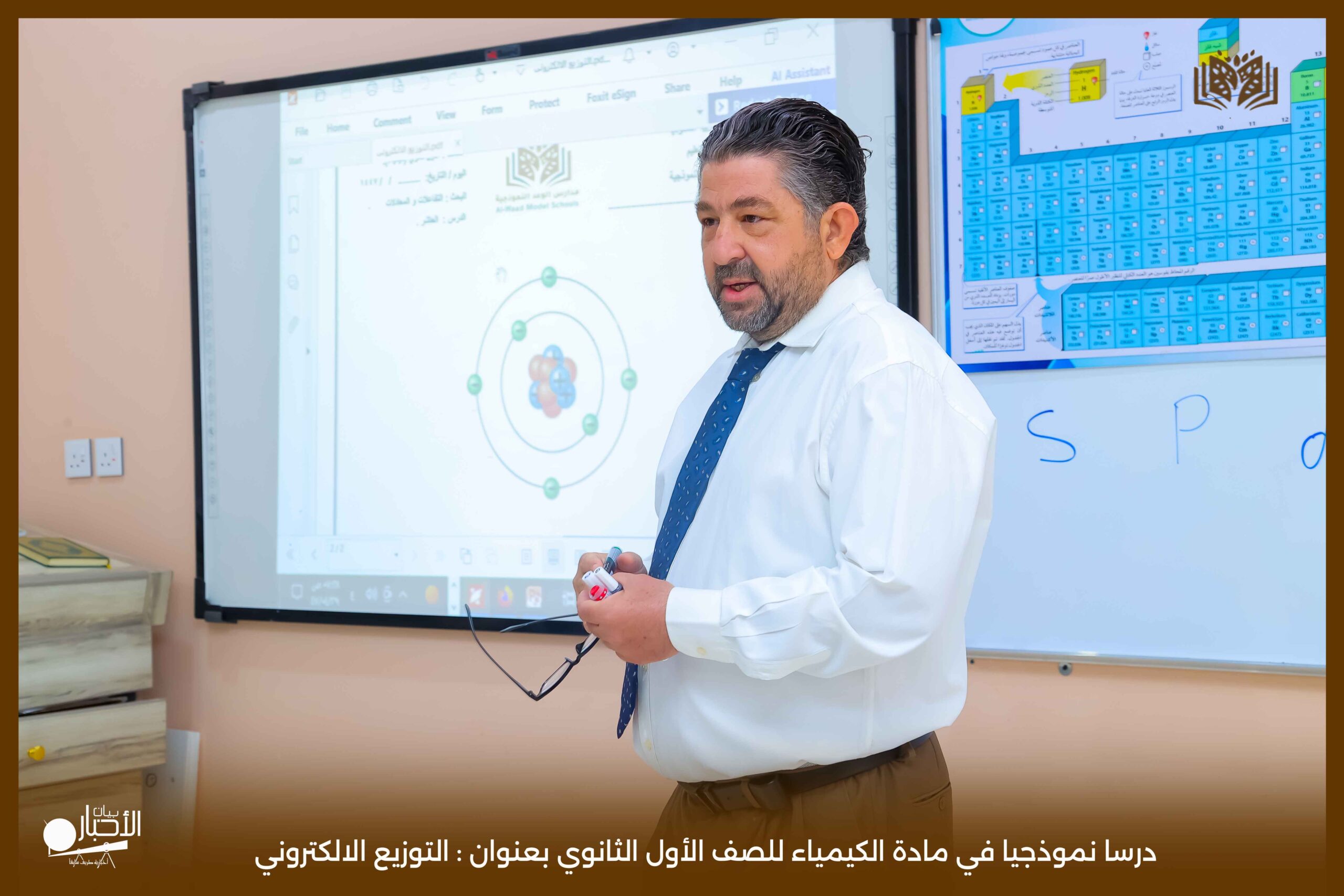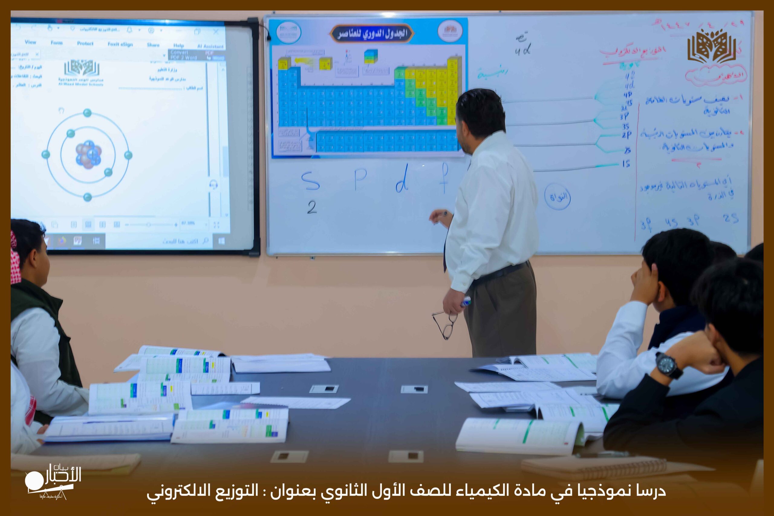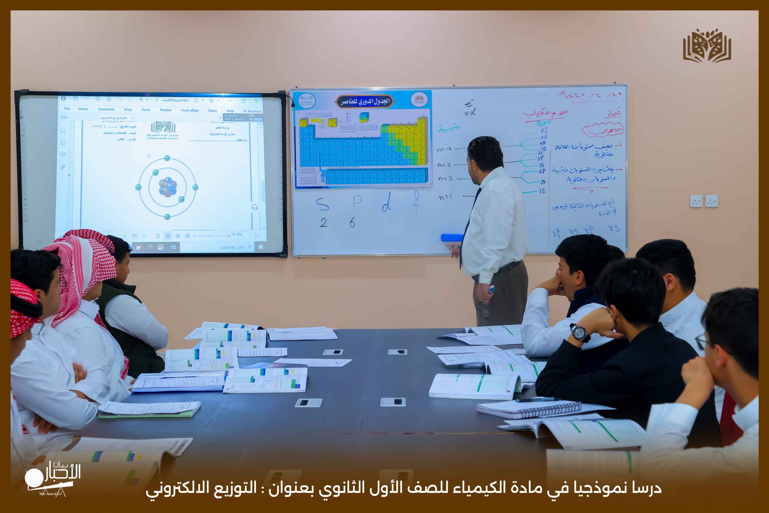 شهدت مدارس الوعد النموذجية في محافظة طريف يوم الثلاثاء ٢٩/٤/١٤٤٧ درسا نموذجيا في مادة الكيمياء للصف الأول الثانوي بعنوان : التوزيع الالكتروني .