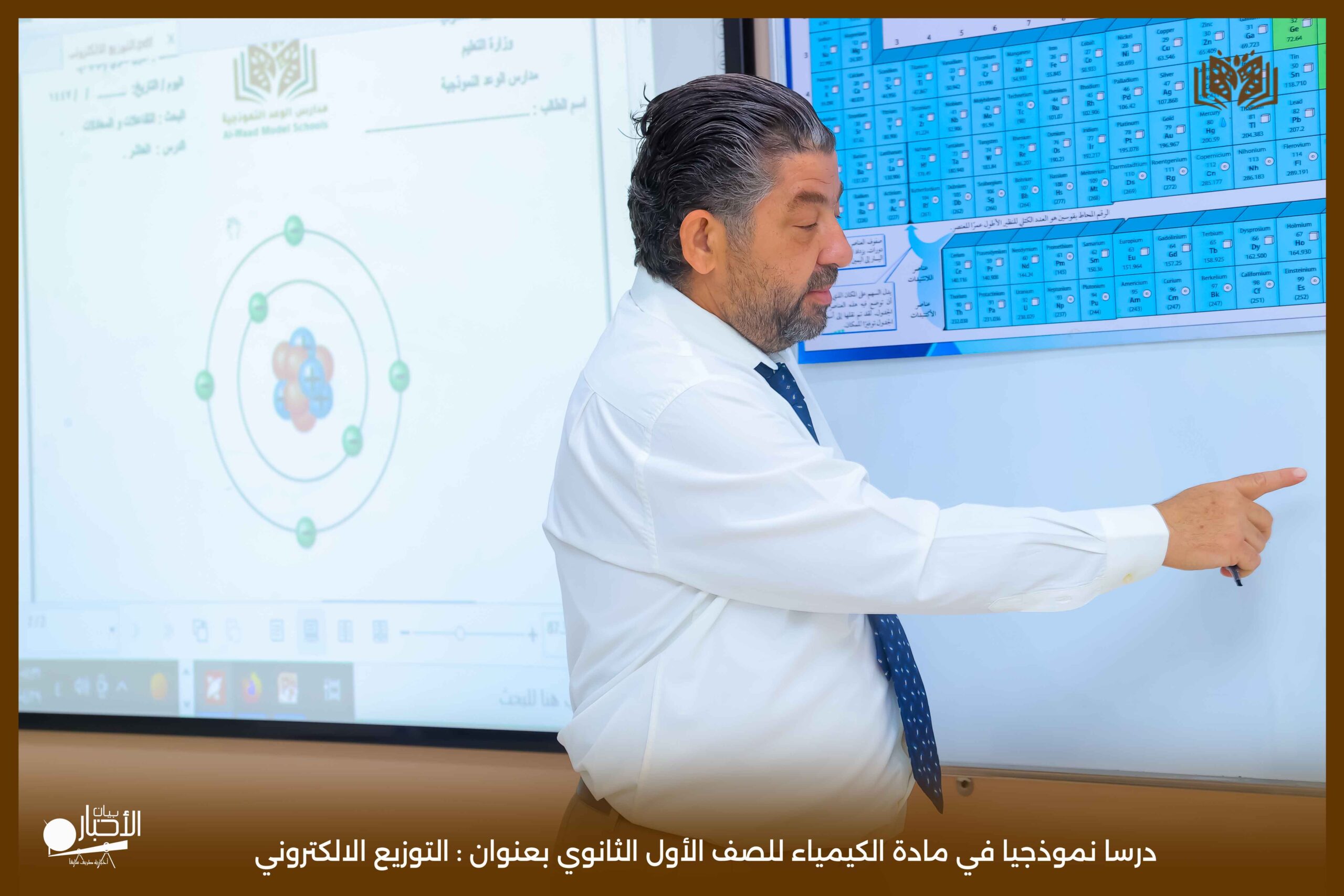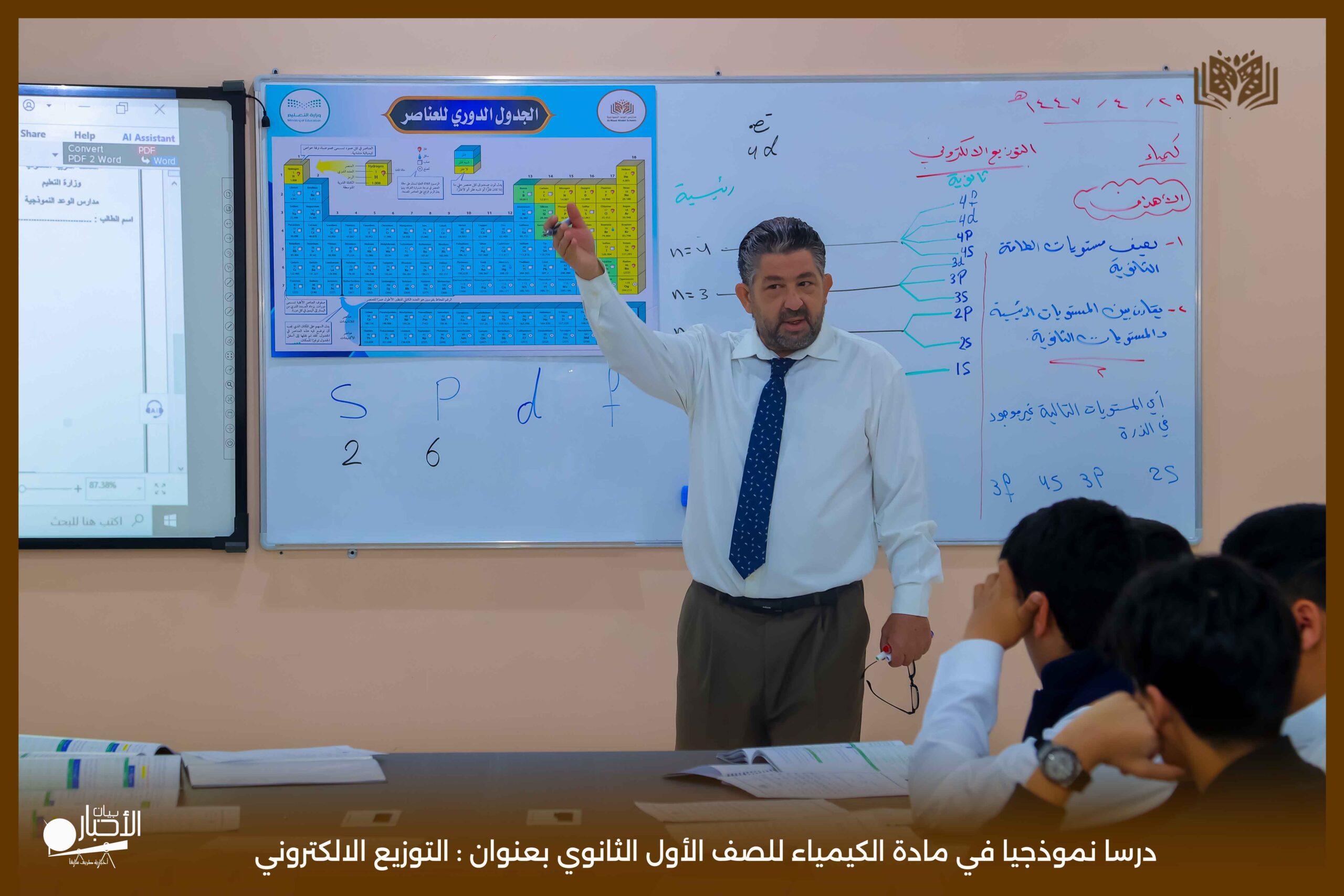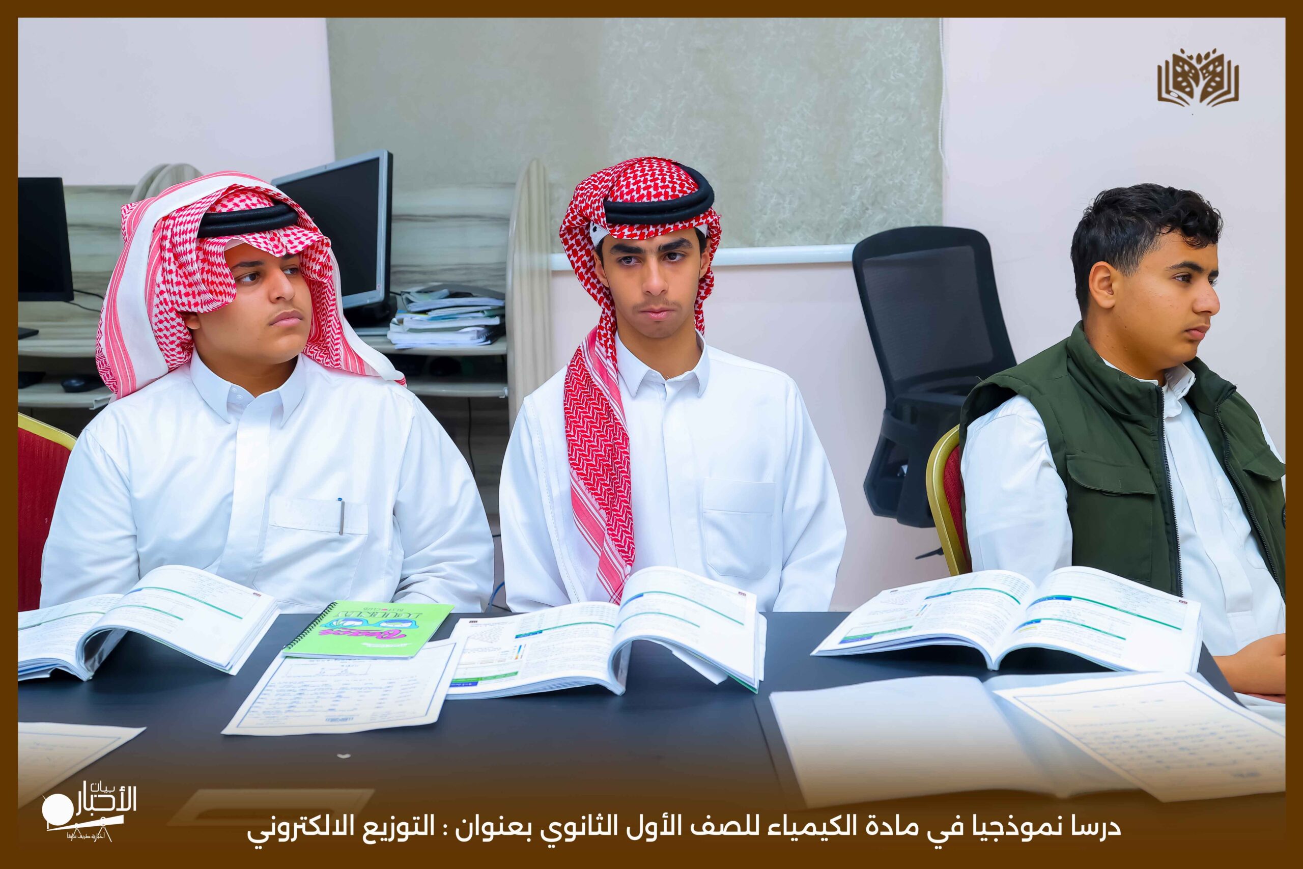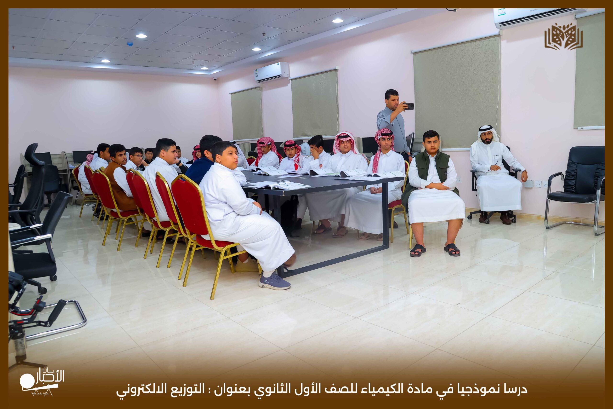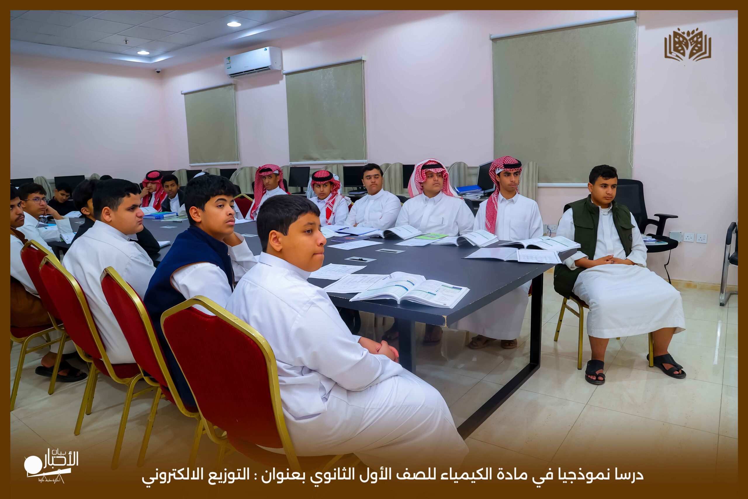 شهدت مدارس الوعد النموذجية في محافظة طريف يوم الثلاثاء ٢٩/٤/١٤٤٧ درسا نموذجيا في مادة الكيمياء للصف الأول الثانوي بعنوان : التوزيع الالكتروني .