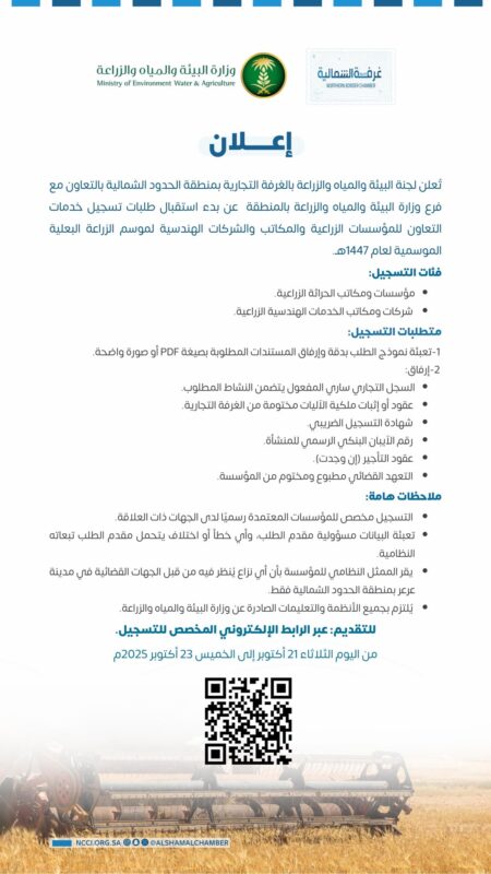 أعلنت لجنة البيئة والمياه والزراعة بالغرفة التجارية بمنطقة الحدود الشمالية، بالتعاون مع فرع وزارة البيئة والمياه والزراعة بالمنطقة، عن بدء استقبال طلبات تسجيل خدمات التعاون للمؤسسات الزراعية والمكاتب والشركات الهندسية الزراعية لموسم الزراعة البعلية لعام 1447هـ.