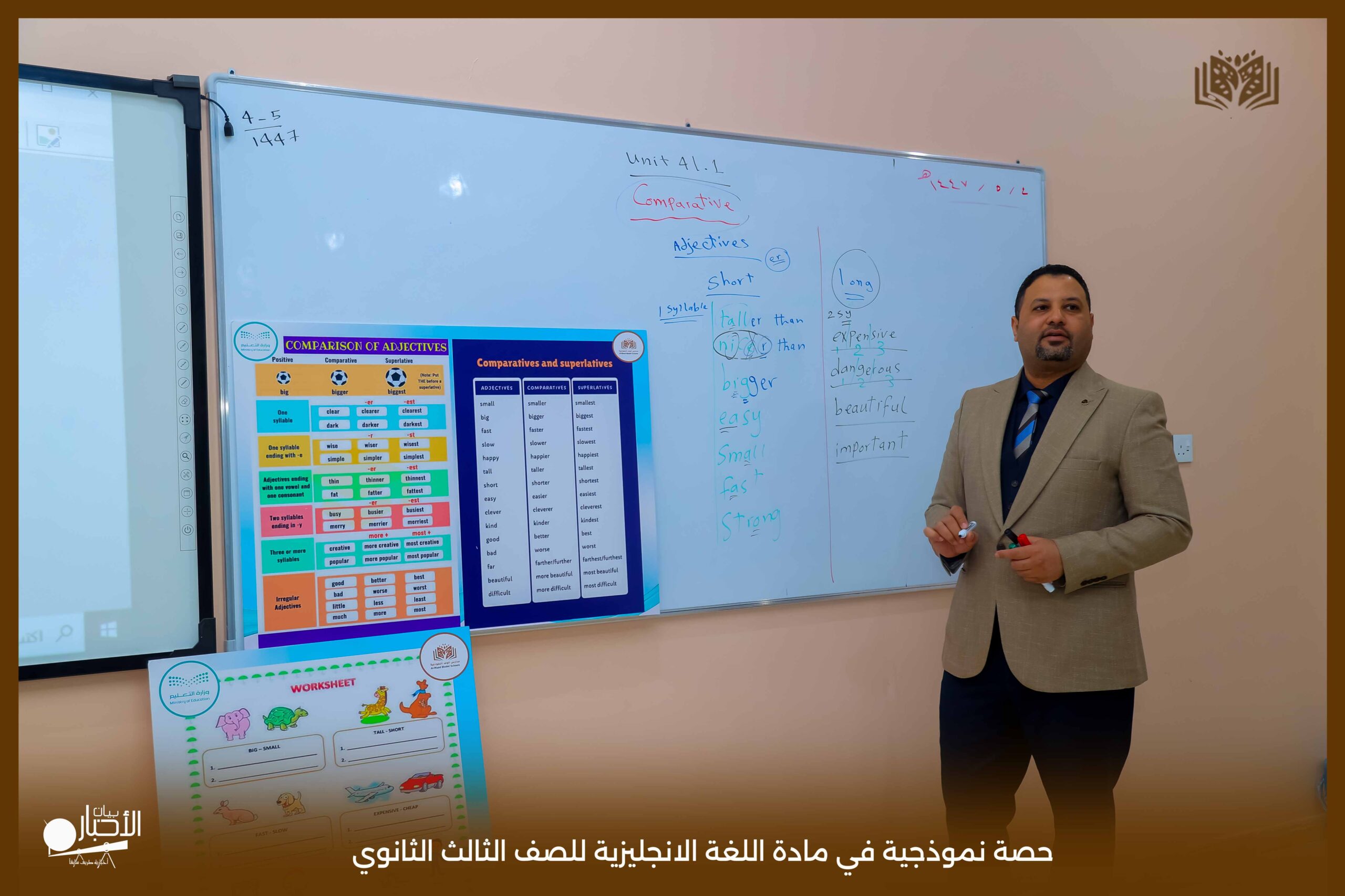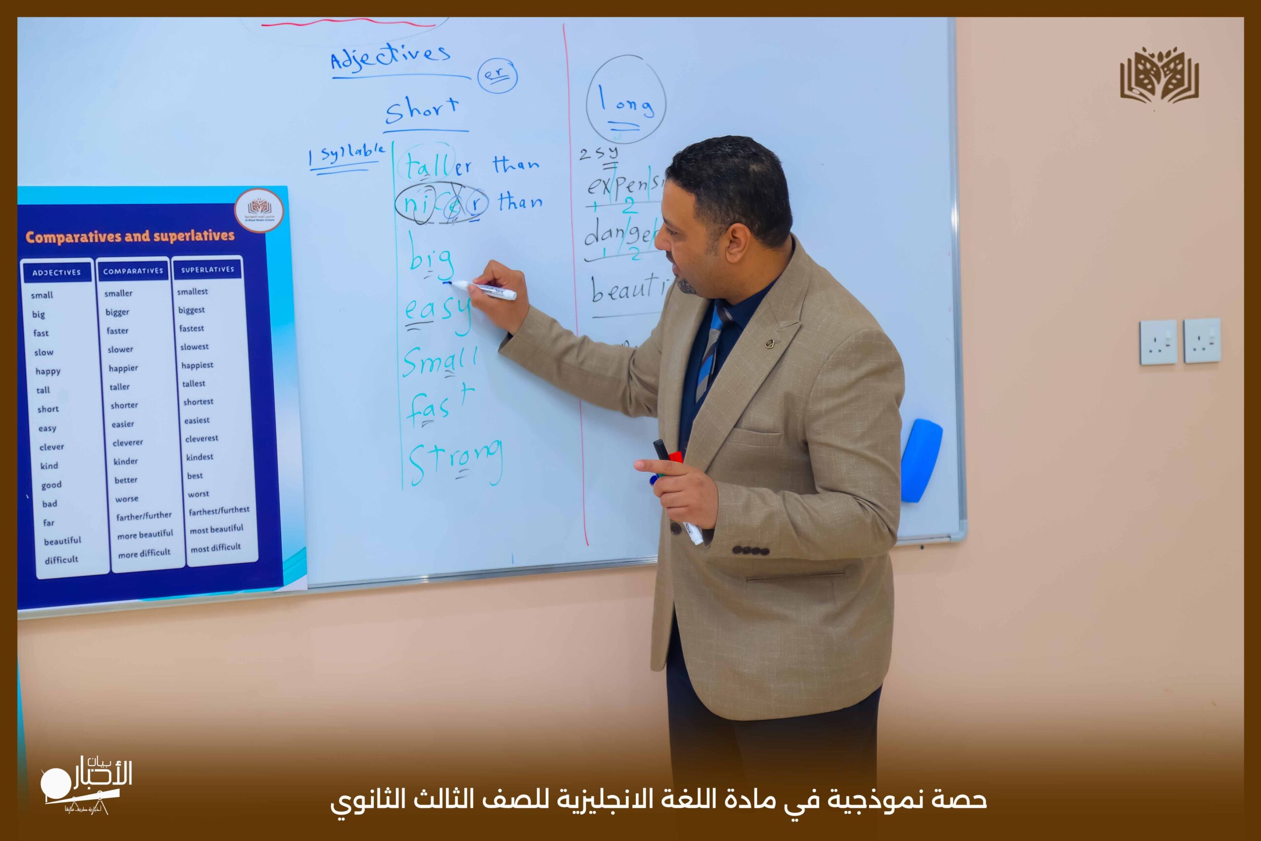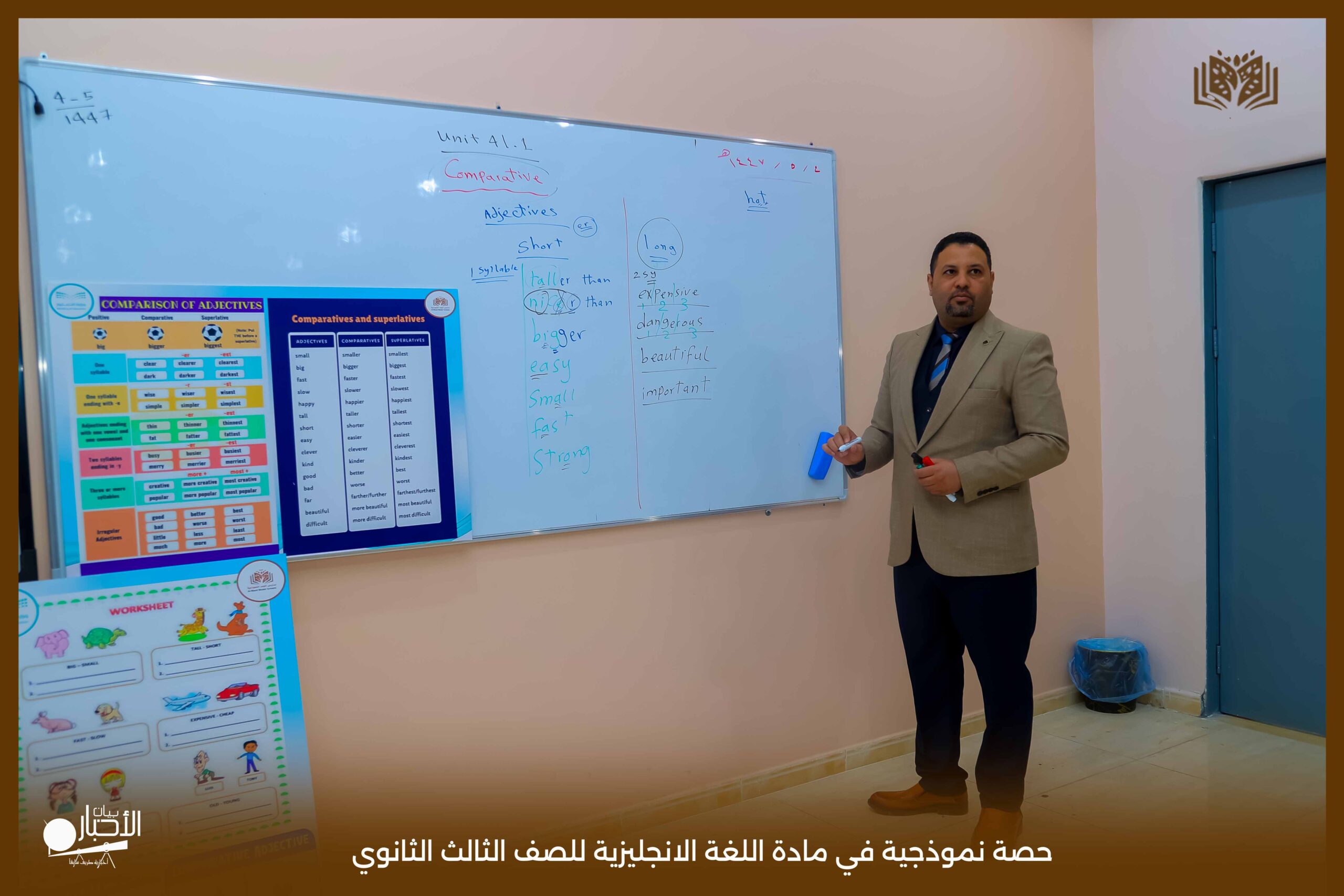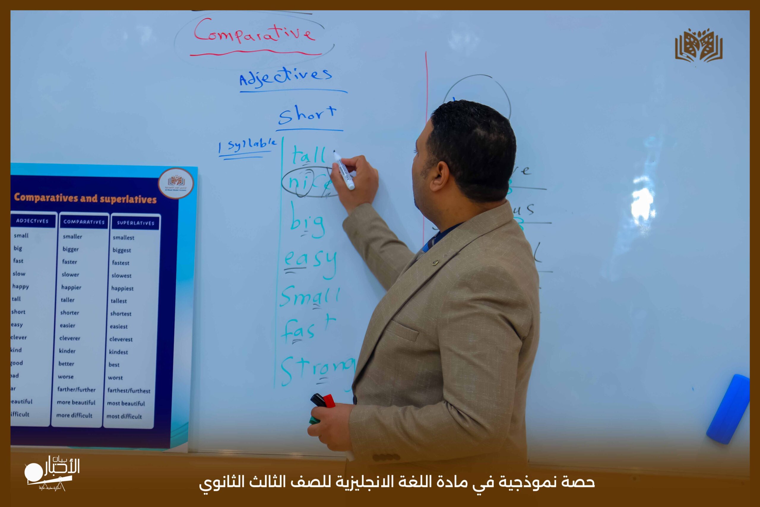 قدمت اليوم مدارس الوعد النموذجية بالقسم الثانوي حصة نموذجية في مادة اللغة الانجليزية للصف الثالث الثانوي درس Comparative and Superlative مستخدما استراتيجية الحوار والمناقشة والعصف الذهني كما تم استخدام الوسائل التعليمية اللازمة لذلك لتسهيل و تبسيط المعلومة للطلاب .
