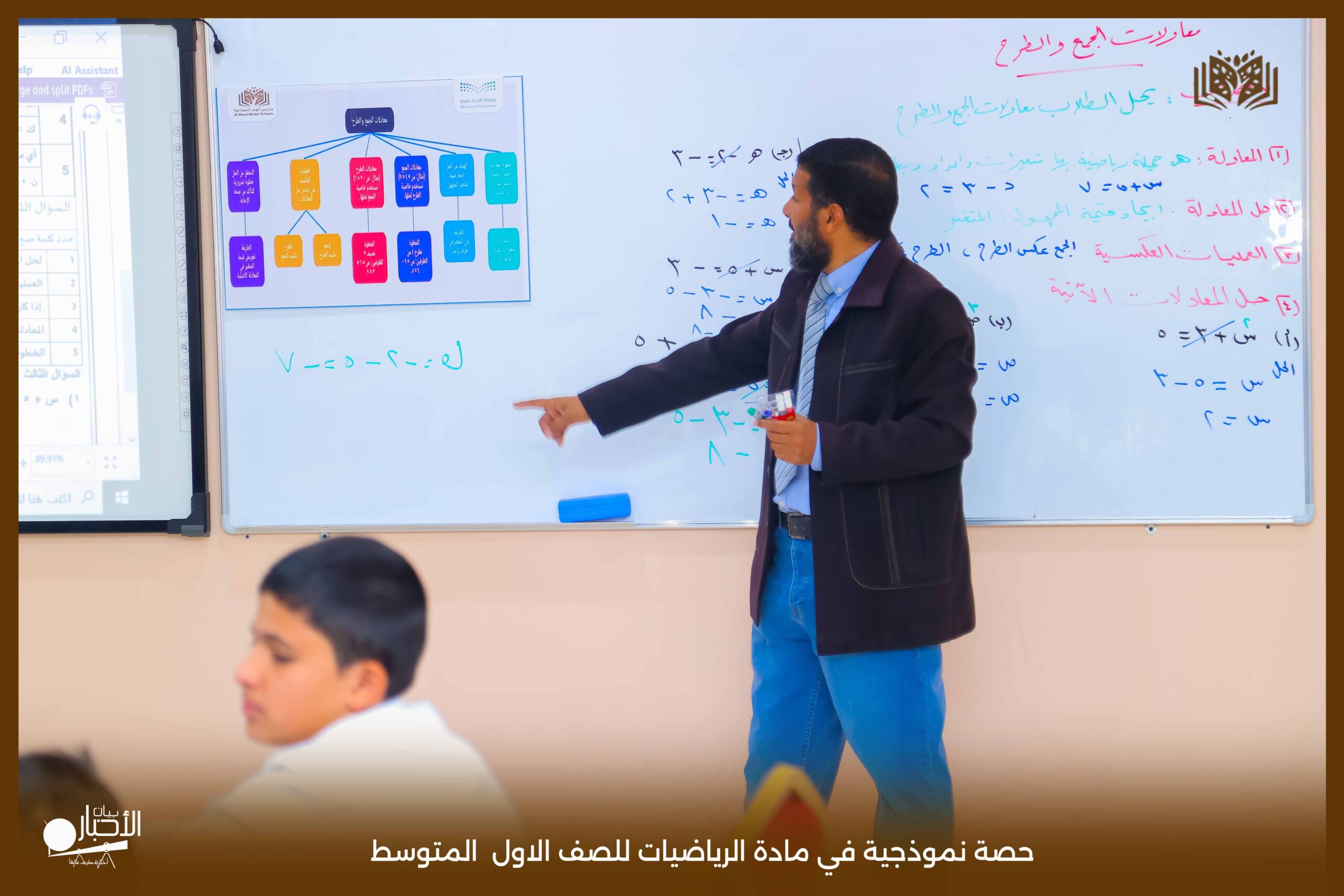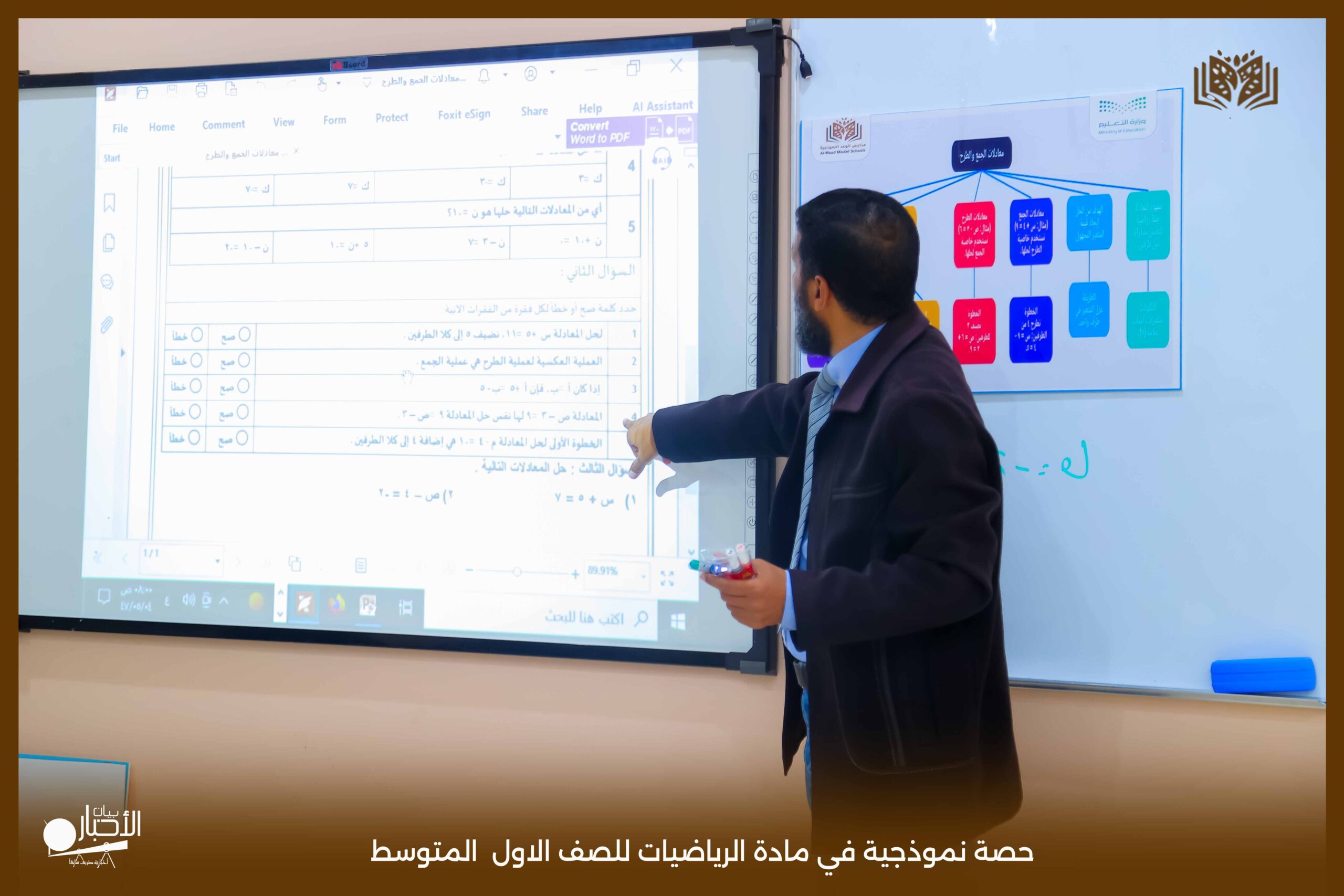 قدمت اليوم مدارس الوعد النموذجية بالقسم المتوسط والثانوي حصة نموذجية في مادة الرياضيات للصف الاول المتوسط كانت بعنوان معادلات الجمع والطرح واستخدم المعلم استراتيجيات التعلم النشط اثناء الحصه كما استخدم الوسائل التعليمية اللازمة لتوصيل المعلومة إلى الطلاب .