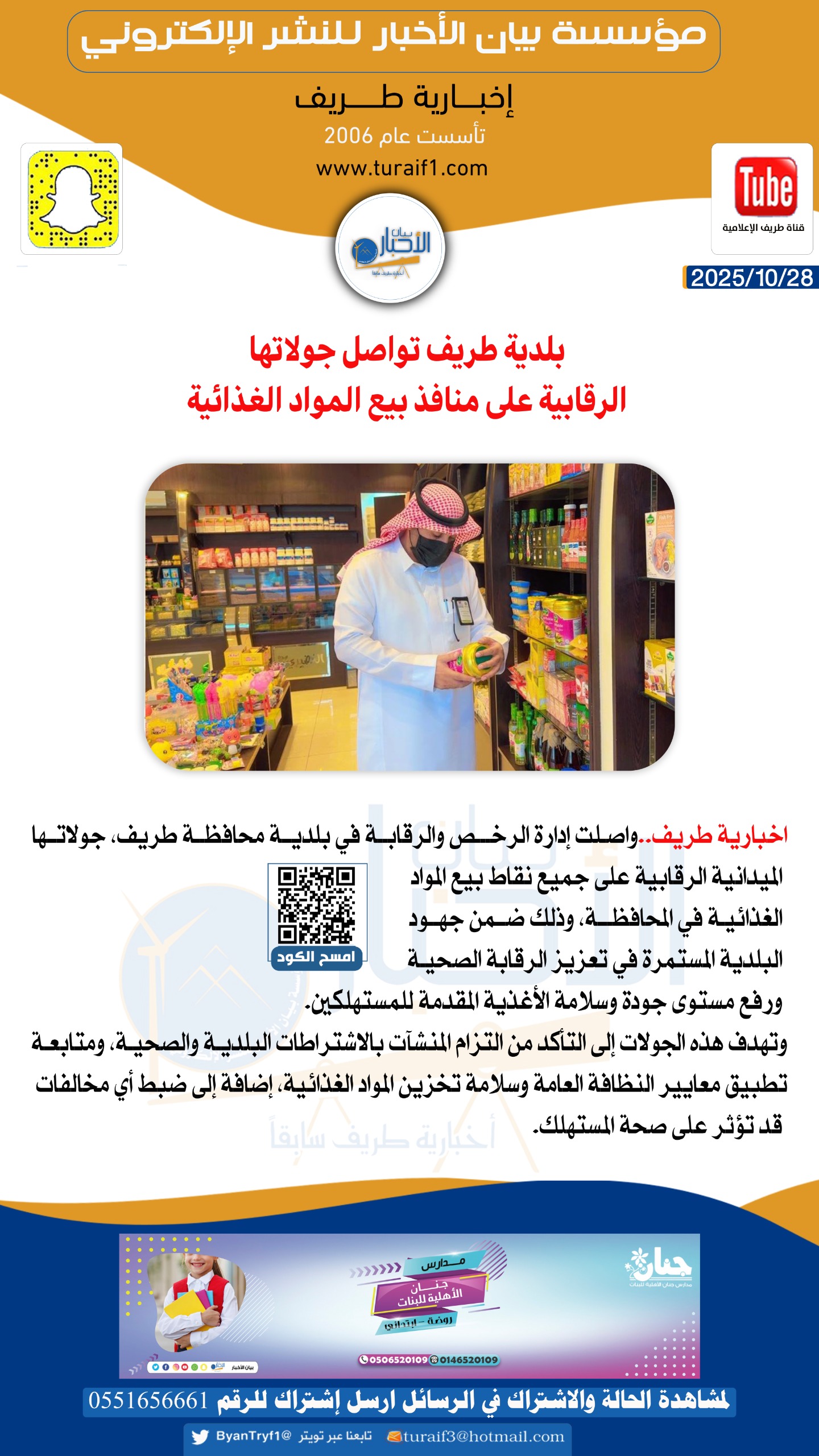 واصلت إدارة الرخص والرقابة في بلدية محافظة طريف، جولاتها الميدانية الرقابية على جميع نقاط بيع المواد الغذائية في المحافظة، وذلك ضمن جهود البلدية المستمرة في تعزيز الرقابة الصحية ورفع مستوى جودة وسلامة الأغذية المقدمة للمستهلكين.