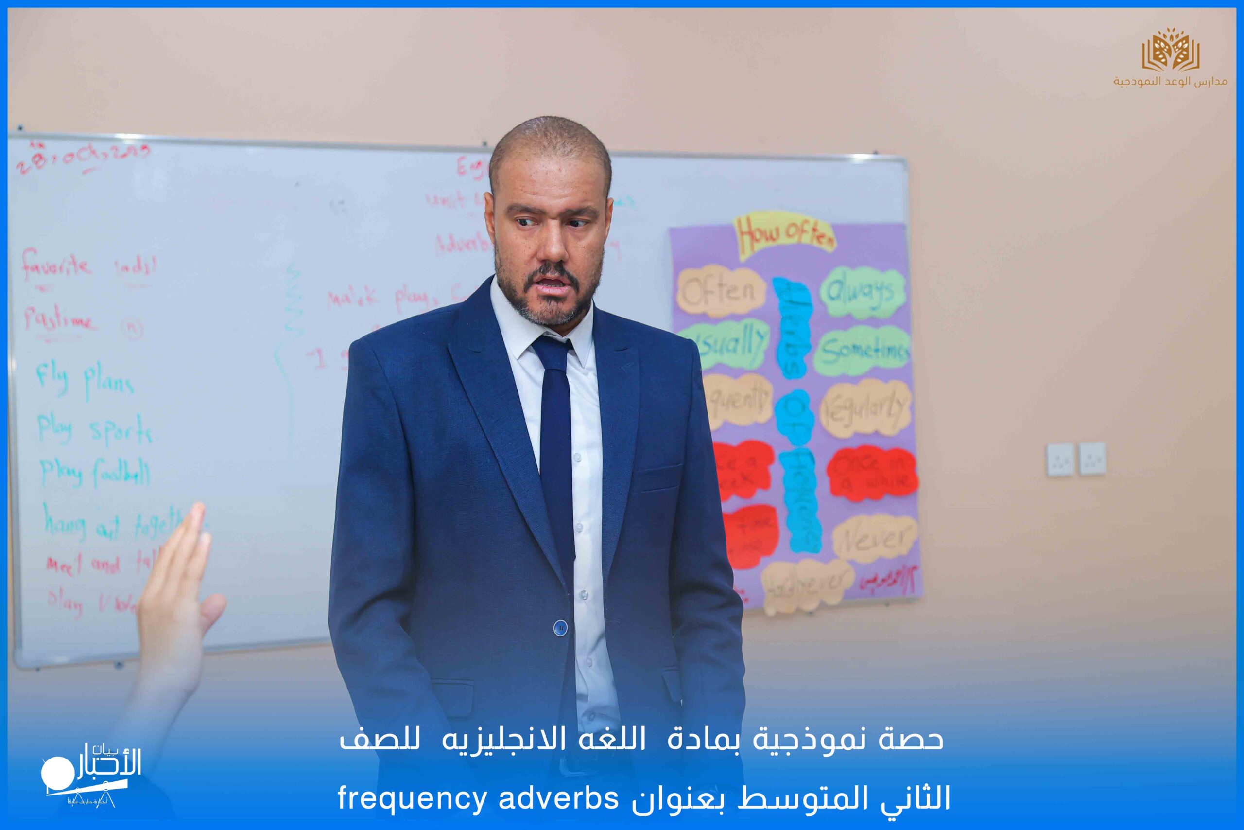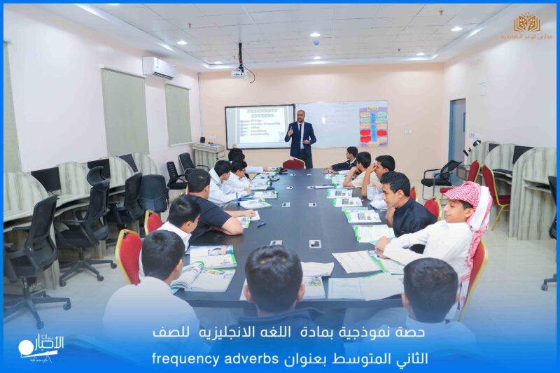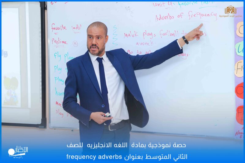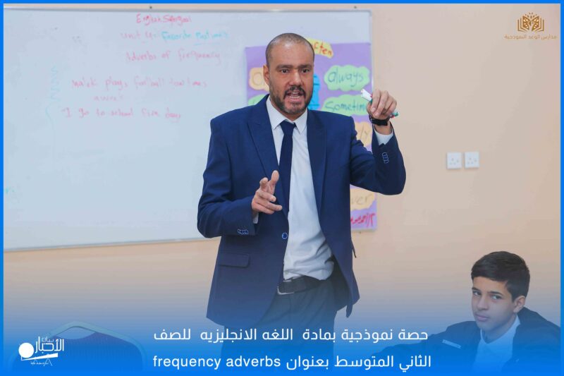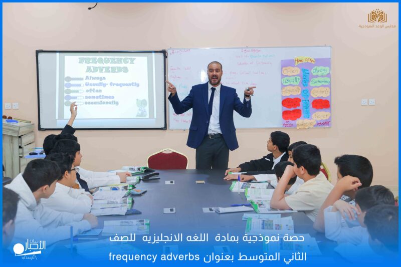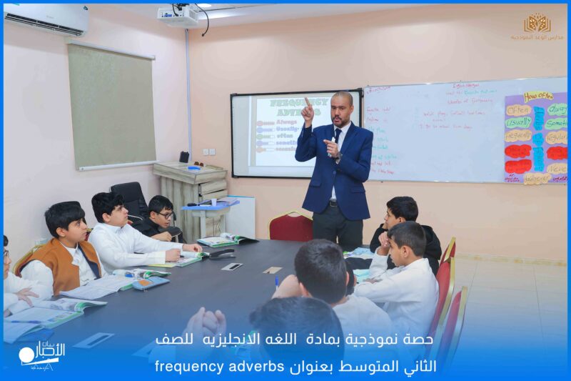 أقامت اليوم الأحد مدارس الوعد النموذجية حصة نموذجية بمادة اللغه الإنجليزية للصف الثاني المتوسط بعنوان frequency adverbs عرض المعلم محاورالدرس باستخدام استراتيجيات التعلم النشط من عصف ذهني والنمذجة كما استخدم شاشة العرض وعرض الدرس بوربونت ووسيلة تعليمية وبطاقات تخدم الدرس وورقة عمل مما ساعد الطلاب على فهمه واتقانه.