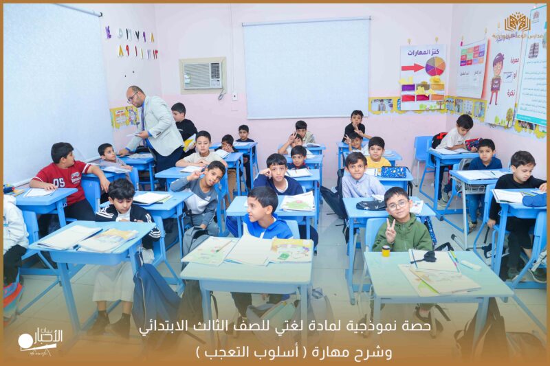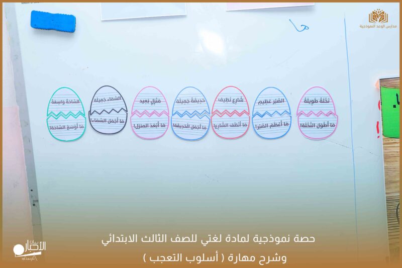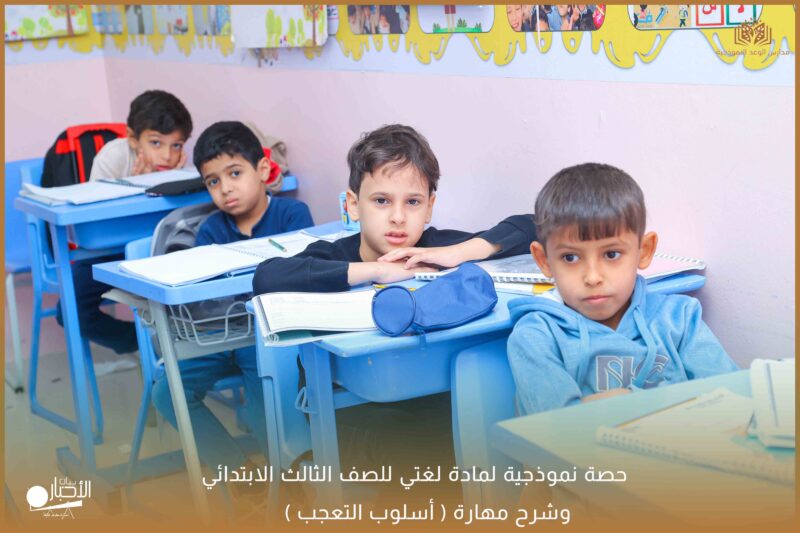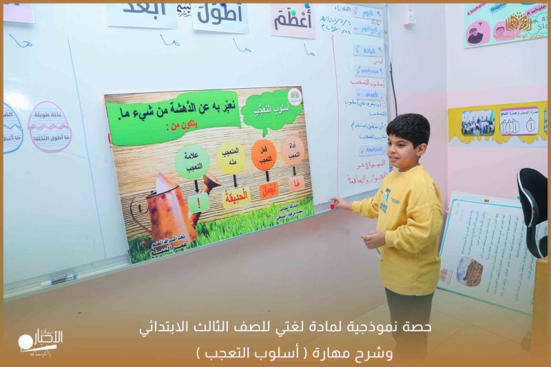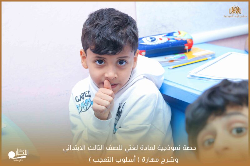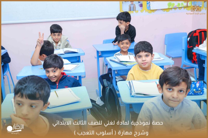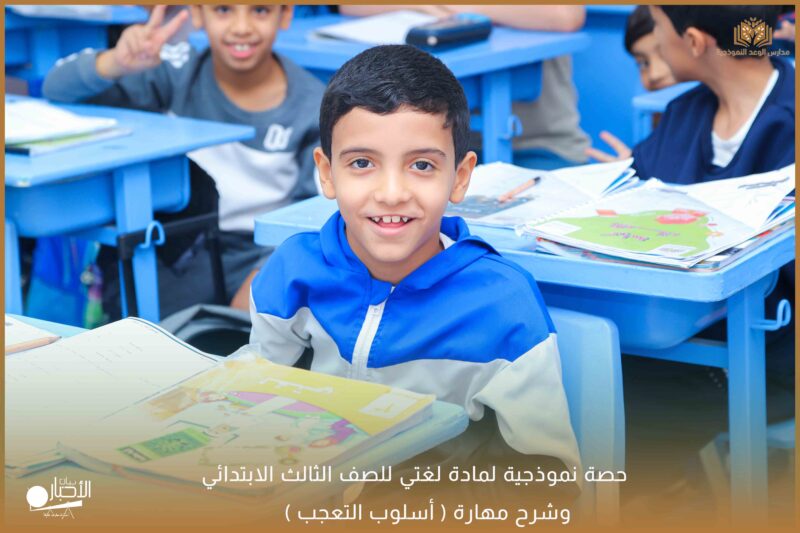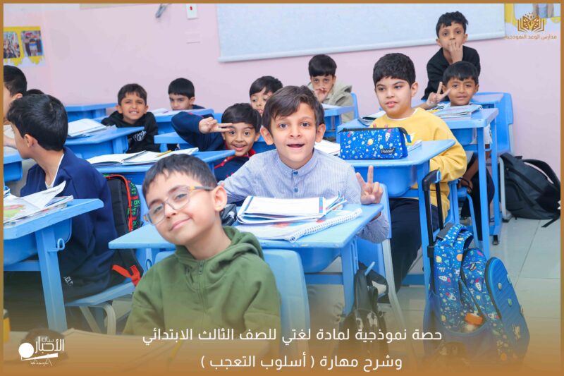 أقامت مدارس الوعد النموذجية حصة نموذجية لمادة لغتي للصف الثالث الابتدائي وشرح مهارة ( أسلوب التعجب ) حيث استخدم المعلم استراتيجيات التعلم في التدريس ومنها ( التعلم النشط – العصف الذهني – التعلم التعاوني ) حيث تفاعل الطلاب مع المعلم أثناء الدرس تفاعلًا رائعًا وذلك باستخدام وسائل تعليمية متنوعة واللوحات الشاملة ولوحات التعزيز ٠